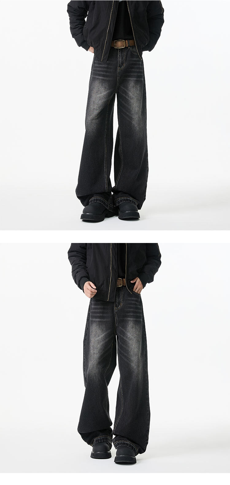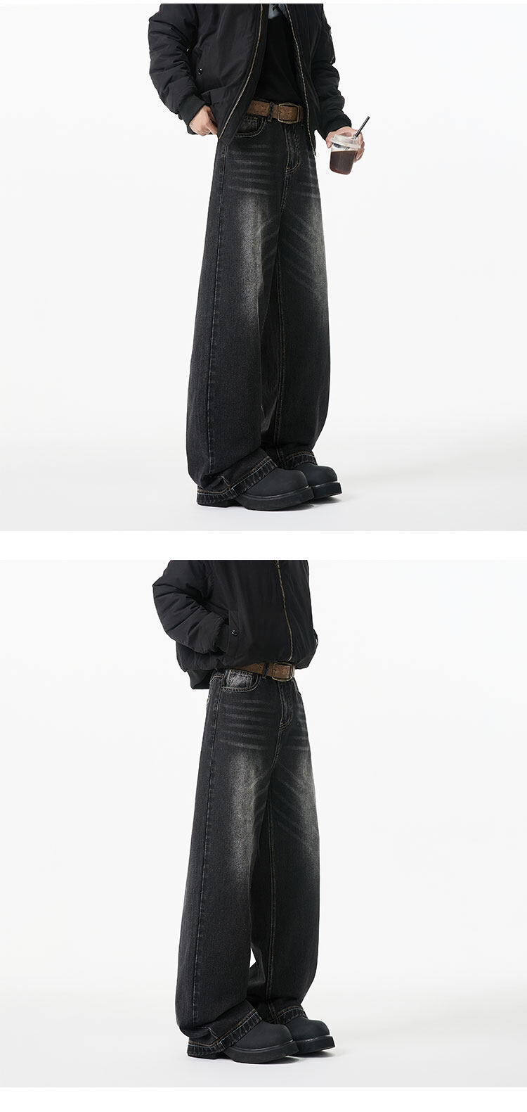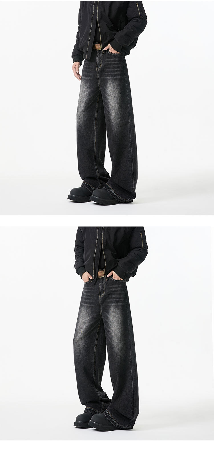 American-Style Whiskered Washed Vintage Jeans for Men, Loose Fit, Retro Design, Cleanfit Straight-Leg Wide-Leg Long Pants