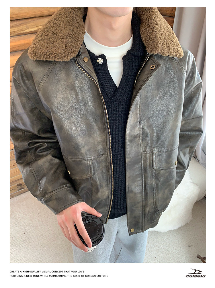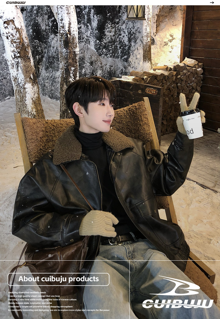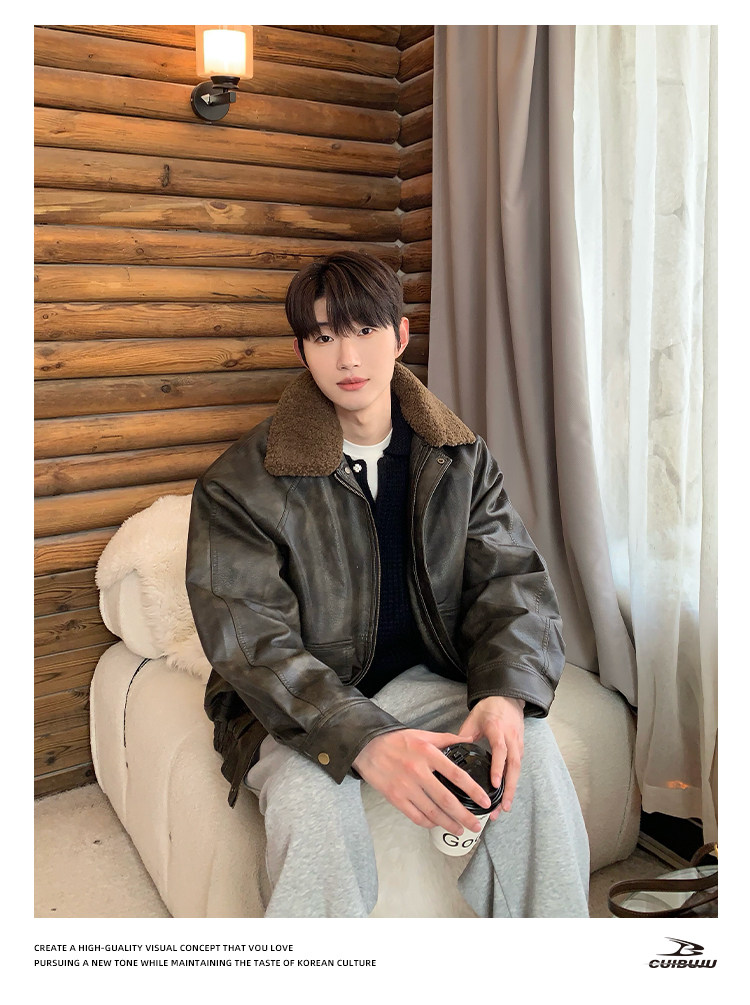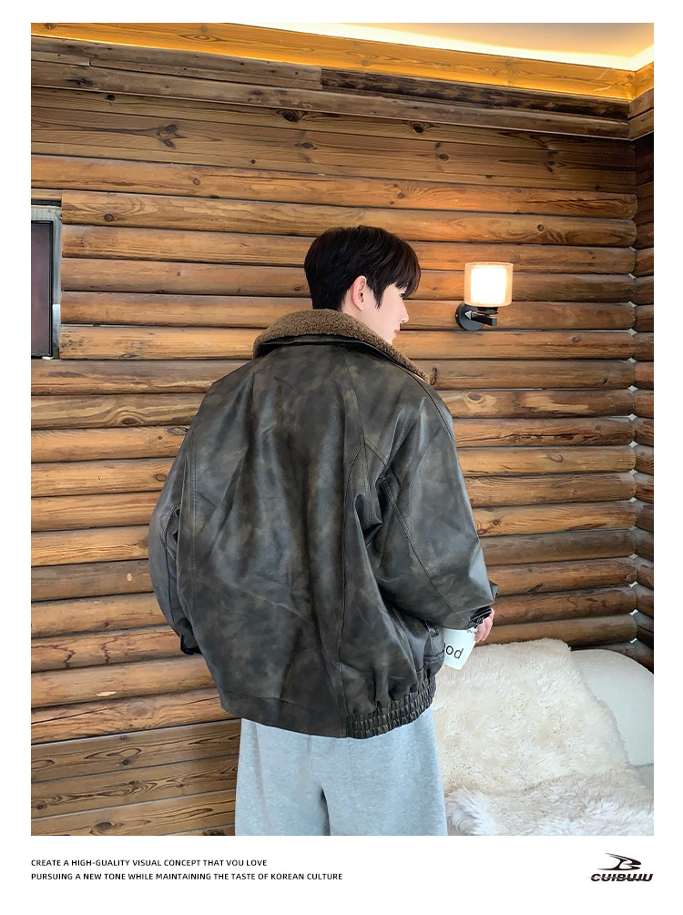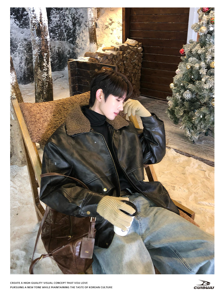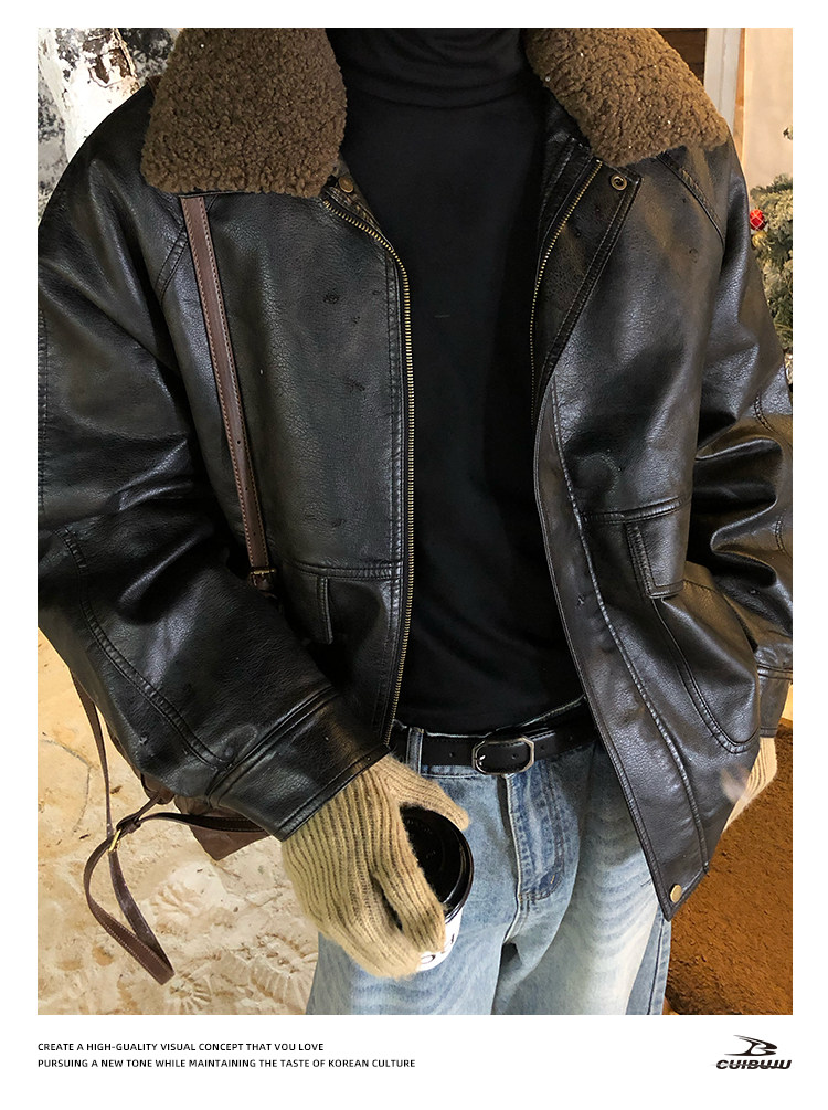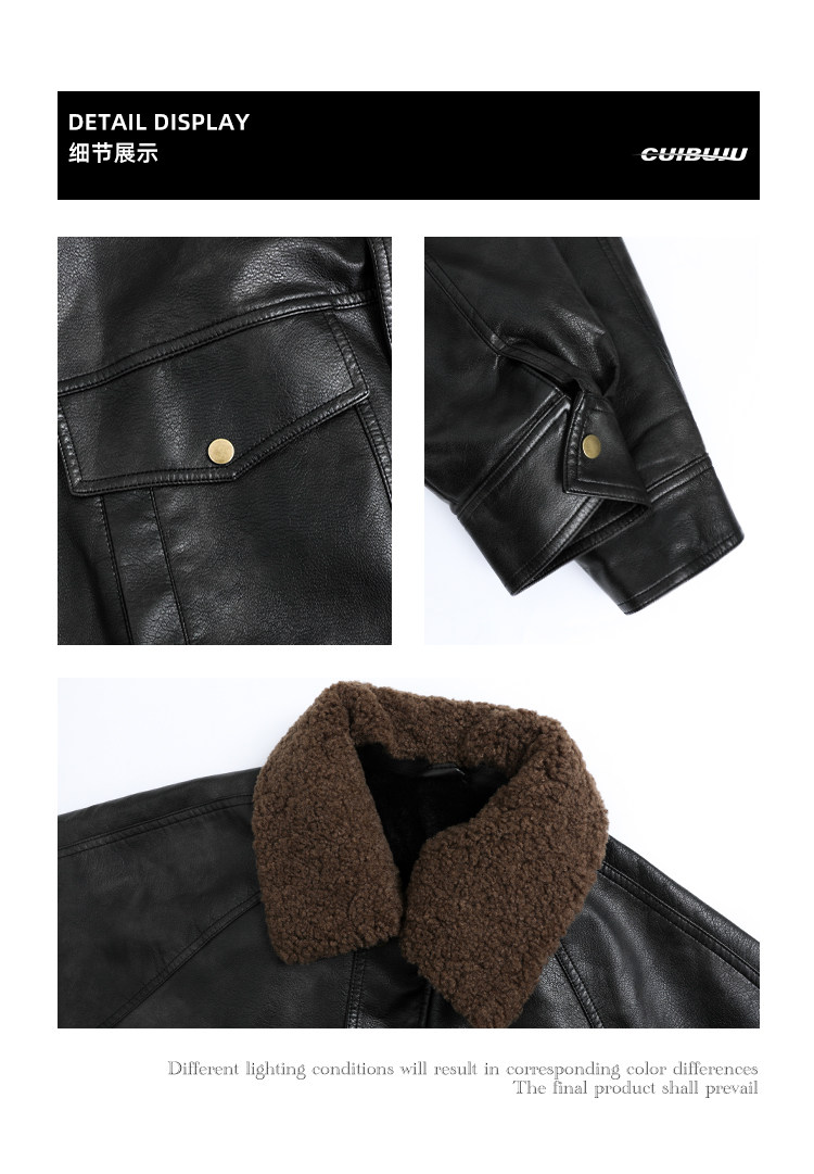 Cuibuju Retro Old Money Style Lamb Wool Lapel Patchwork Fleece-Lined Leather Jacket High-End Fashion Coat