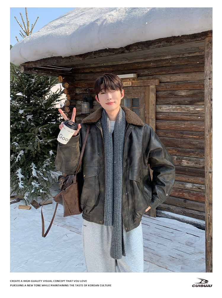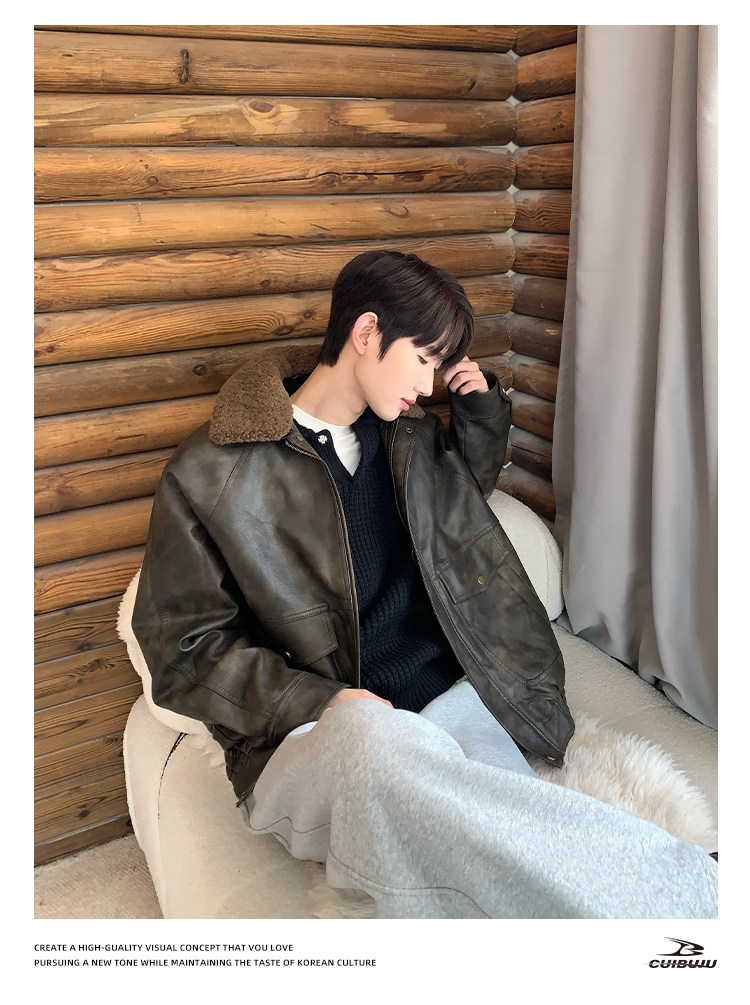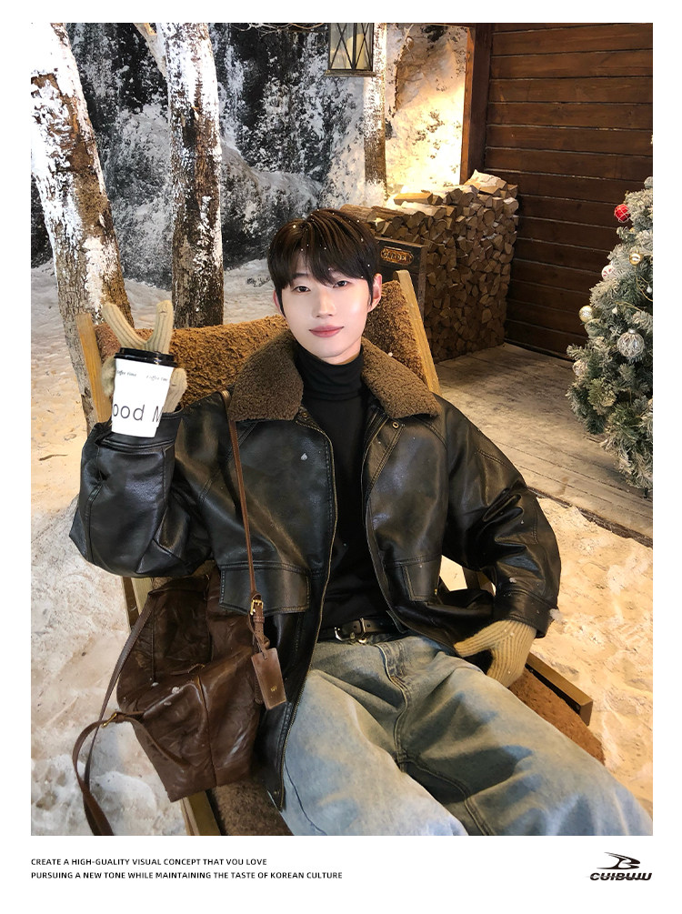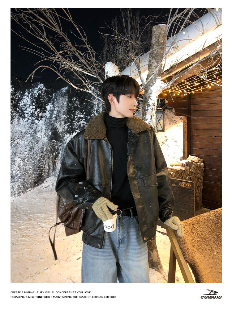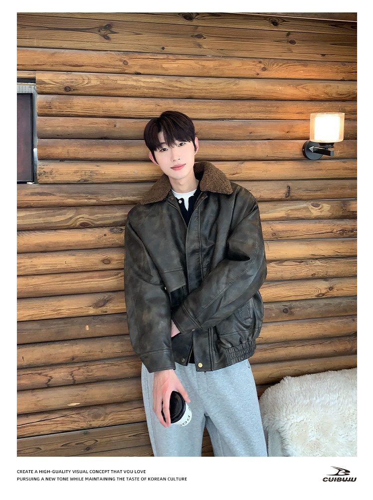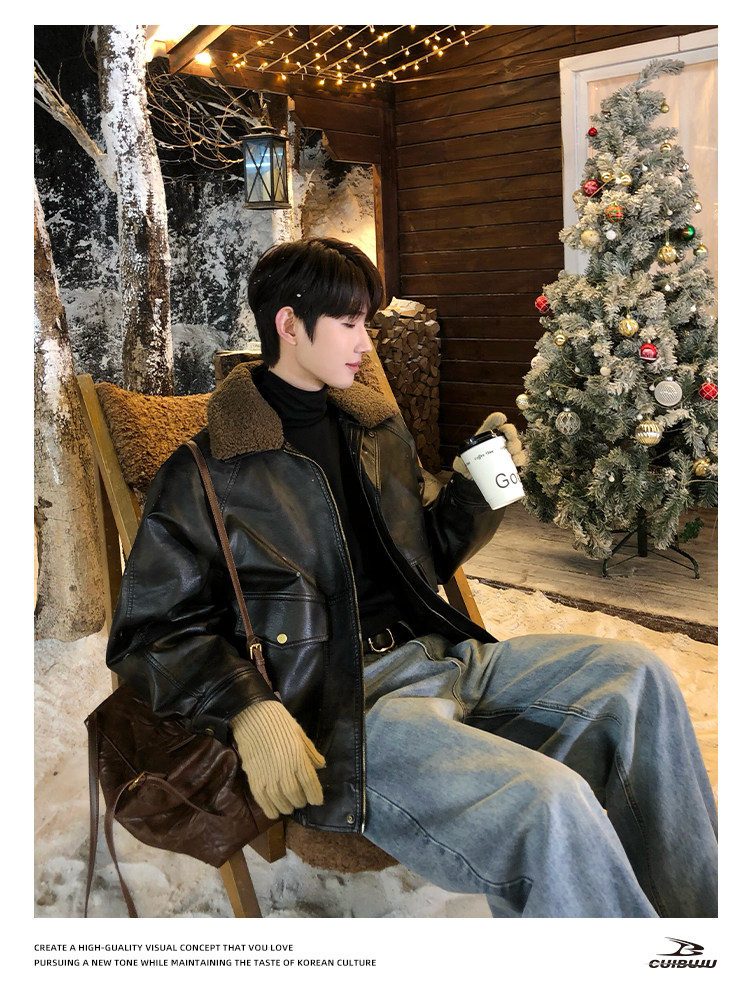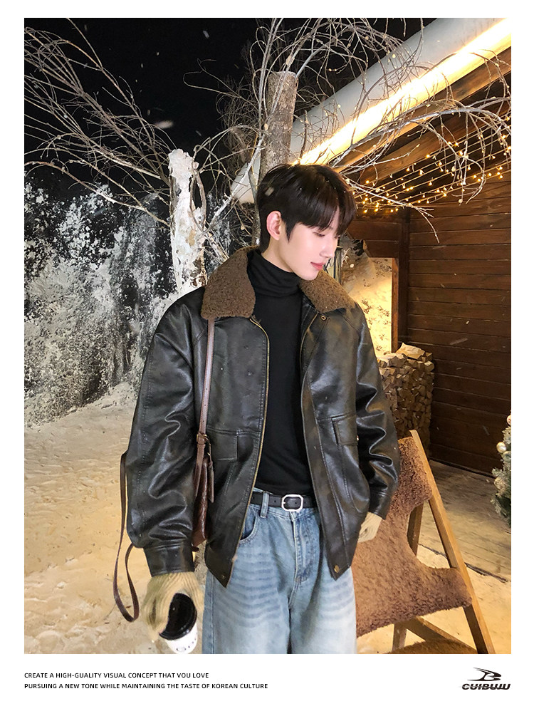 Cuibuju Retro Old Money Style Lamb Wool Lapel Patchwork Fleece-Lined Leather Jacket High-End Fashion Coat