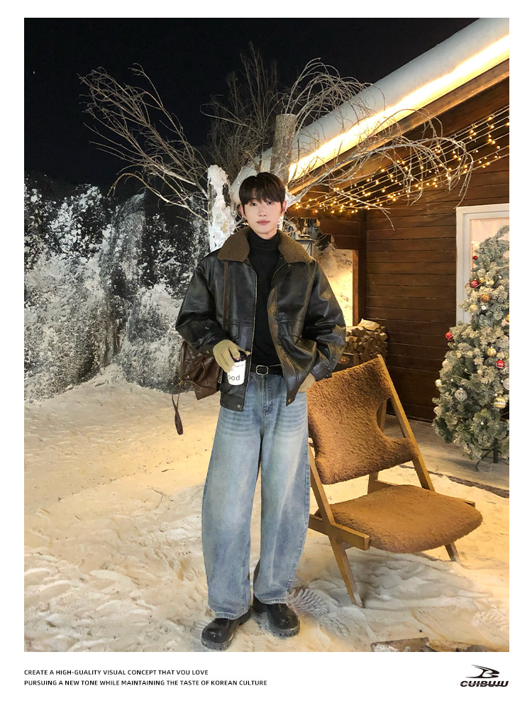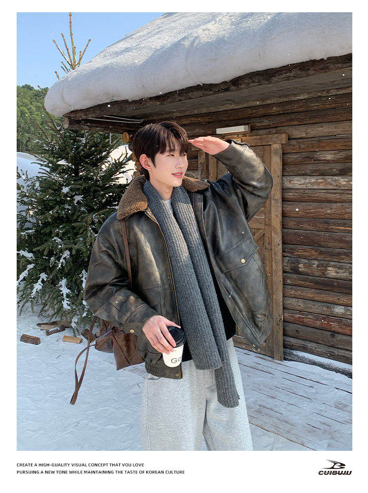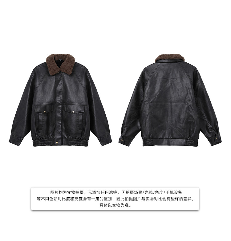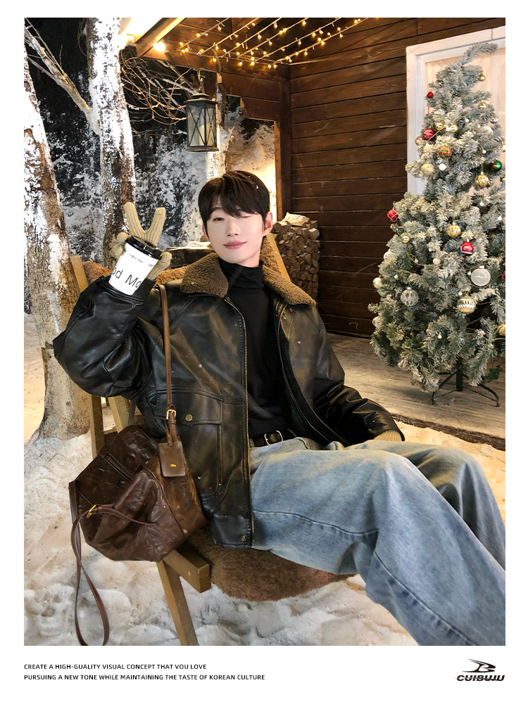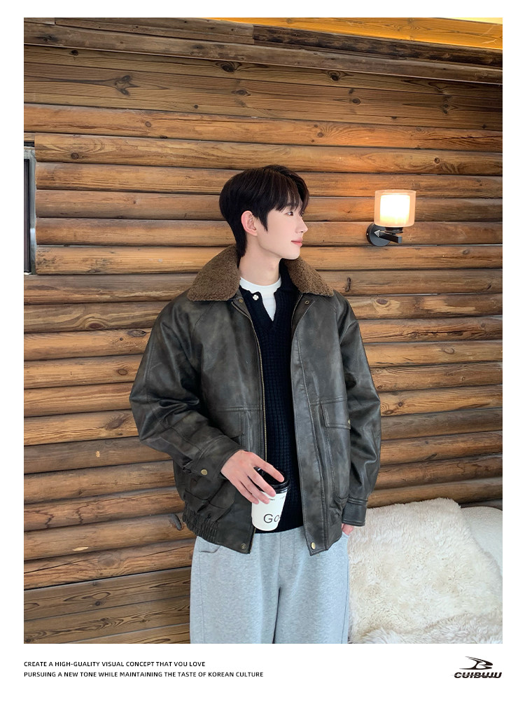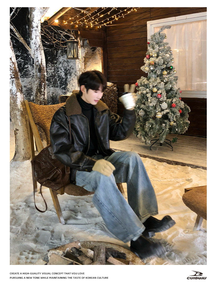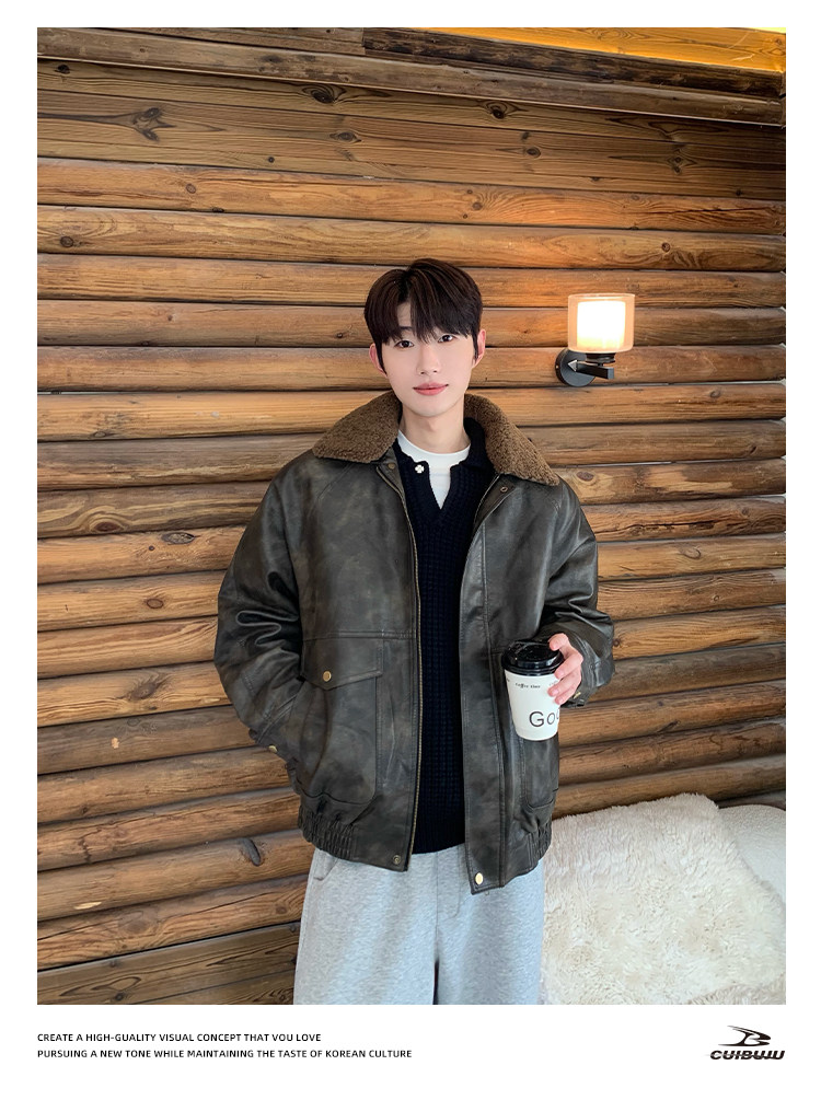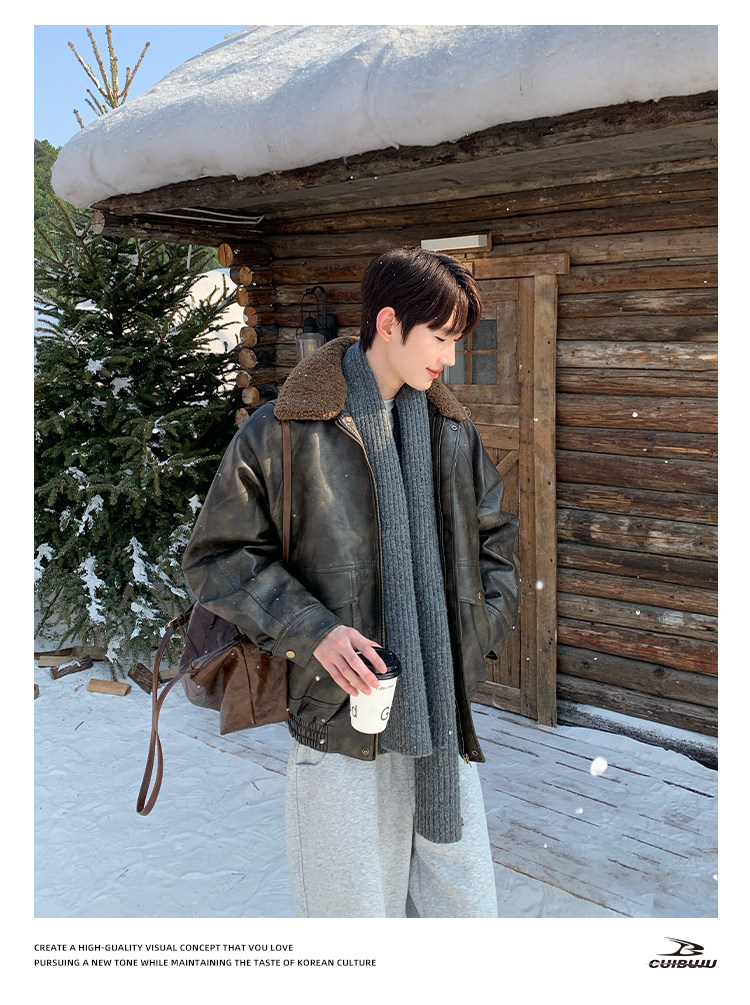 Cuibuju Retro Old Money Style Lamb Wool Lapel Patchwork Fleece-Lined Leather Jacket High-End Fashion Coat