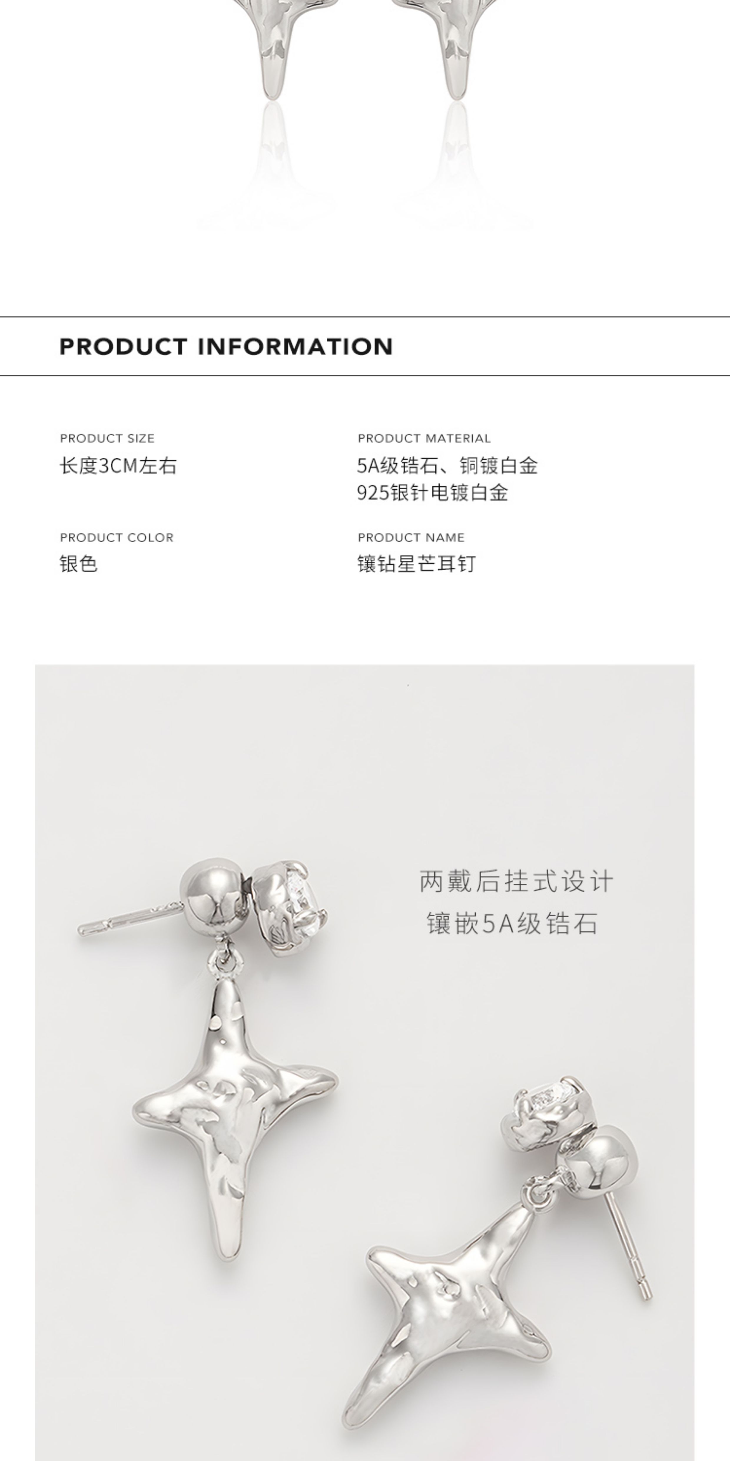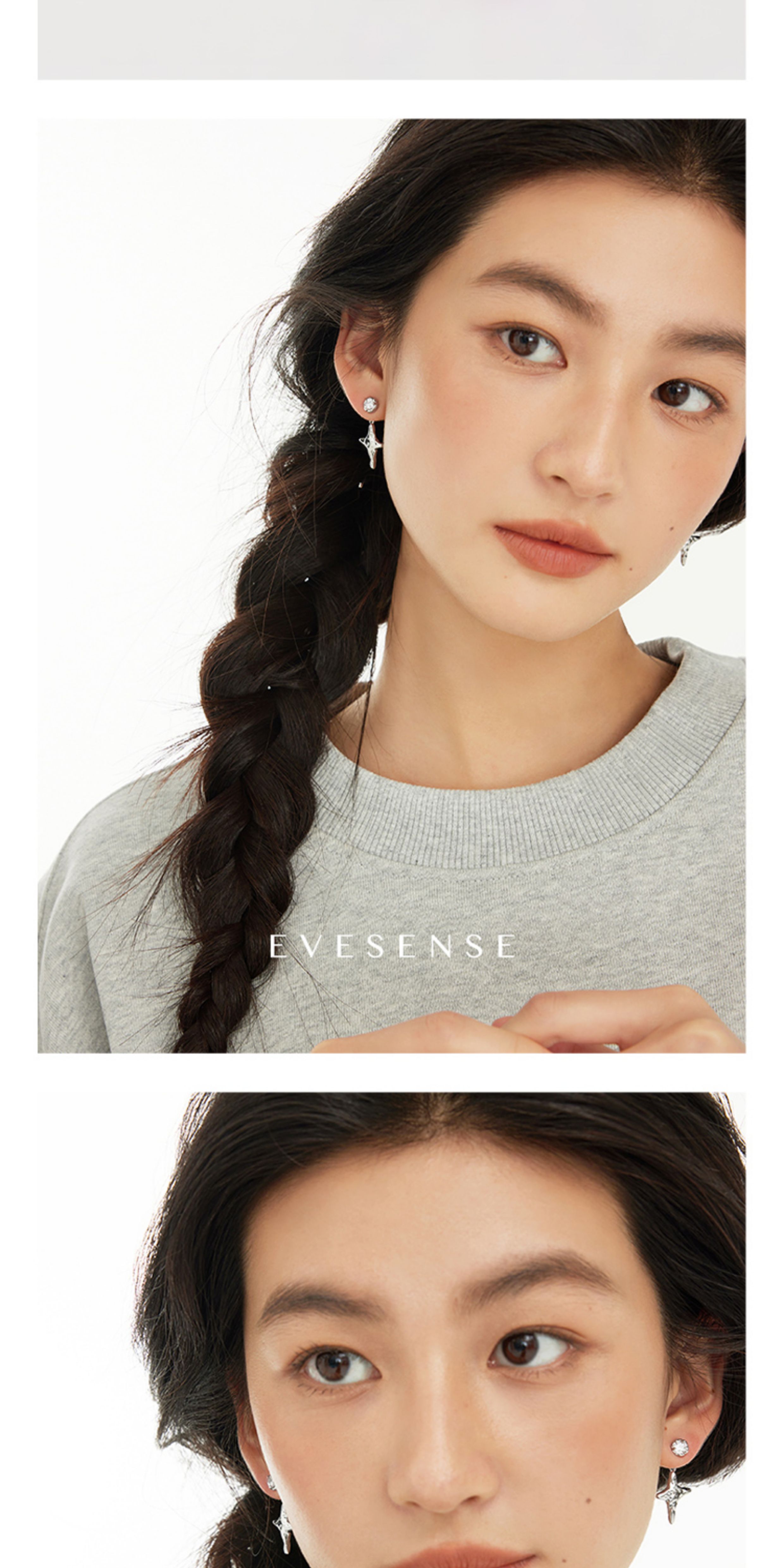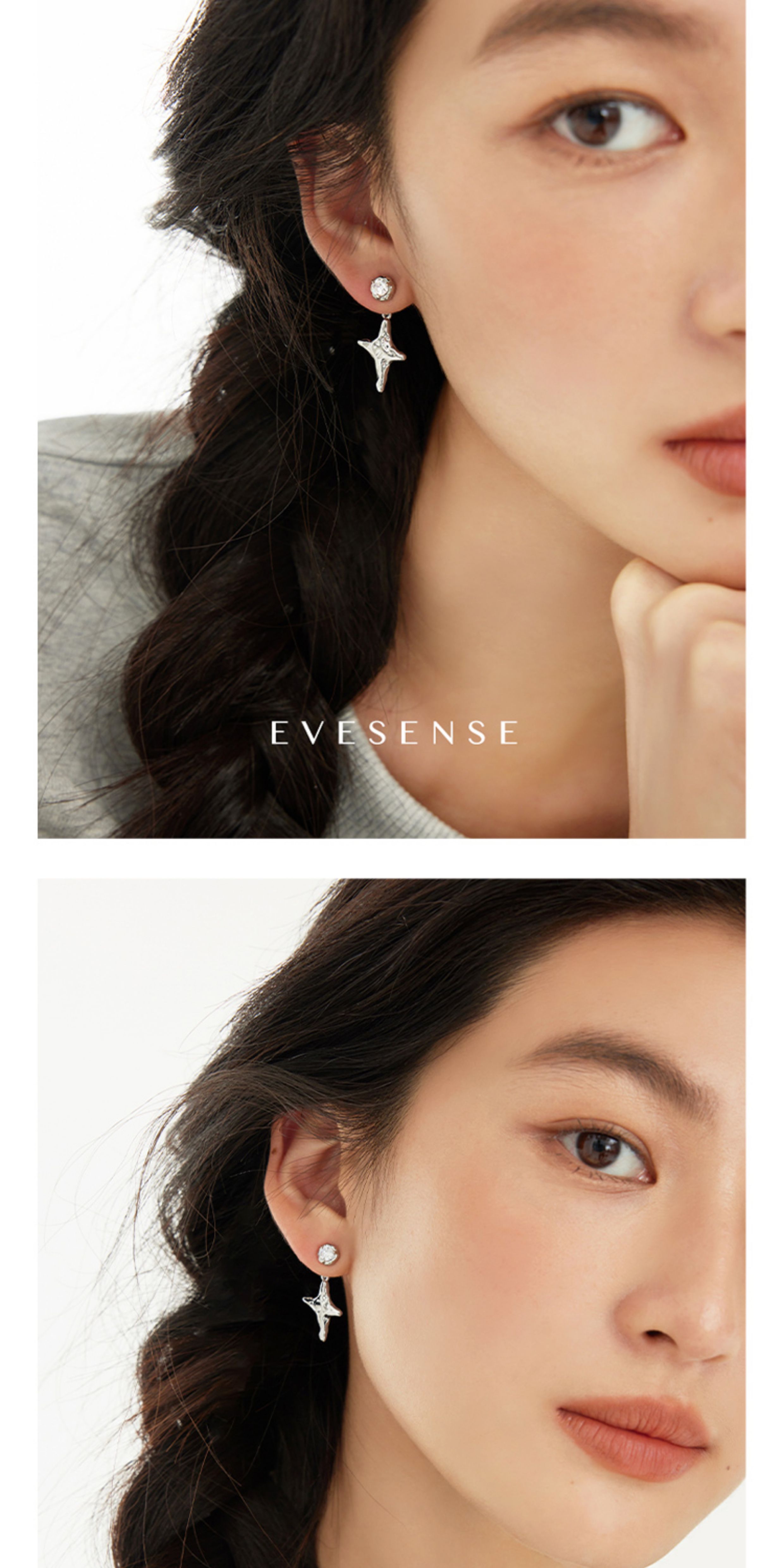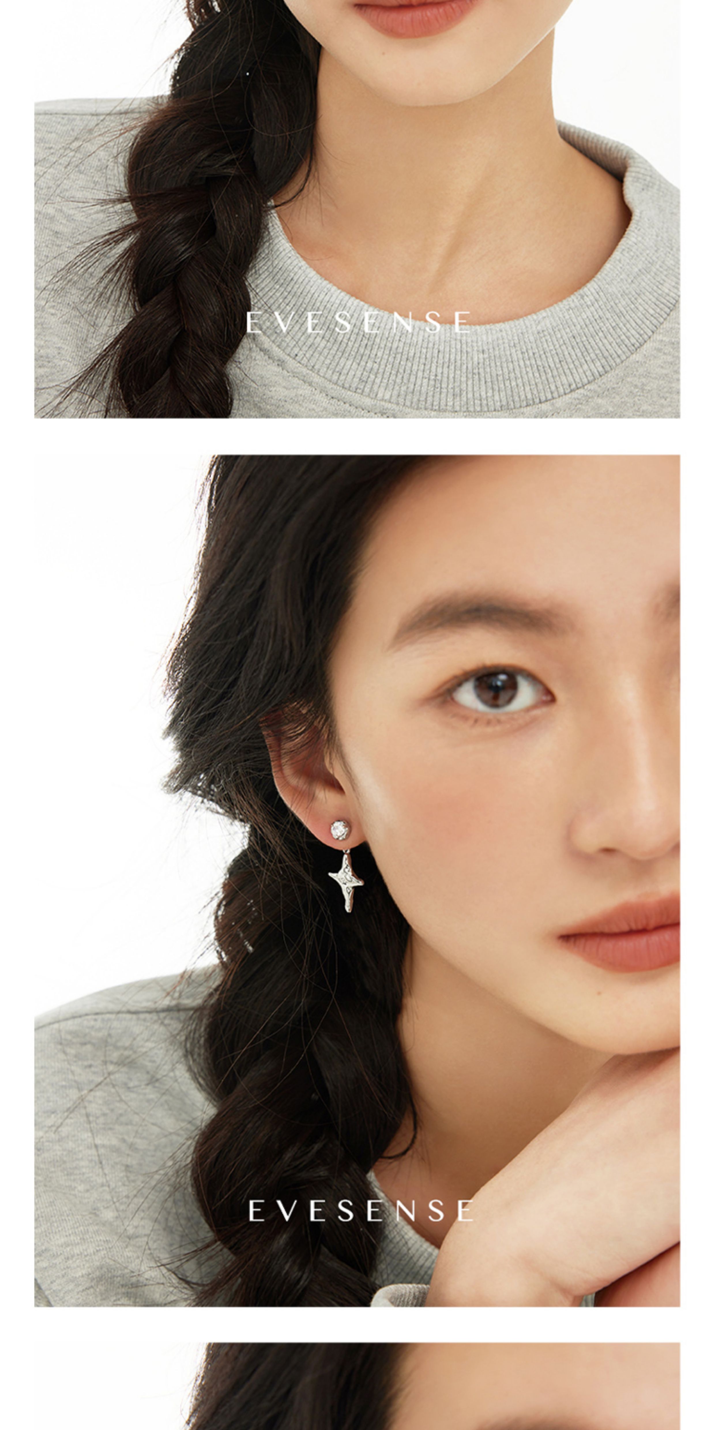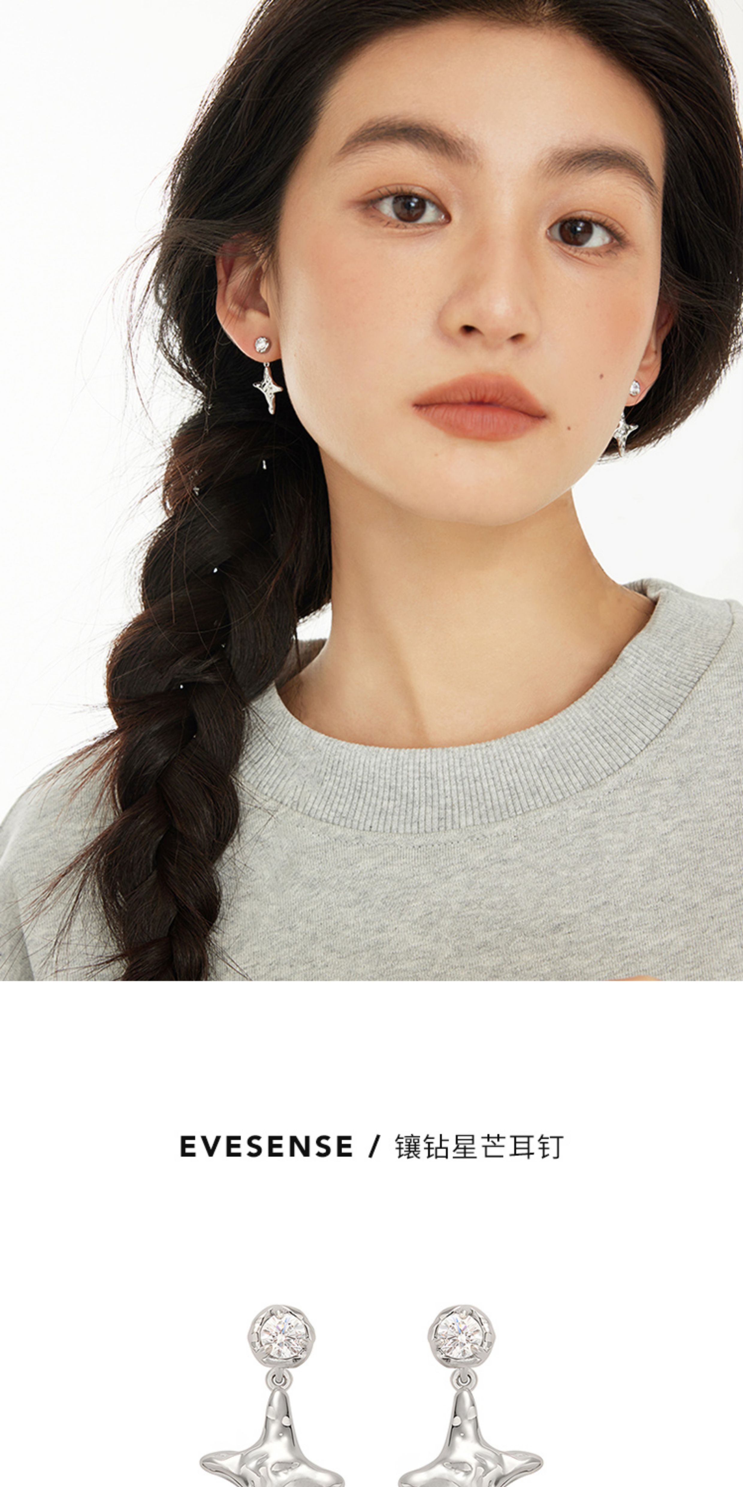 Evesense Original Diamond-Encrusted Star Earrings, High-End, Cool Style, Silver, Simple, Niche Four-Pointed Star Earrings for Women