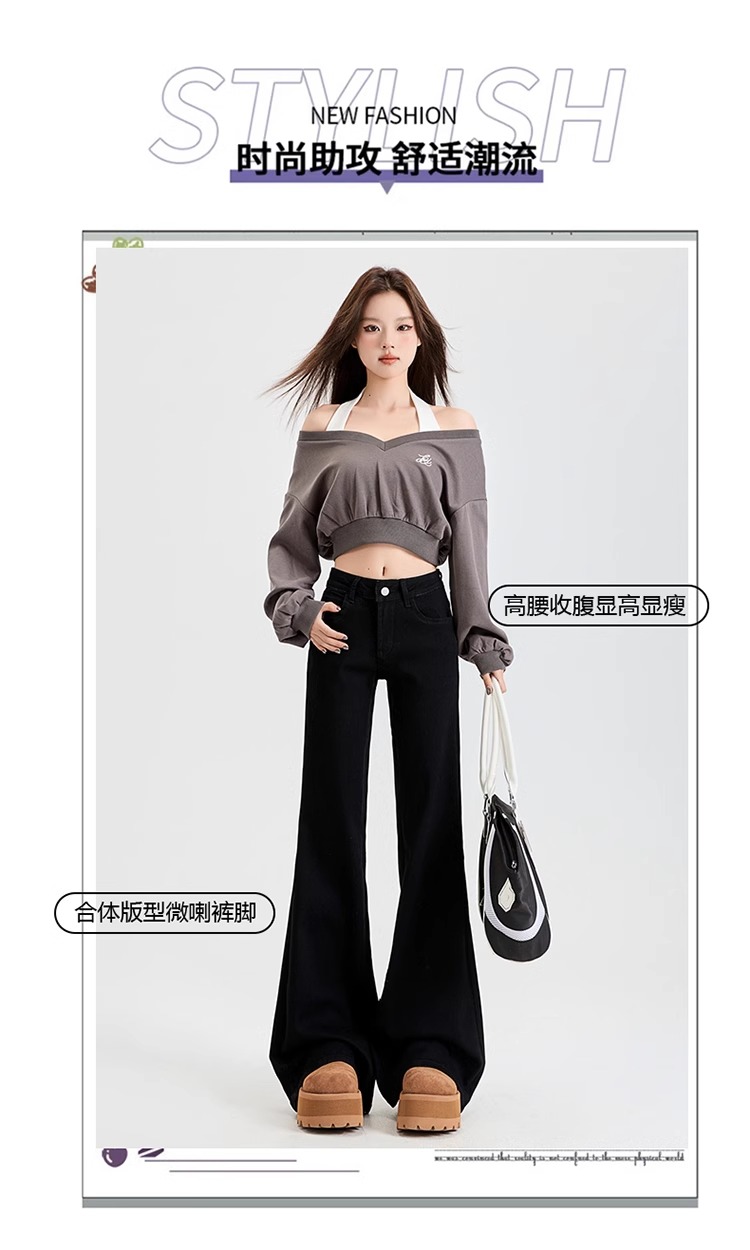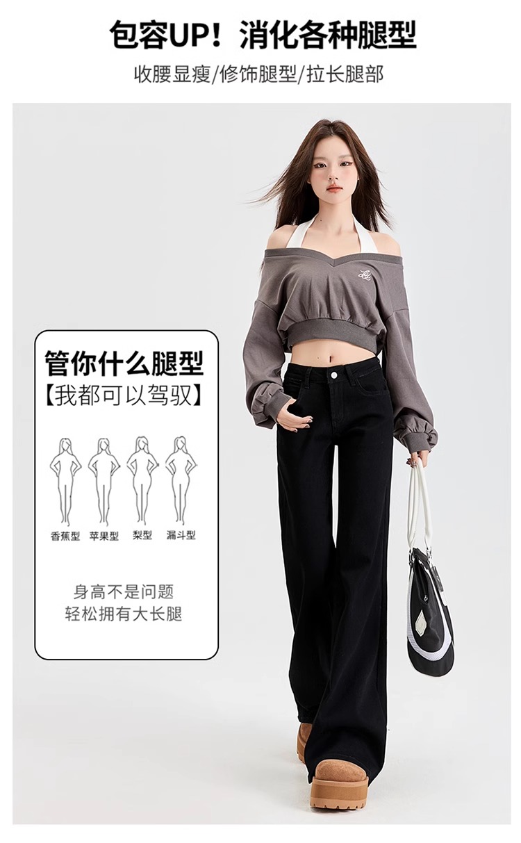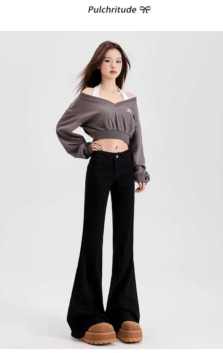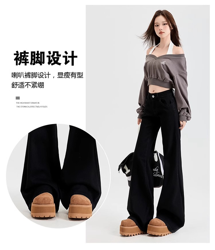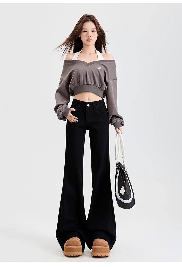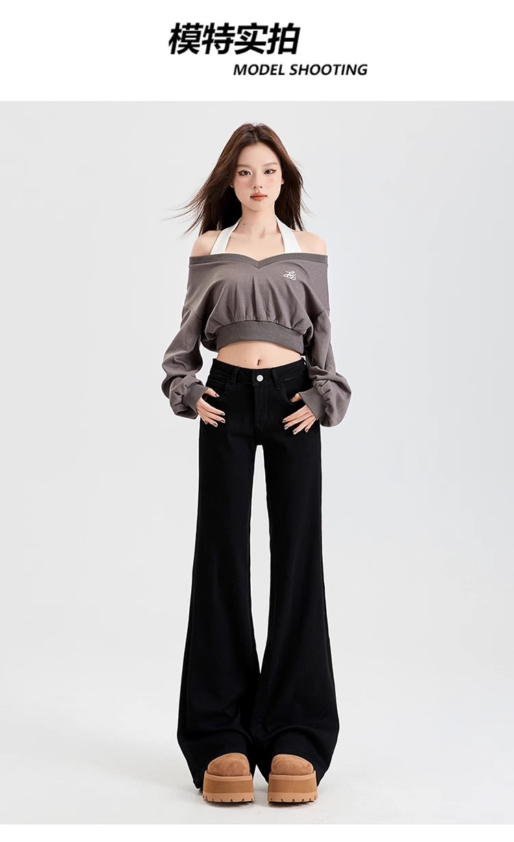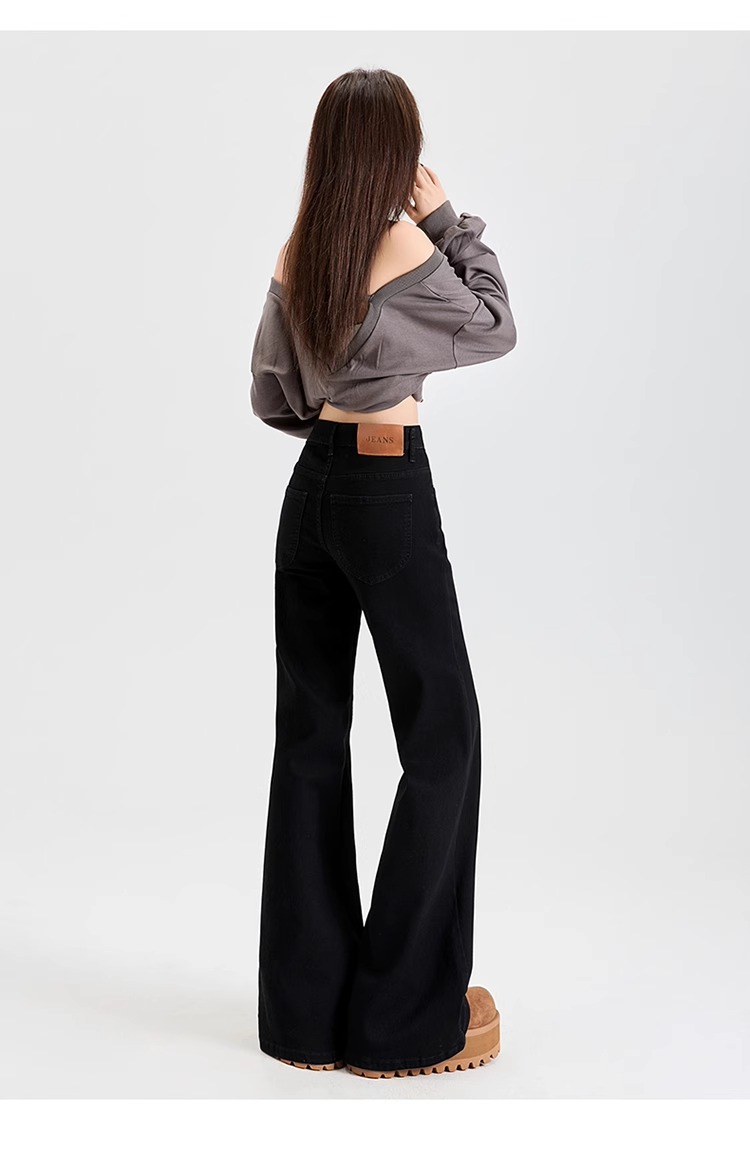 Mzvz Black Fleece-Lined Low-Waist Flared Jeans for Women, Autumn and Winter, Loose Wide-Leg, Non-Tight, Drapey Horse Hoof Flared Pants