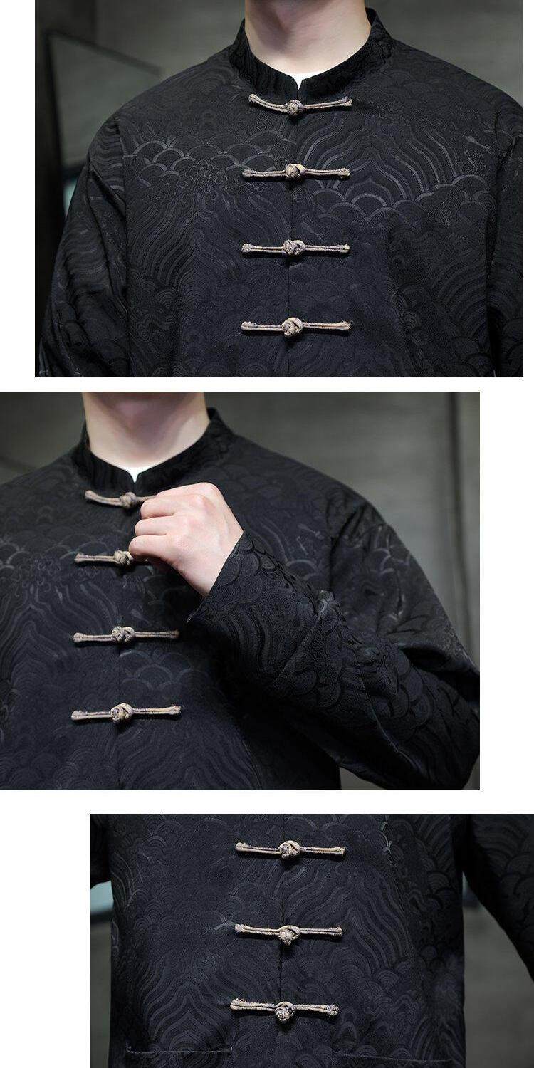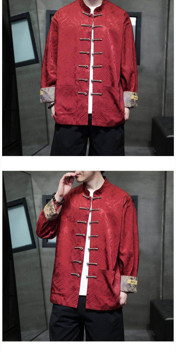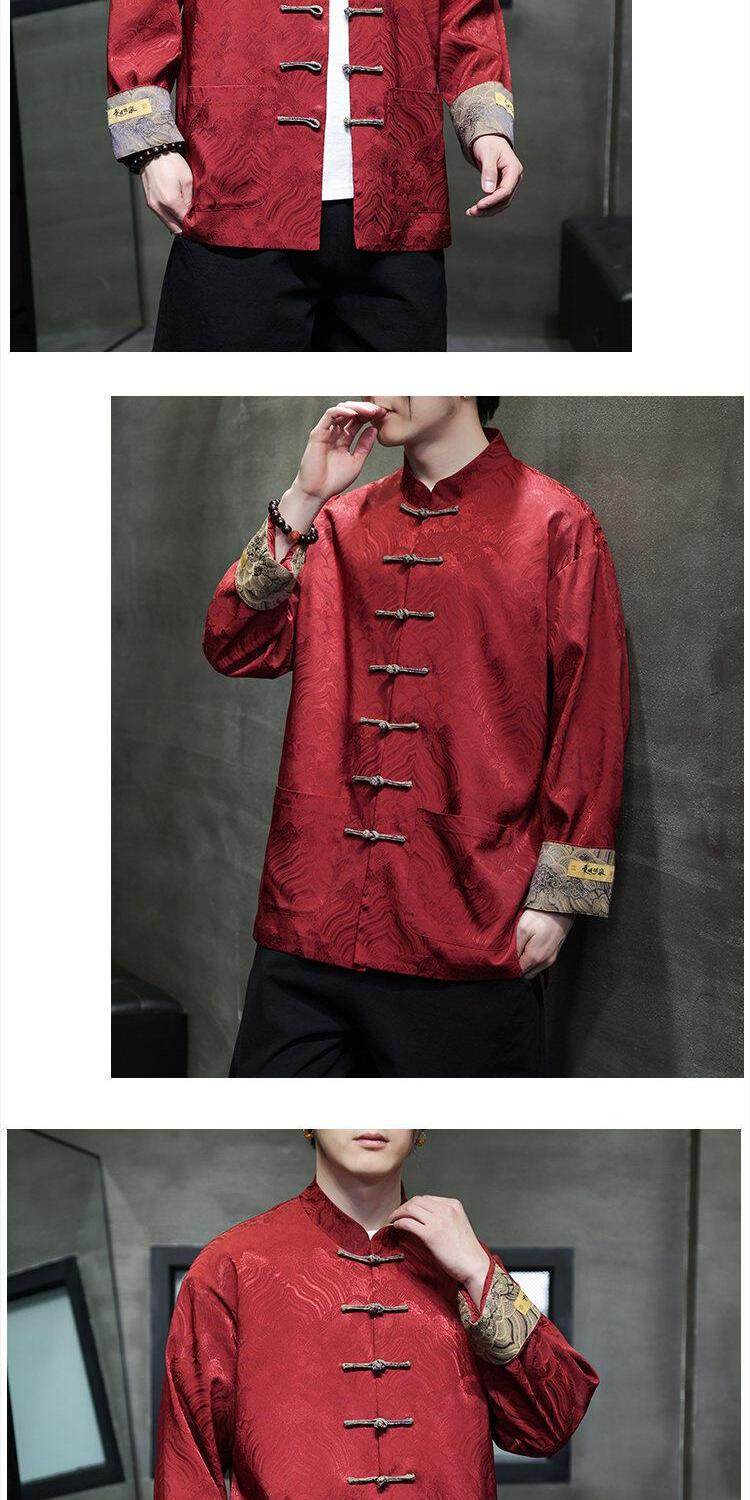 Chinese Style Spring and Autumn Long-Sleeved Red Performance Button-Down Tang Suit Wedding Dress Groomsmen Traditional Shirt Hanfu Top