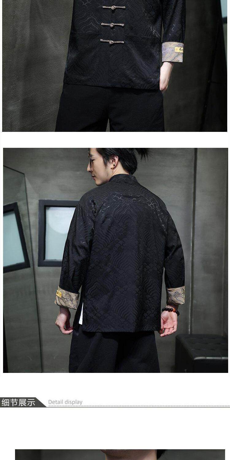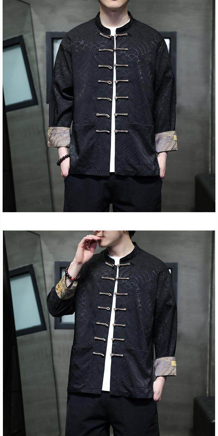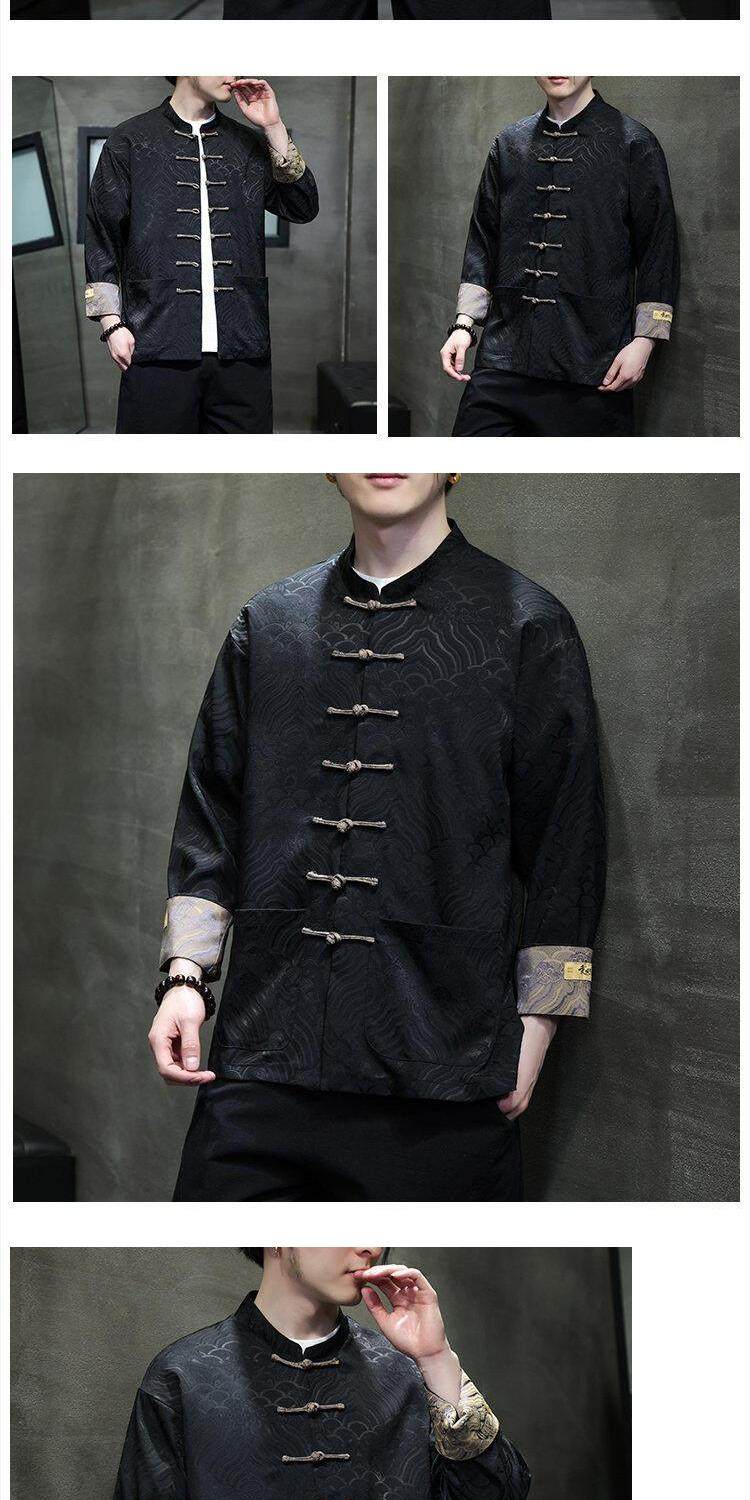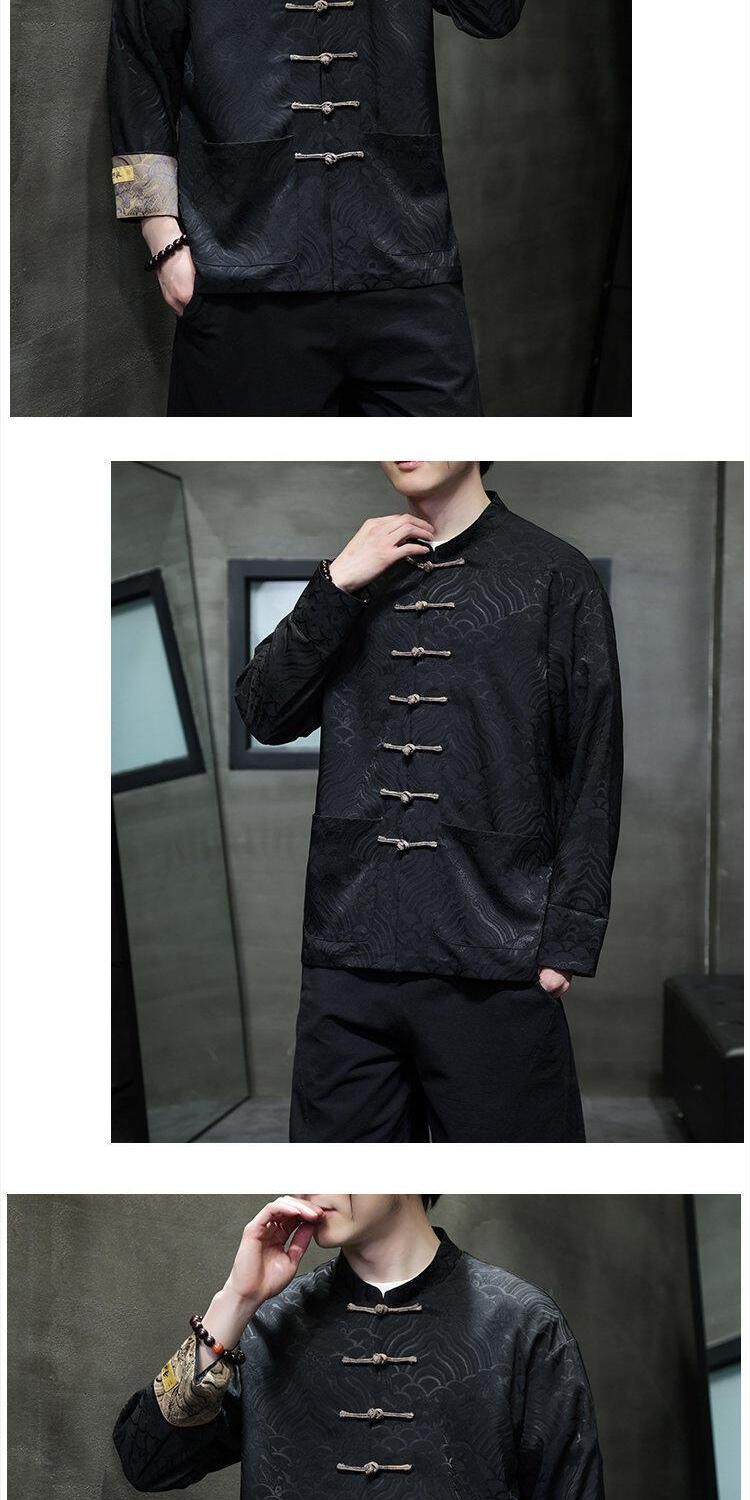 Chinese Style Spring and Autumn Long-Sleeved Red Performance Button-Down Tang Suit Wedding Dress Groomsmen Traditional Shirt Hanfu Top