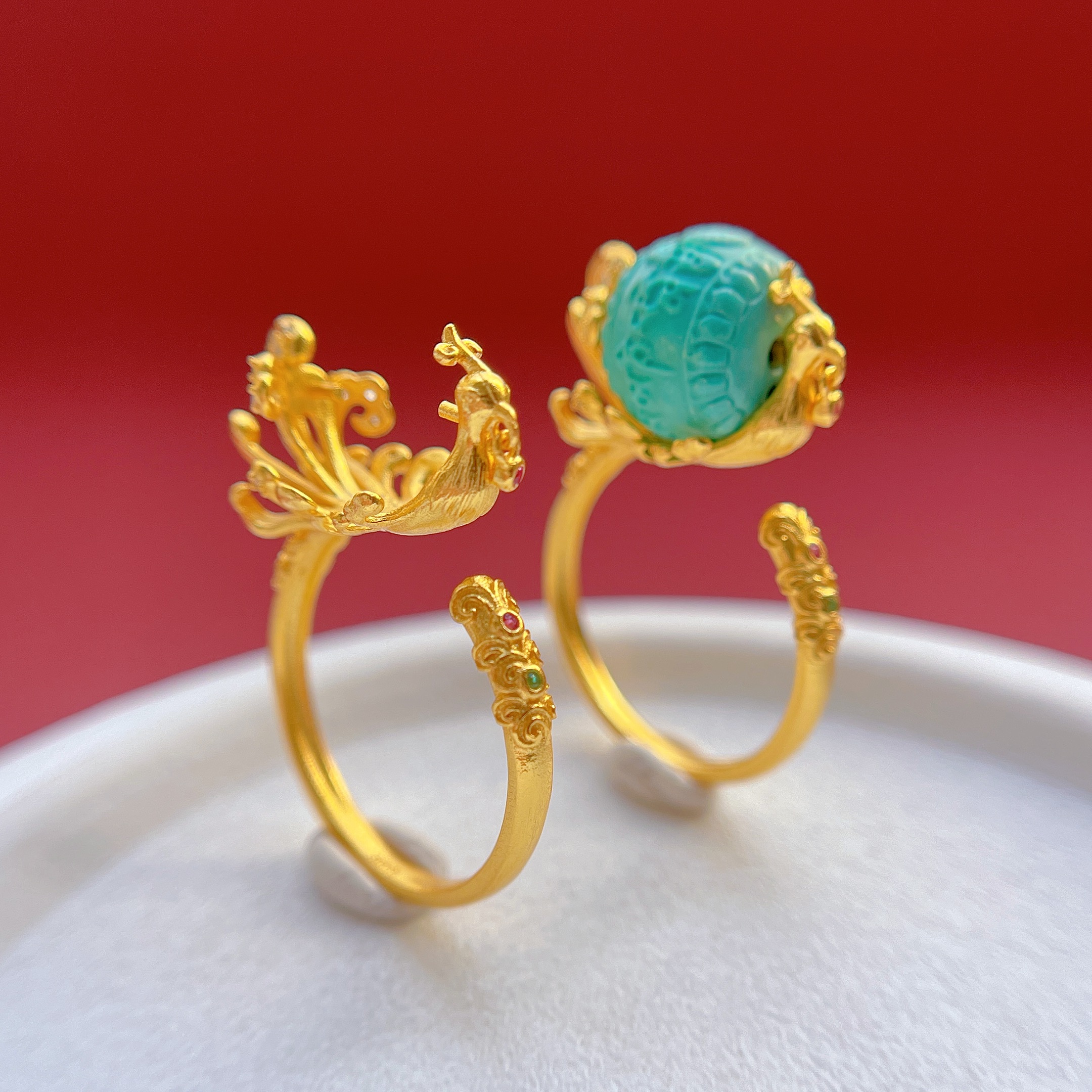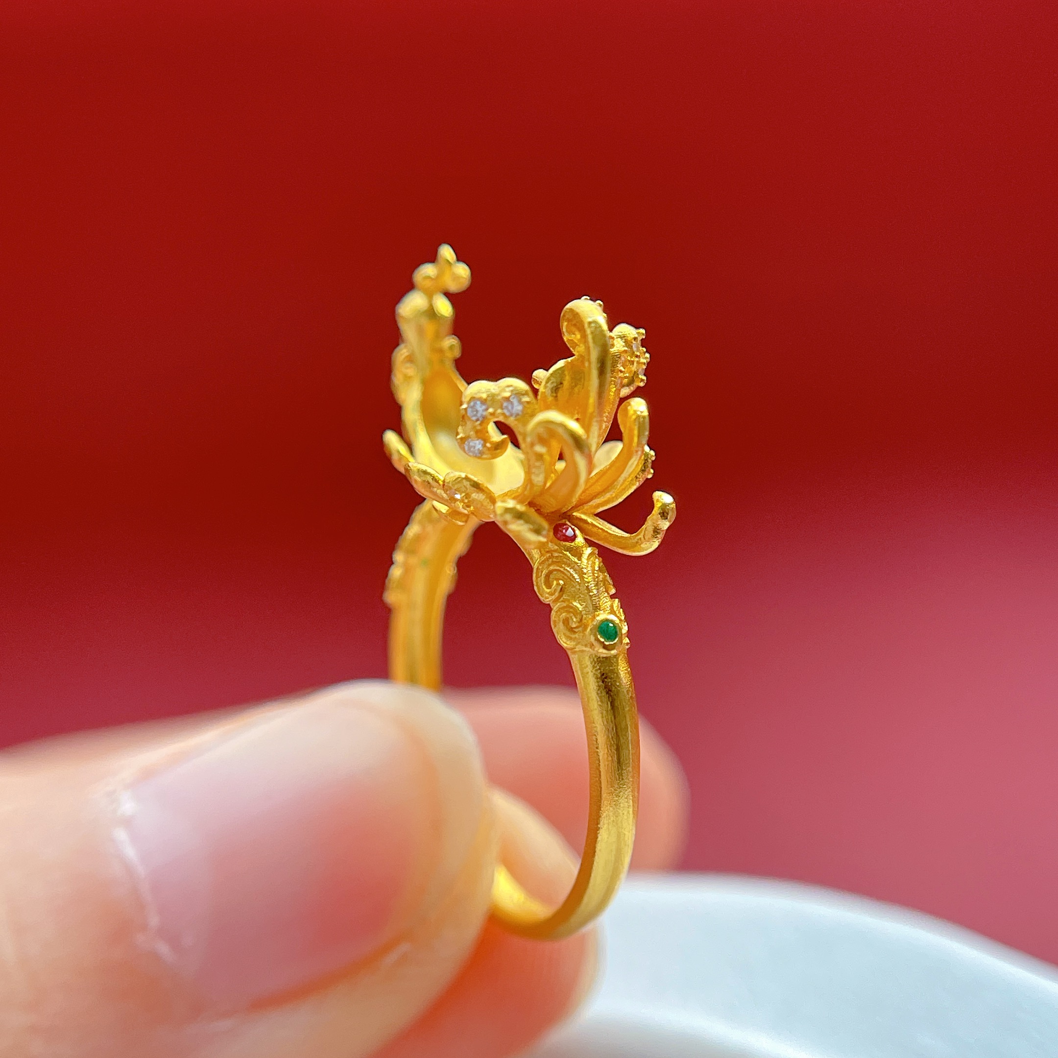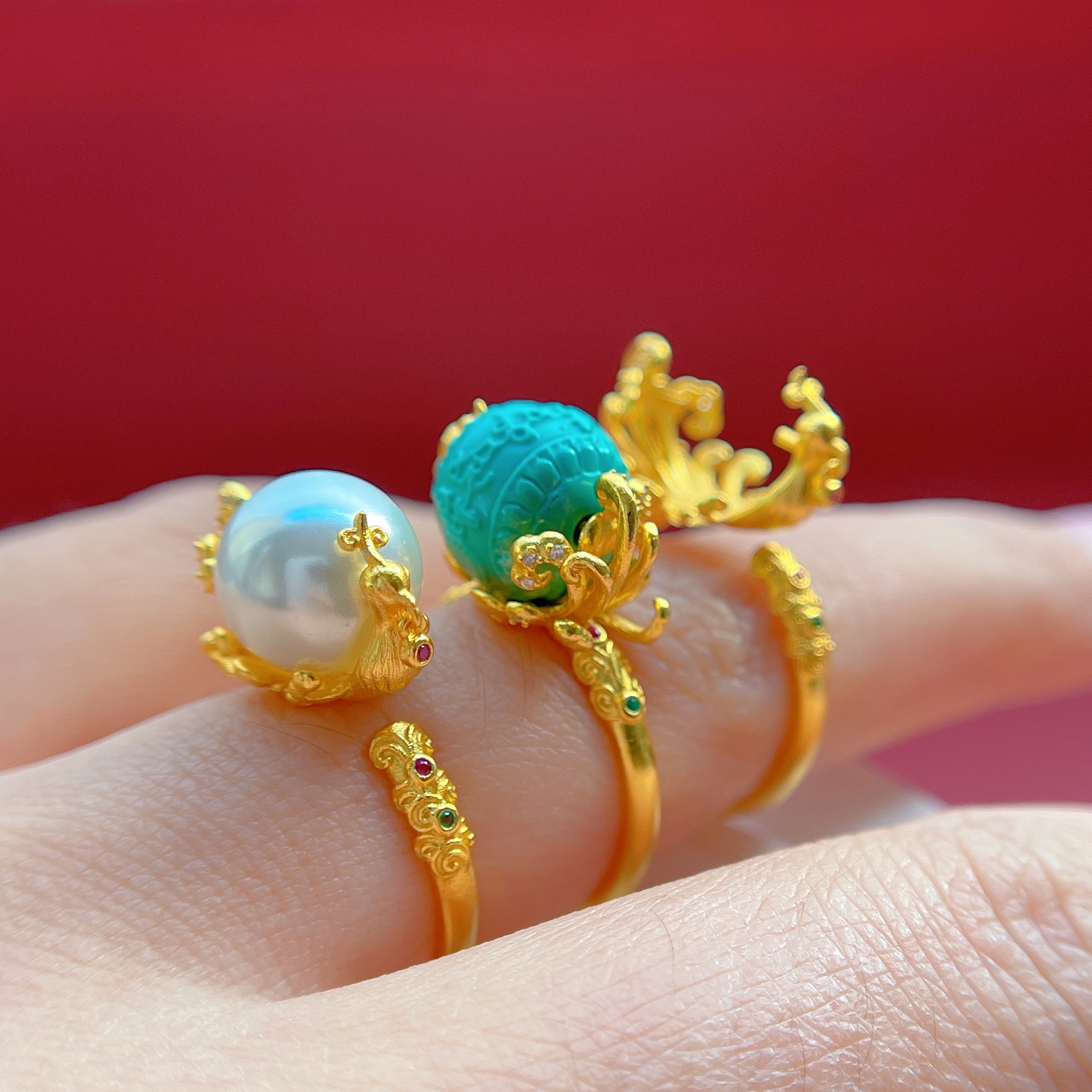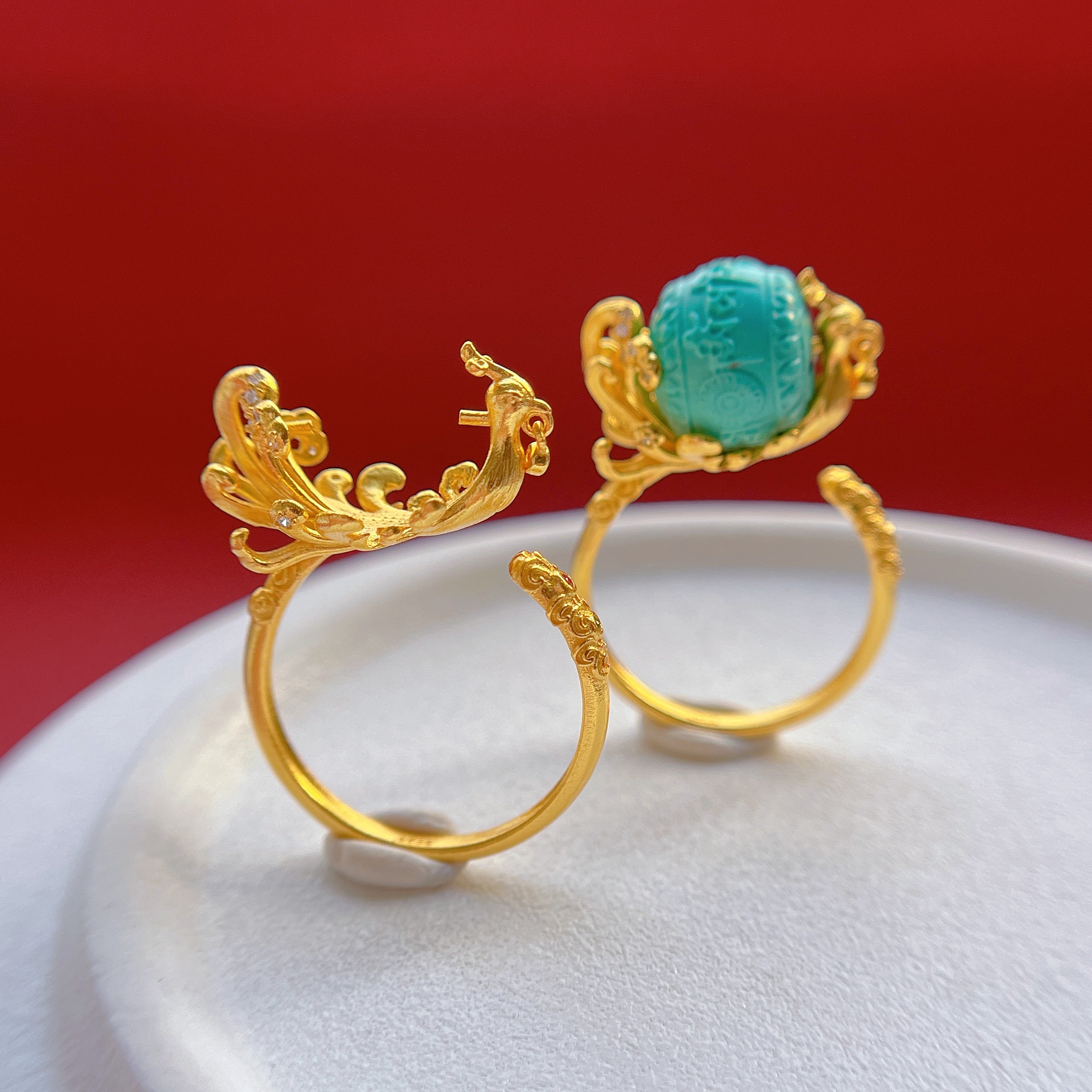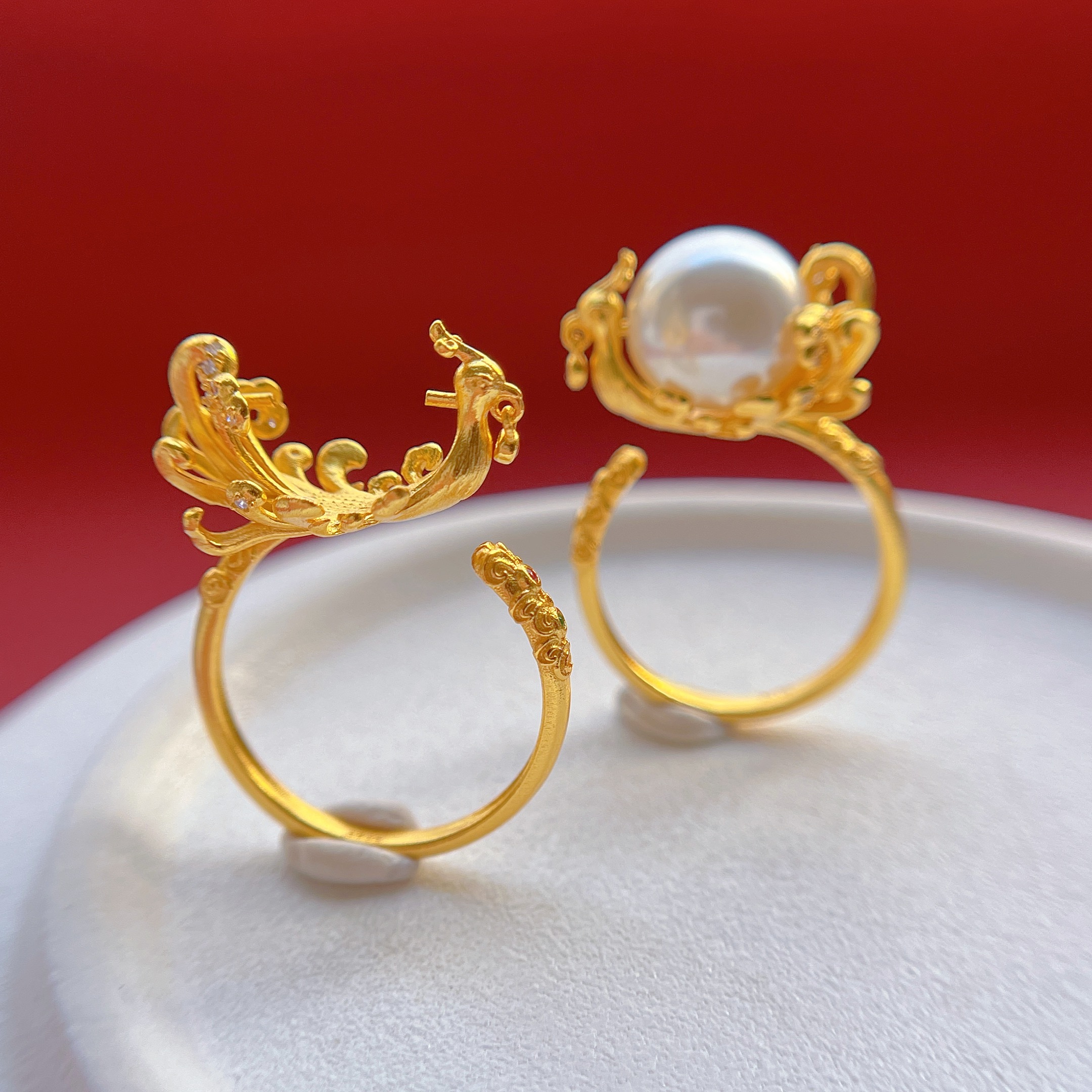 S925 Ancient Silver Gold-Plated Accessories with Engraved Phoenix Ring Setting for Women, Suitable for Pairing with Pearls, Turquoise, Southern Red Agate, and Various Other Beads