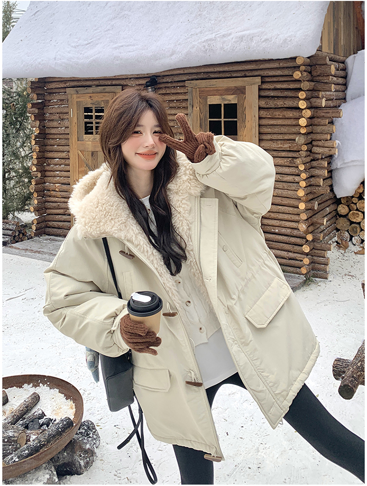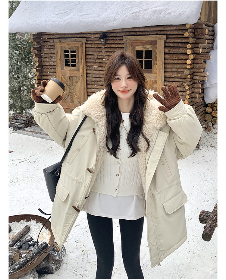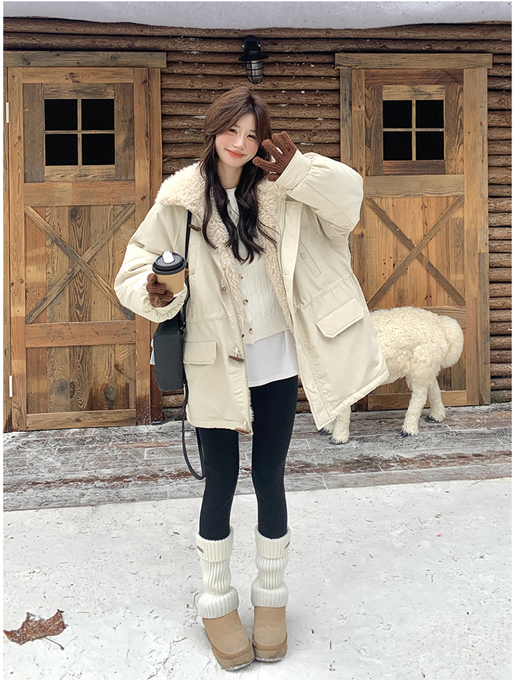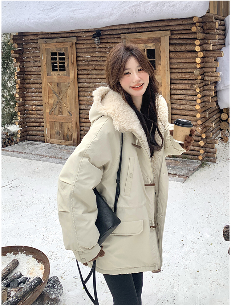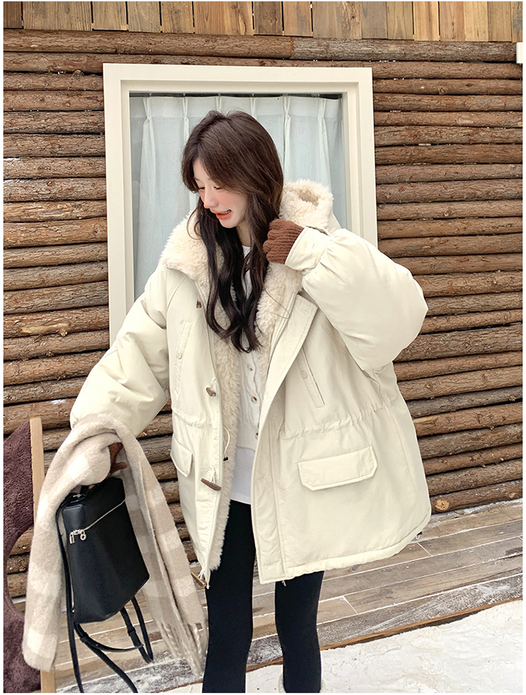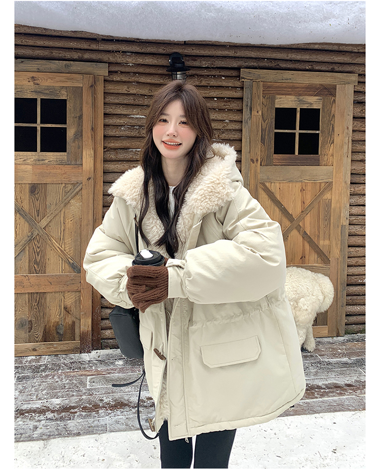 Off-White Parka for Women, 2025 Winter New Korean-Style College Wind Hooded Warm Fleece-Lined Lamb Wool Cotton Coat