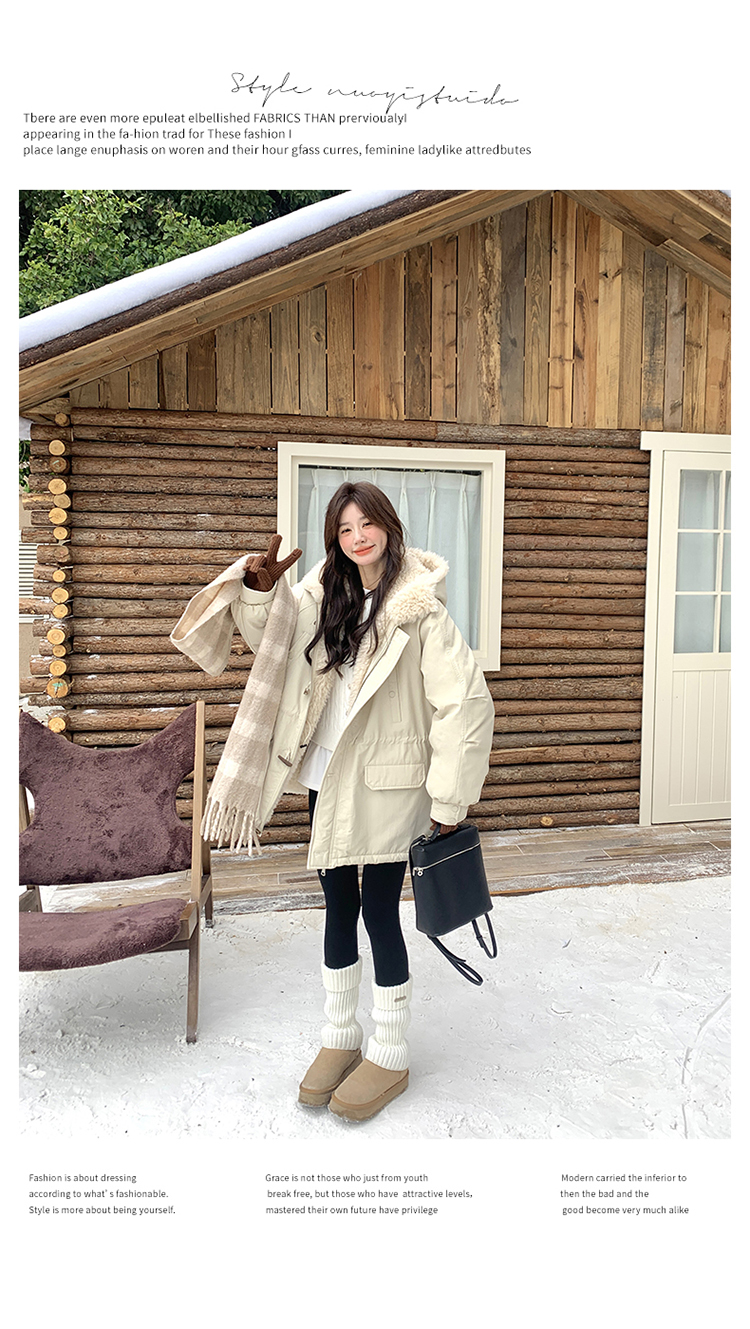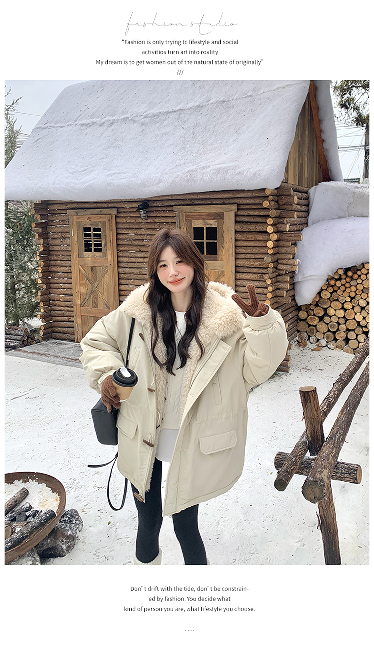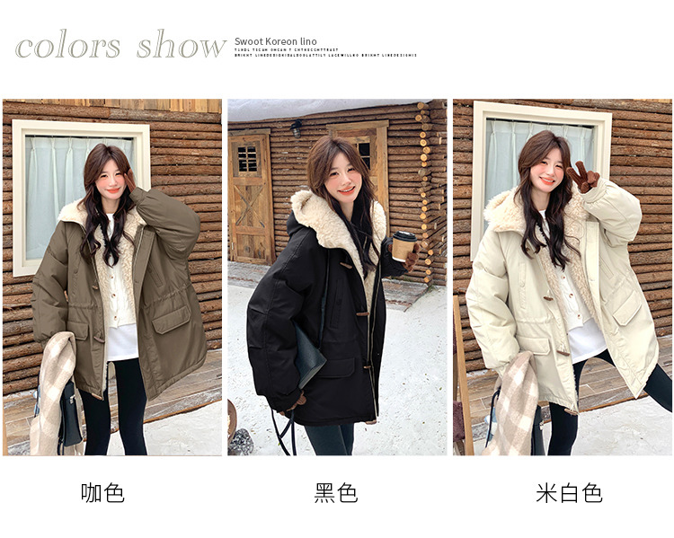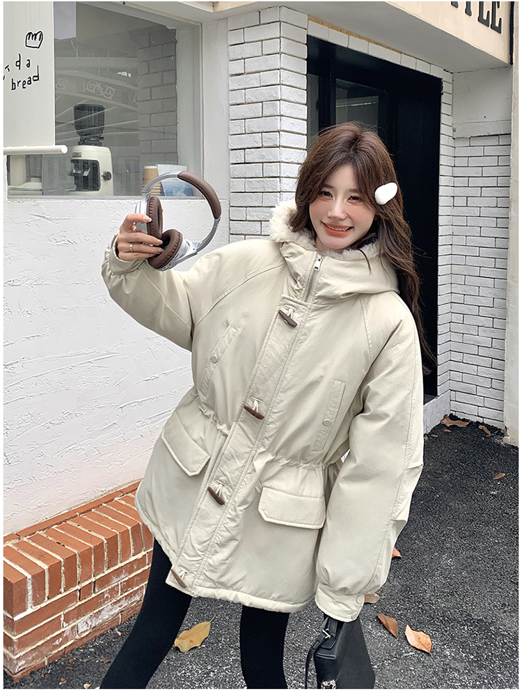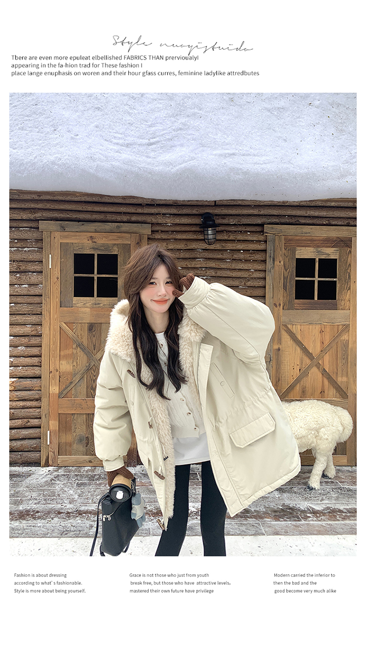 Off-White Parka for Women, 2025 Winter New Korean-Style College Wind Hooded Warm Fleece-Lined Lamb Wool Cotton Coat
