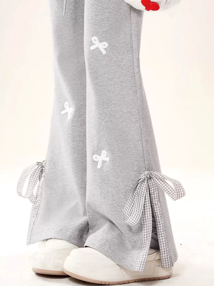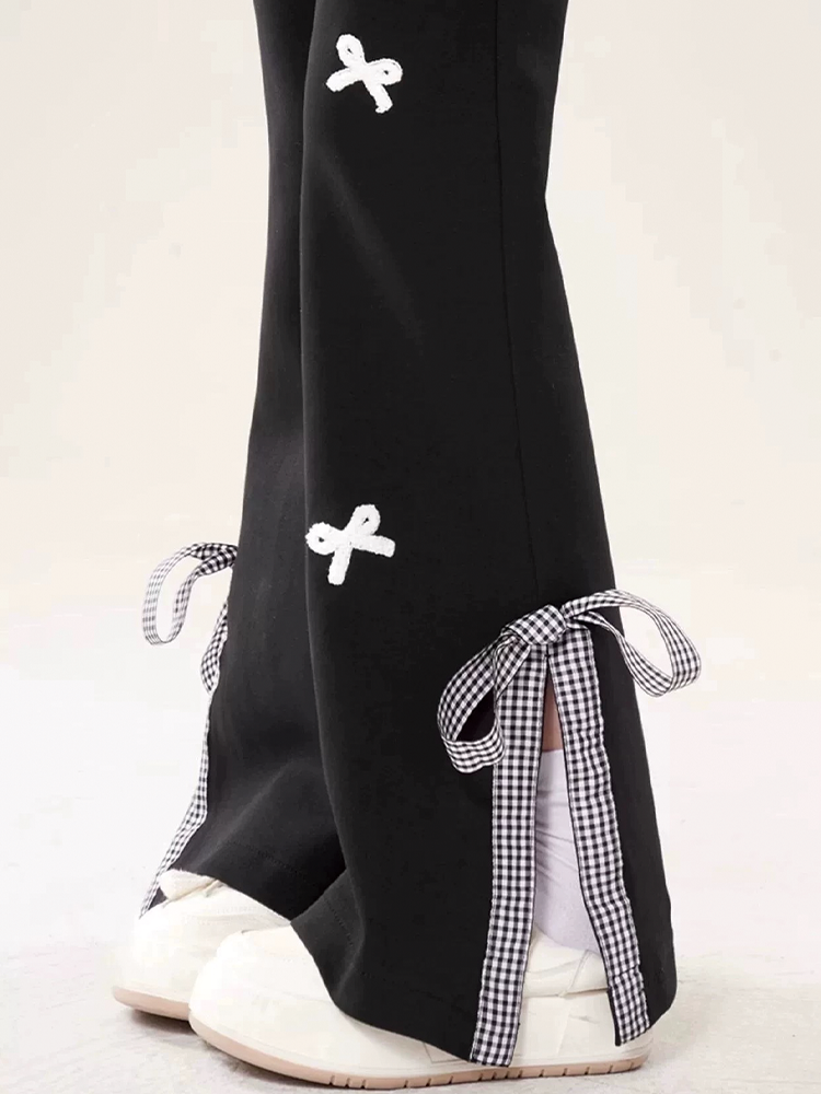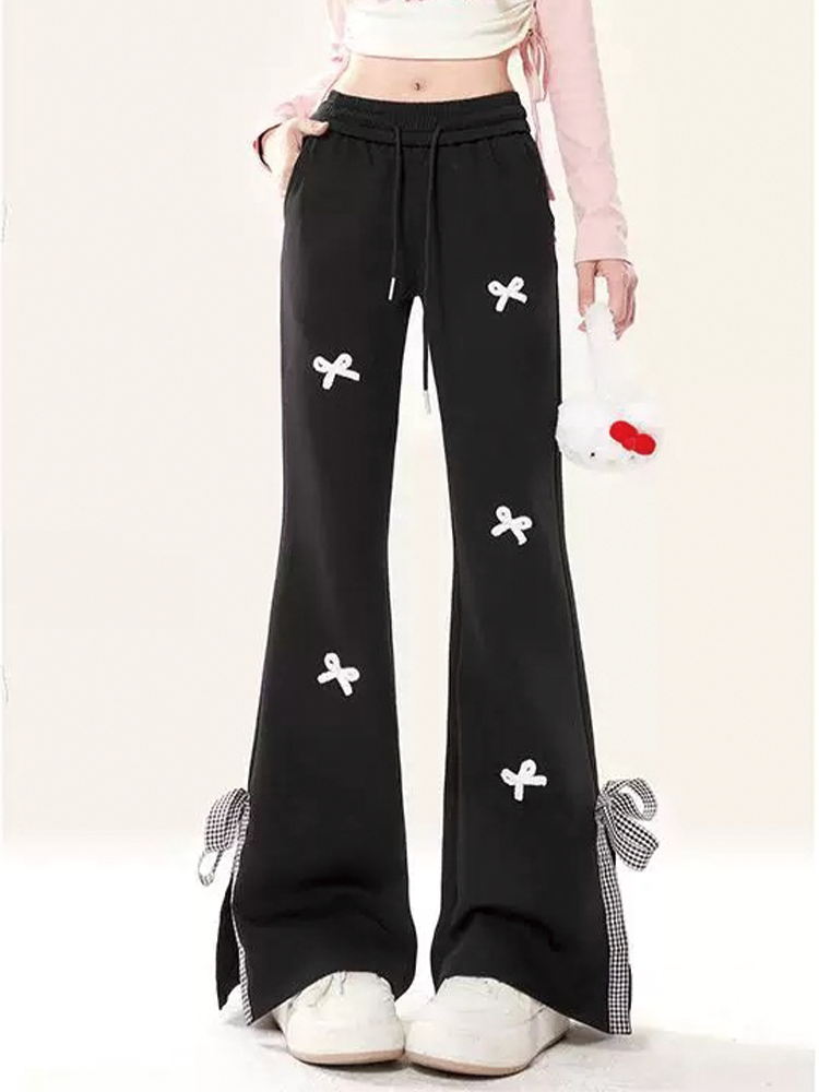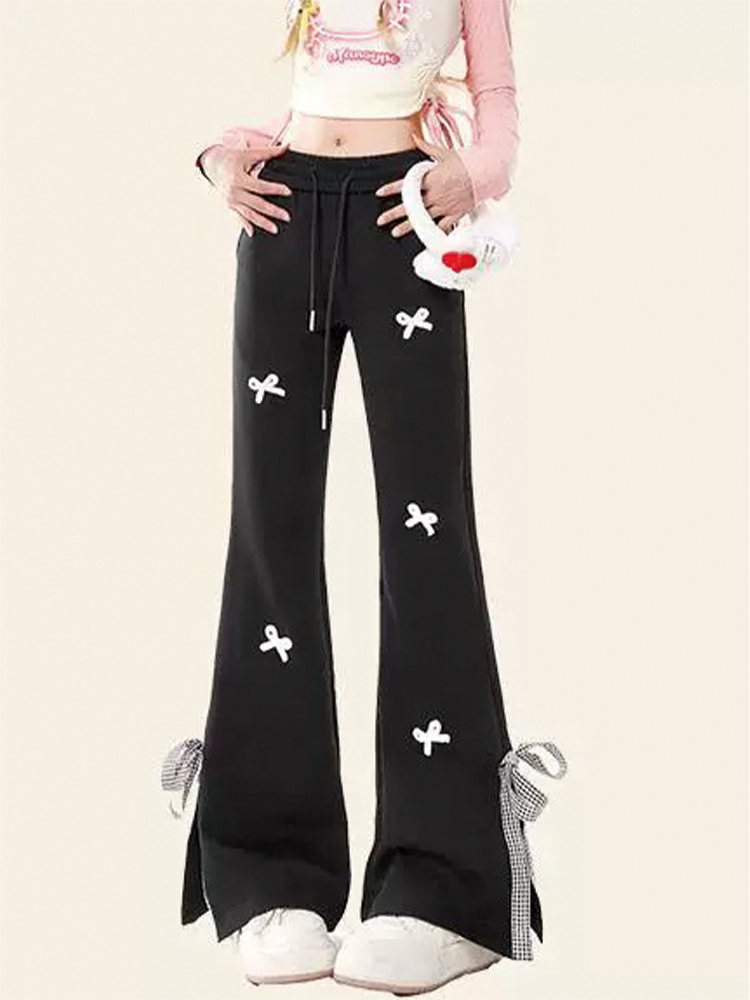 Sweet Girl Style Bow-Knot Patchwork Casual Sweatpants for Women, Preppy High-Waisted Split Flared Straight-Leg Versatile Sports Pants
