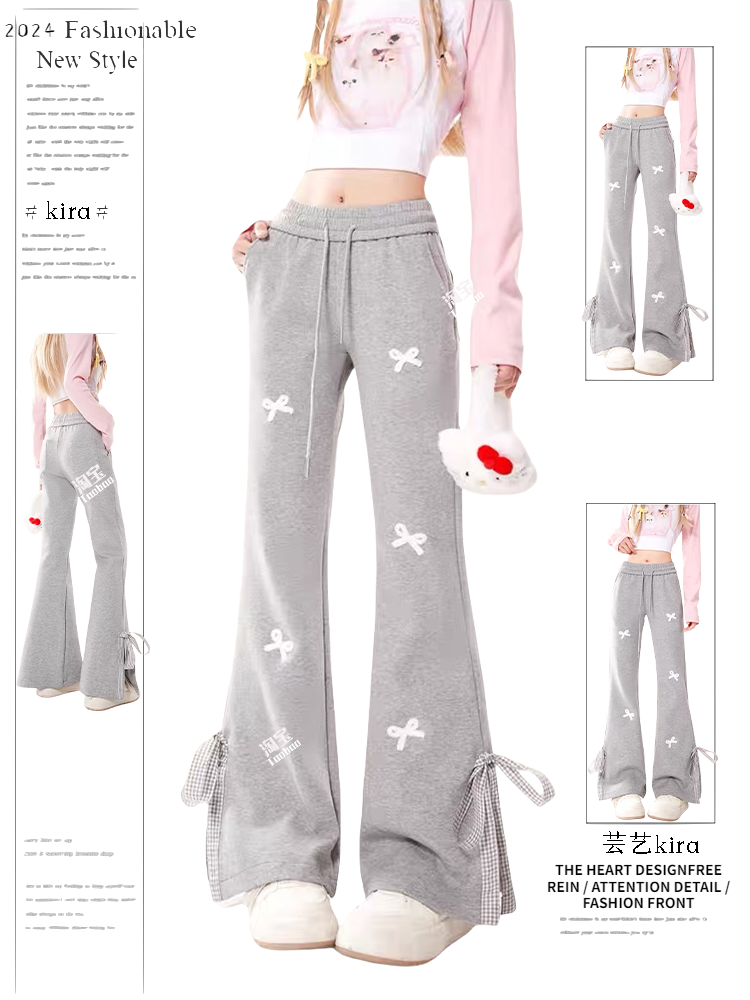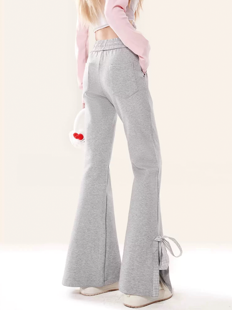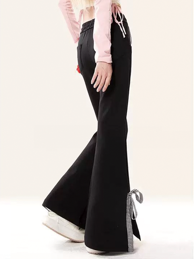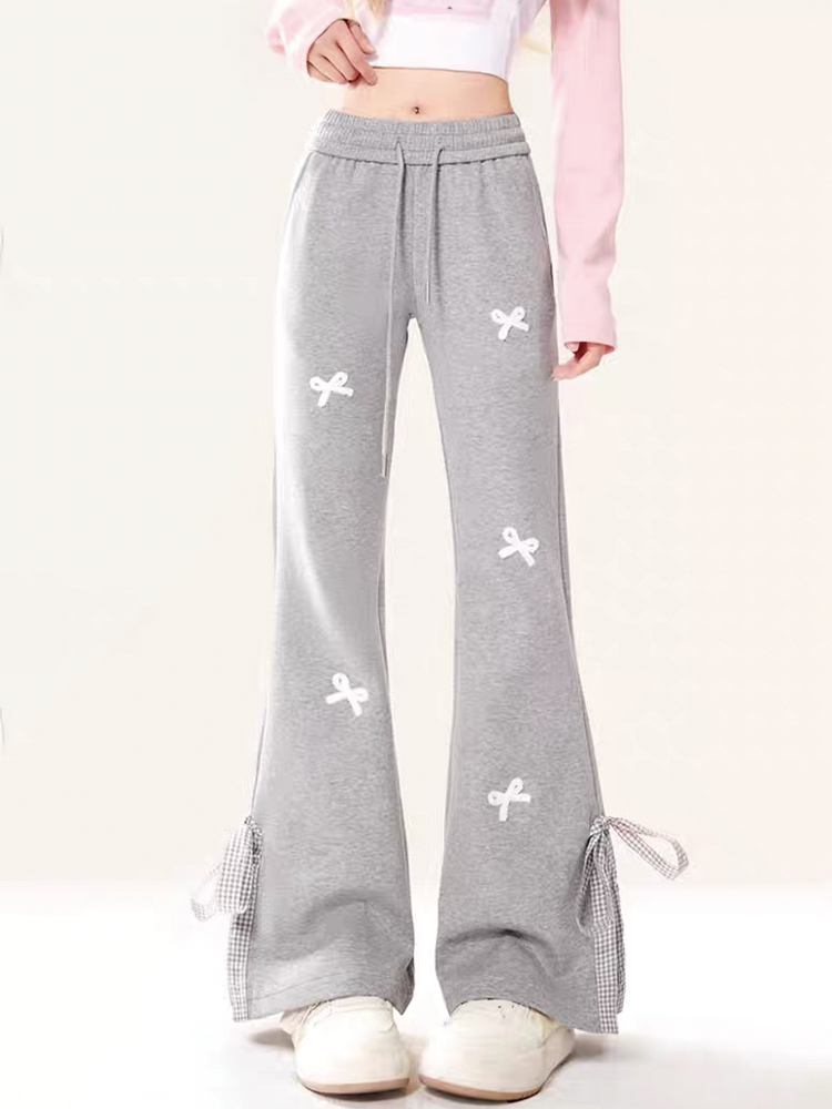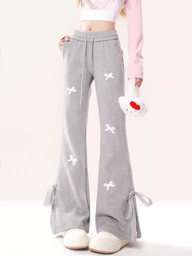 Sweet Girl Style Bow-Knot Patchwork Casual Sweatpants for Women, Preppy High-Waisted Split Flared Straight-Leg Versatile Sports Pants