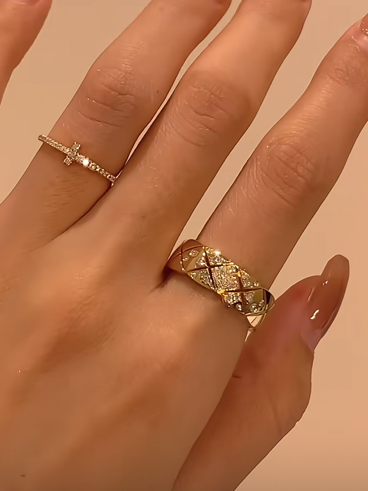 【Search for Light】Vintage Diamond-Encrusted Diamond-Shaped Wide Ring, Chanel-Style Light Luxury, Full Diamond Cross Stackable Index Finger Ring