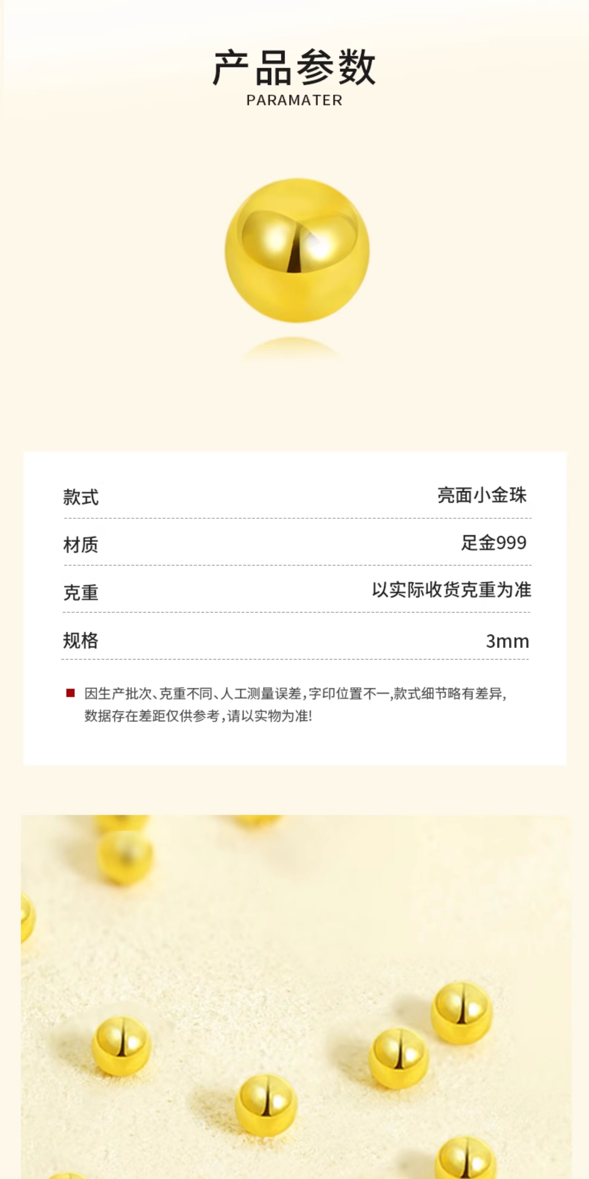 【Wuhuang Laojin】Small Gold Beads, Gold Fortune Beads, Gold Accessories, 999 Pure Gold Loose Beads, Gold Beads for Diy, Girlfriend Gift