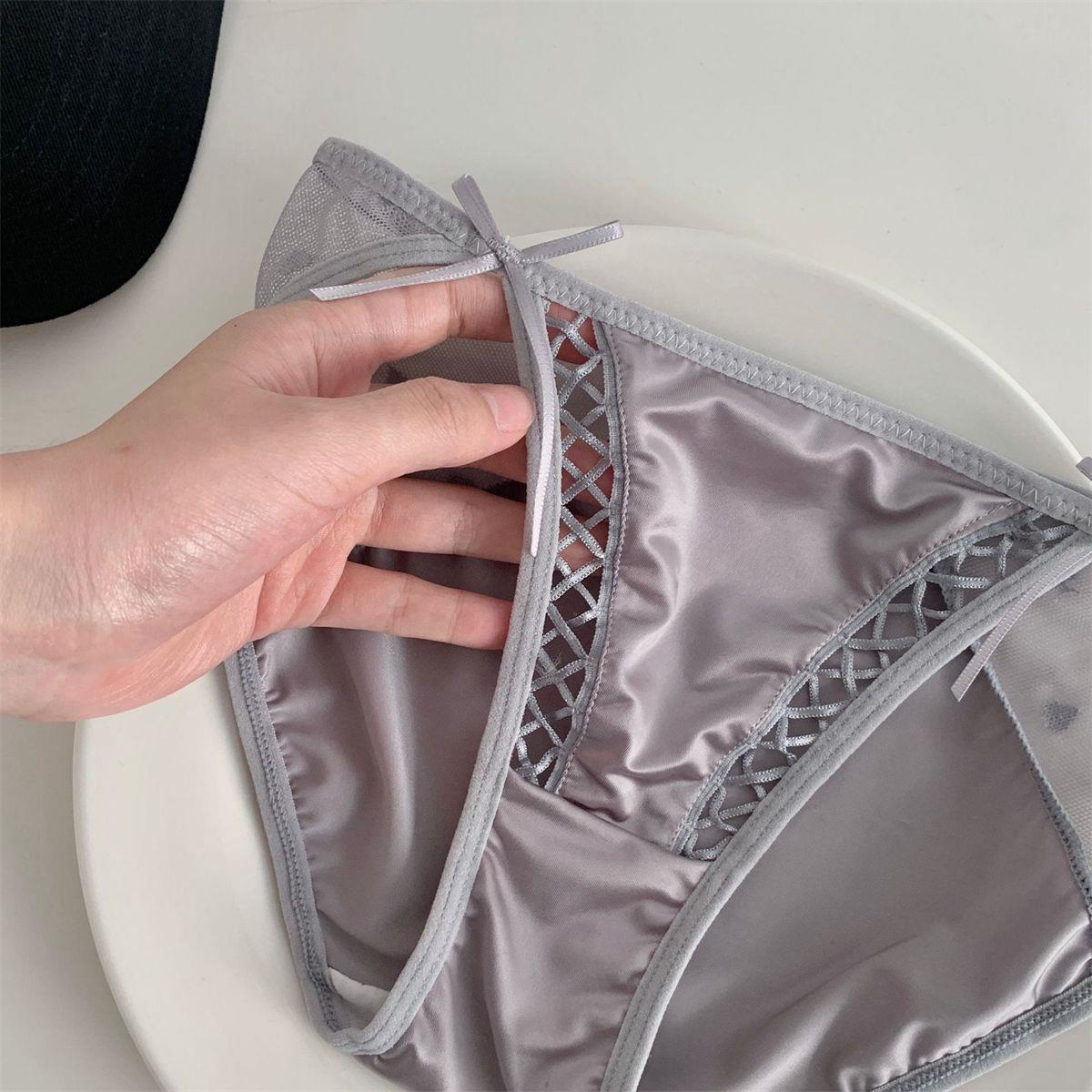 New French-Style Sexy Low-Waist Satin Hip-Lifting Pure Desire Style Mesh Hollow Bow Breathable Blue Briefs for Women