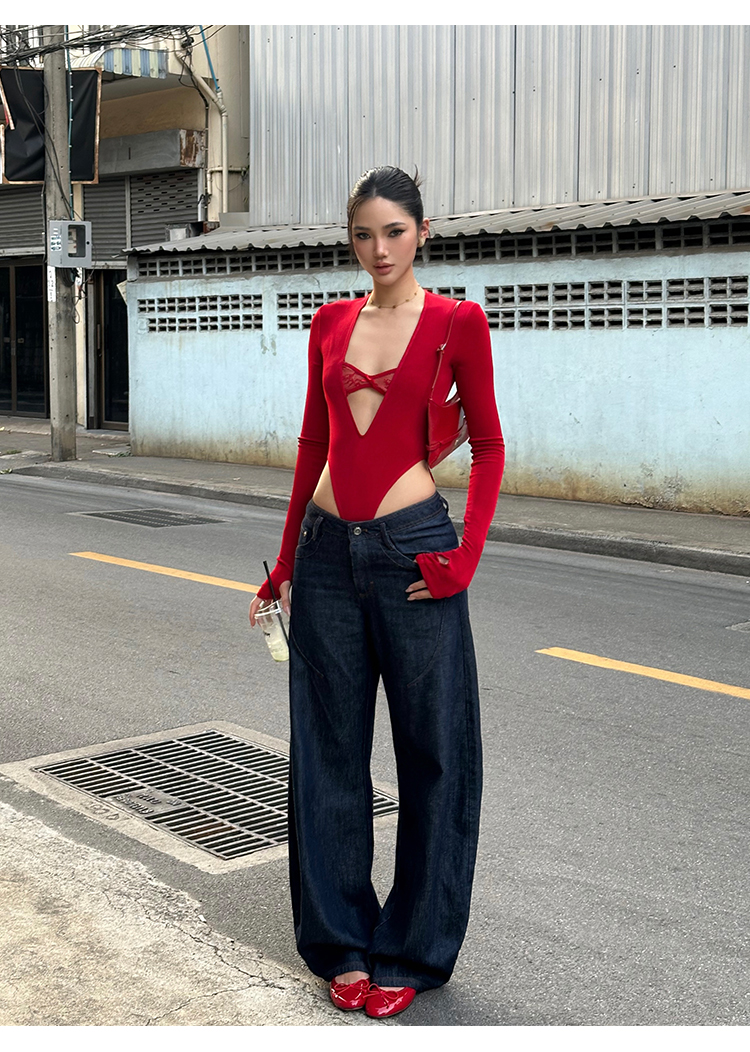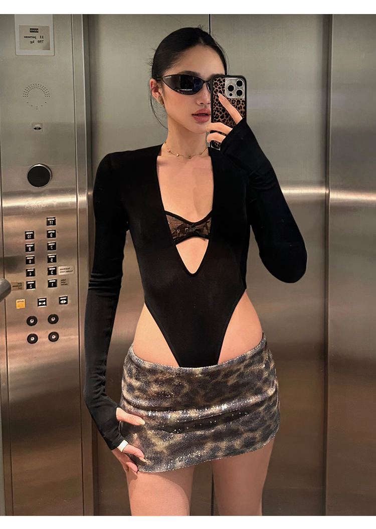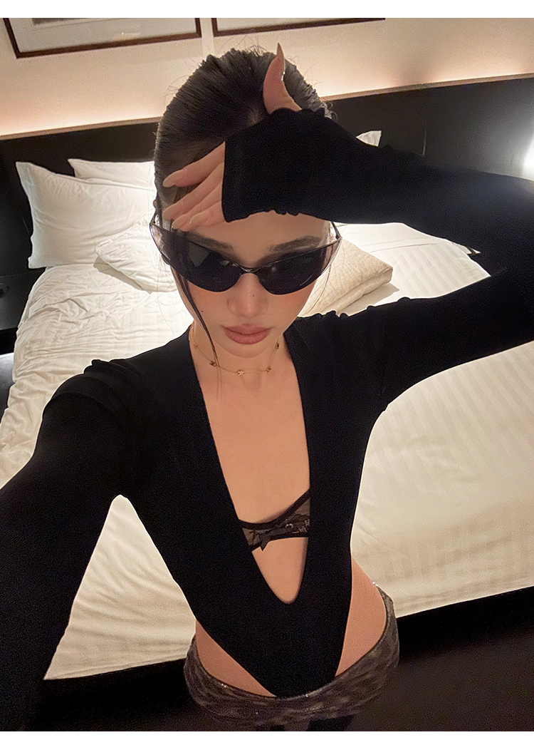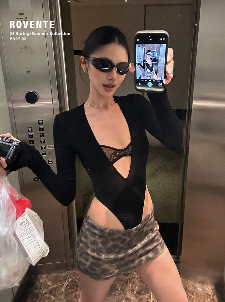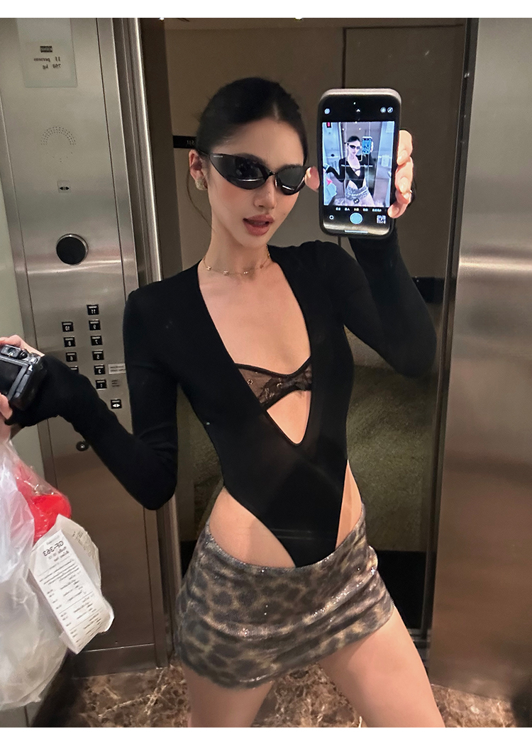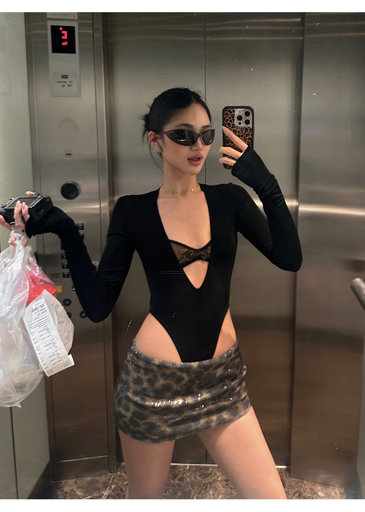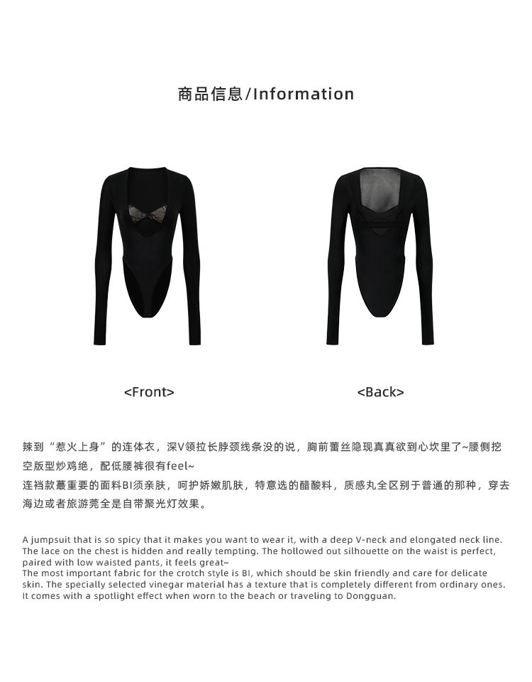 Rovente Zongqing Urban Black Long-Sleeved Jumpsuit Female Sexy Tight Lace V-Neck T-Shirt Top