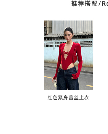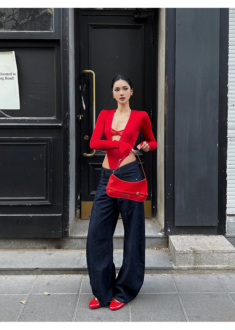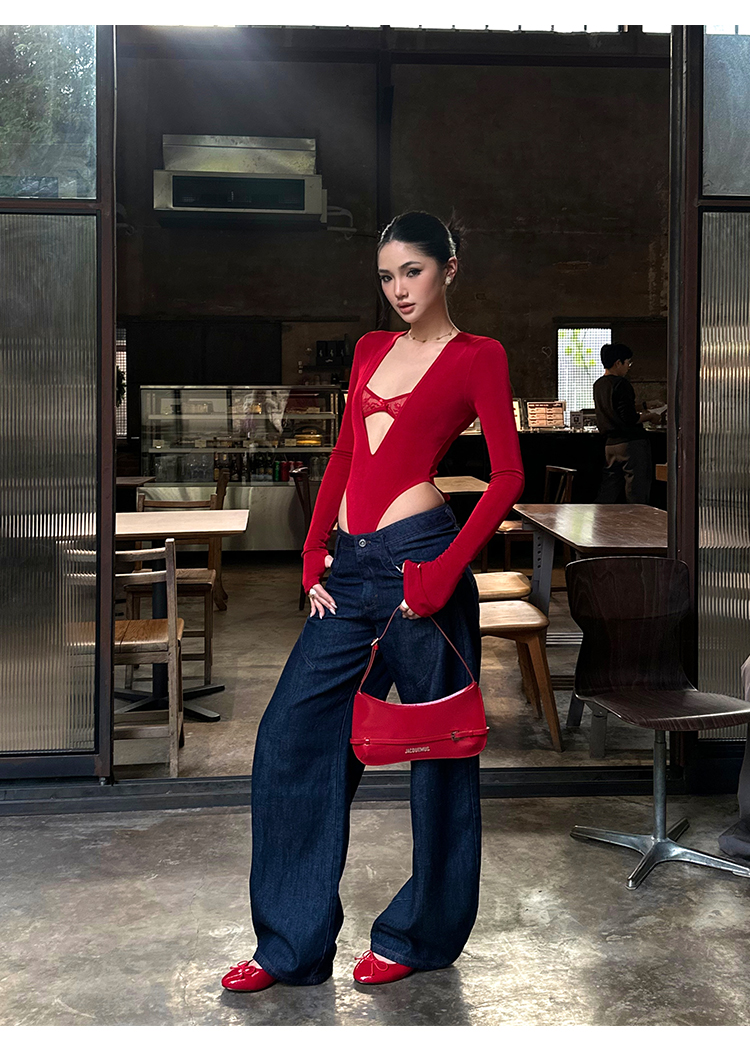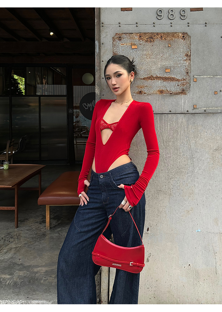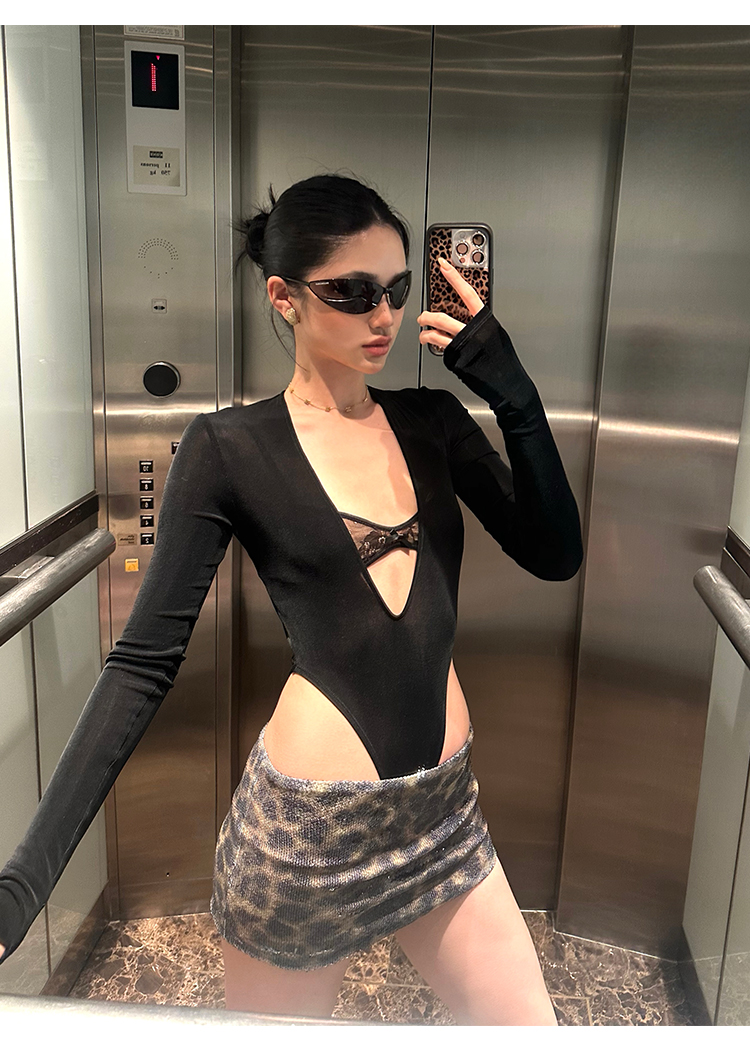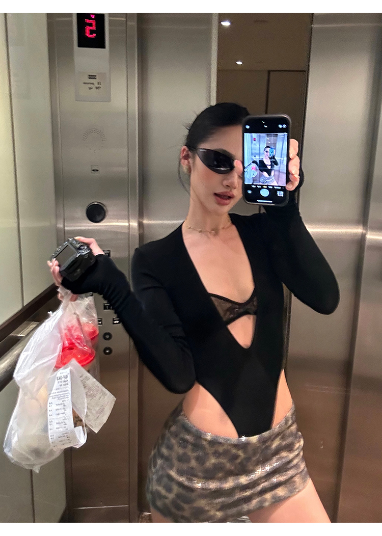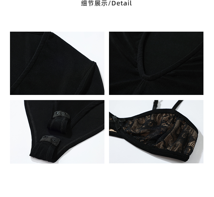 Rovente Zongqing Urban Black Long-Sleeved Jumpsuit Female Sexy Tight Lace V-Neck T-Shirt Top