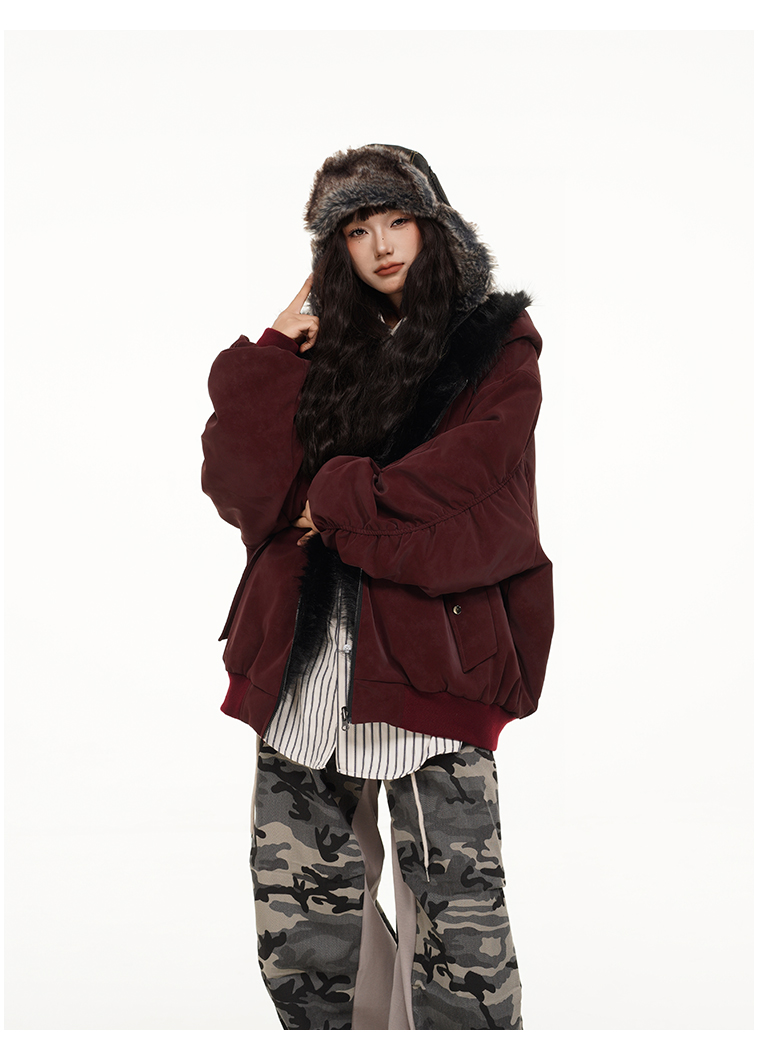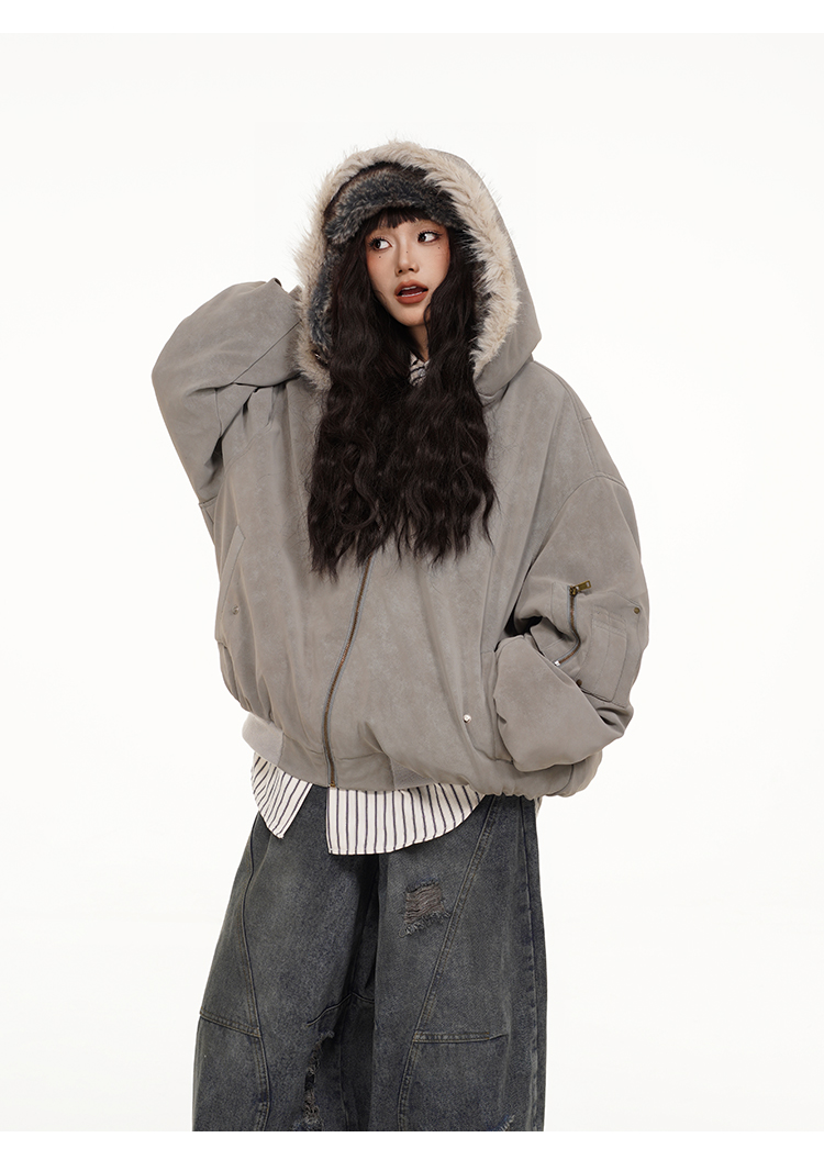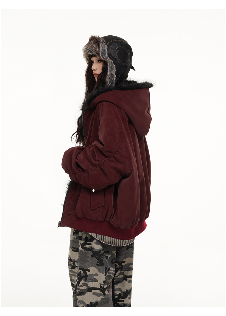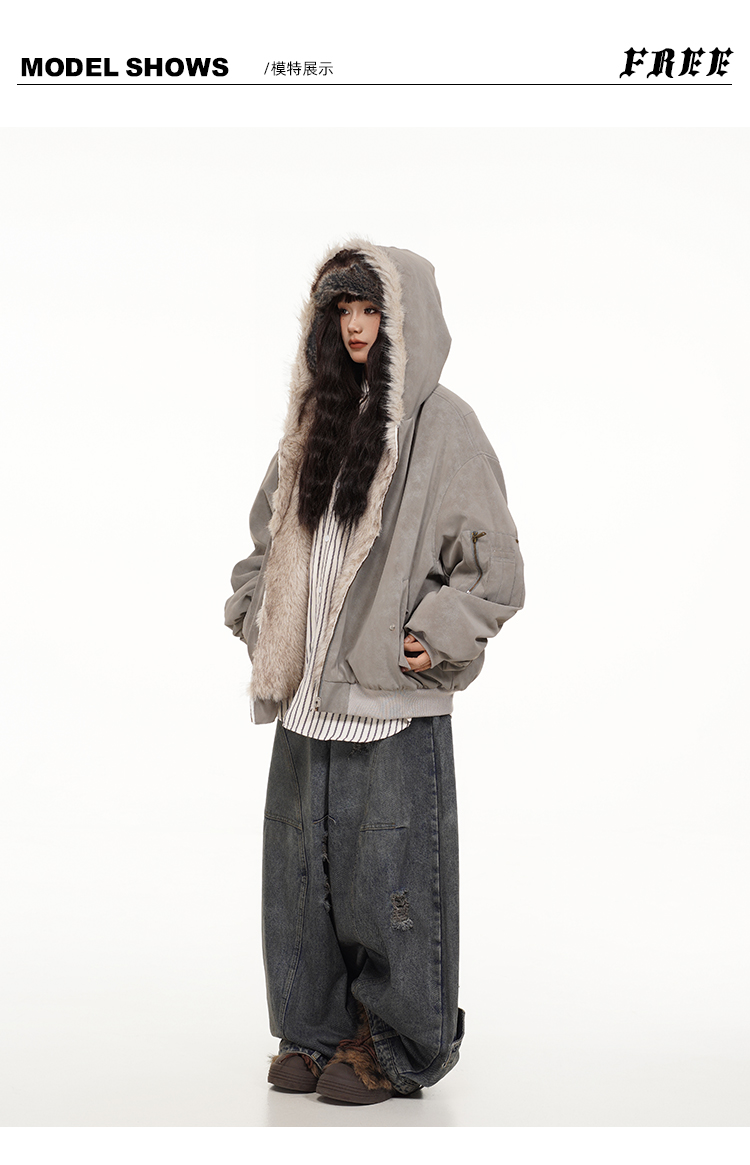 Free Center Reversible Mountain Carving Unisex Flight Jacket Thickened Warm Loose Hooded Coat