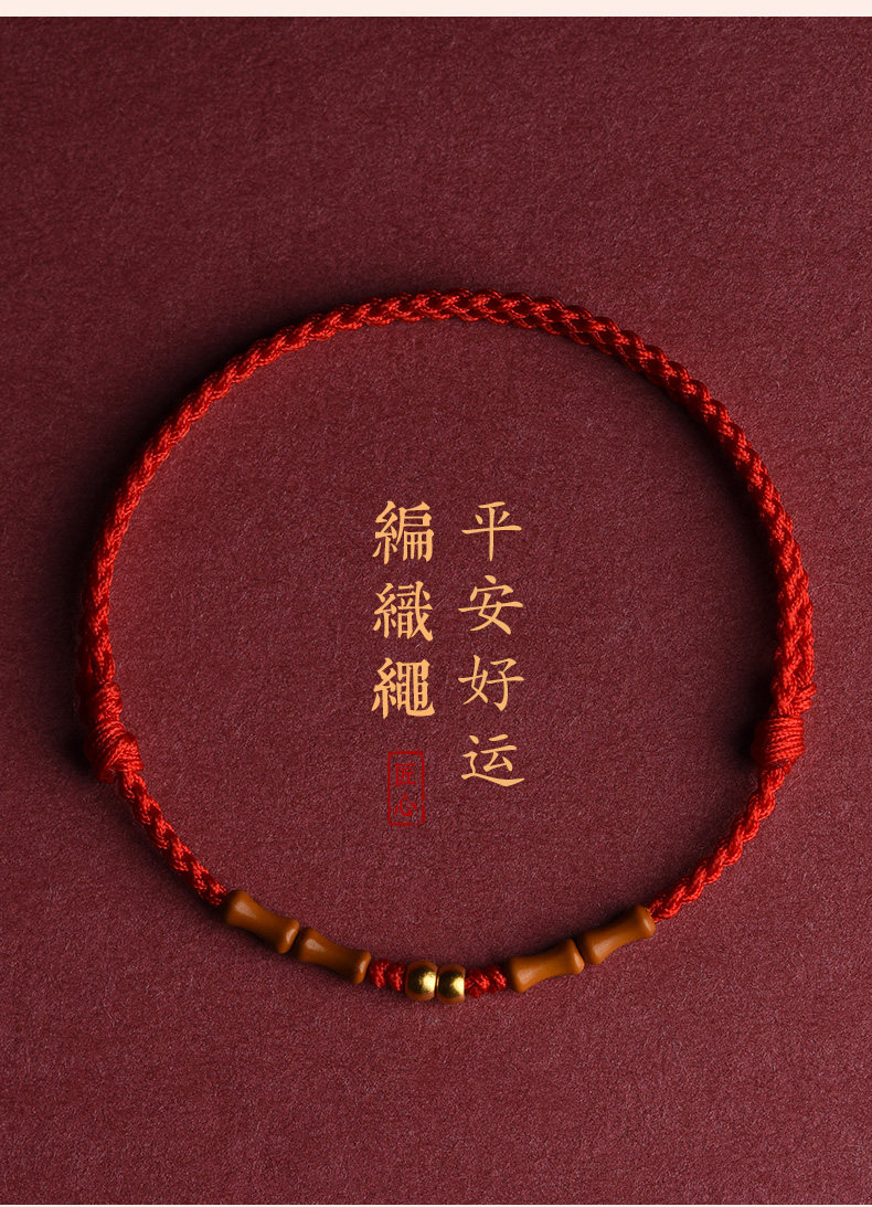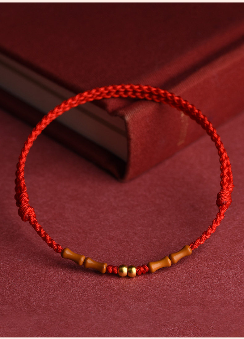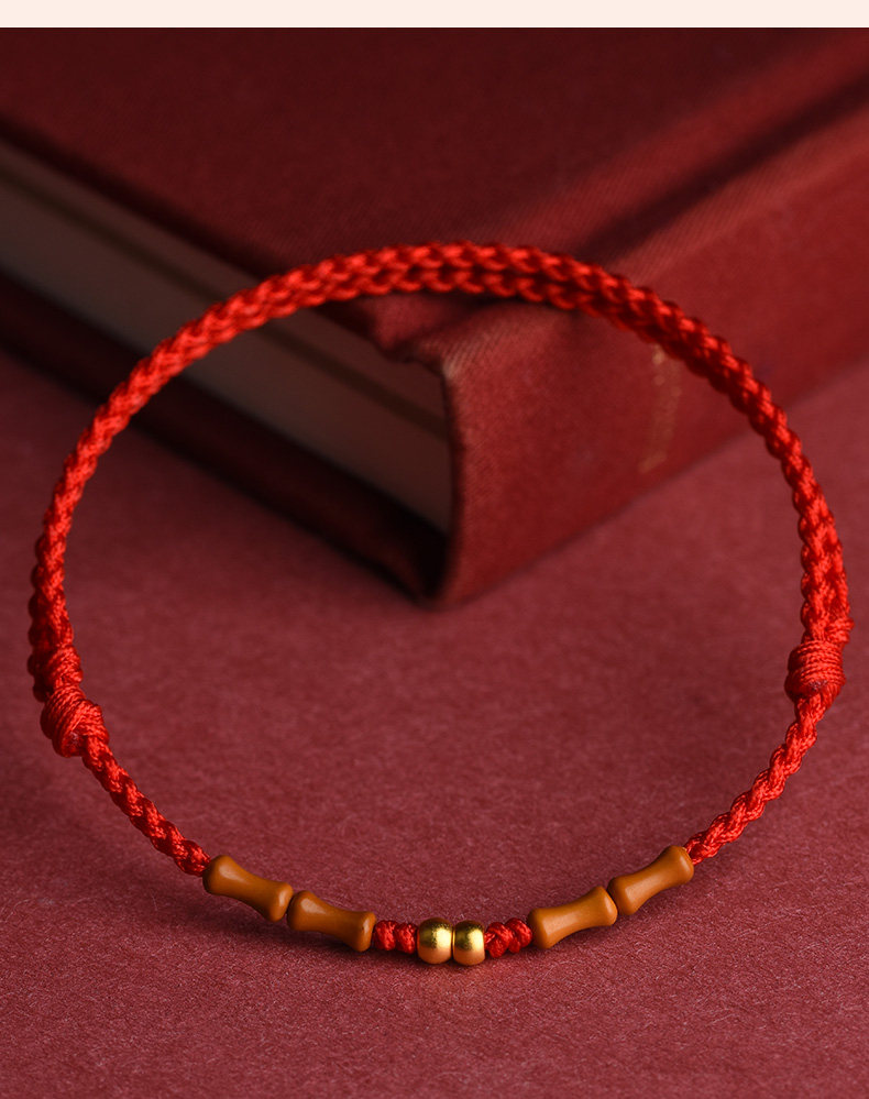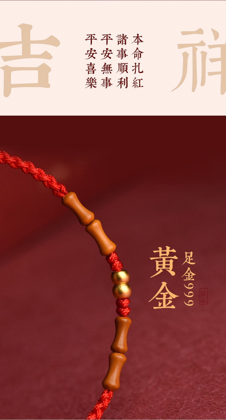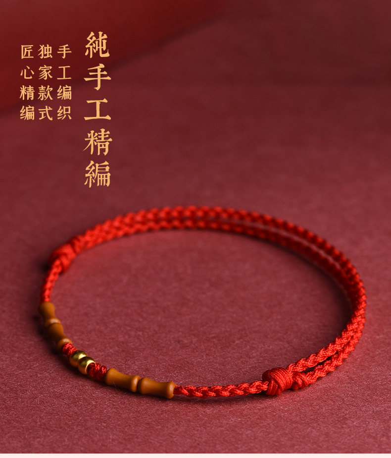 Putuo Mountain Cultural and Creative Products 999 Pure Gold Fortune Beads Red String Anklet for Men and Women, Peach Wood Bamboo Knots for the Year of Birth, Good Luck and Safety