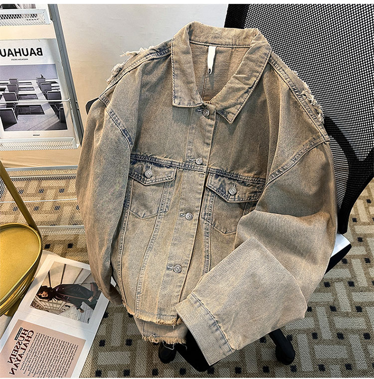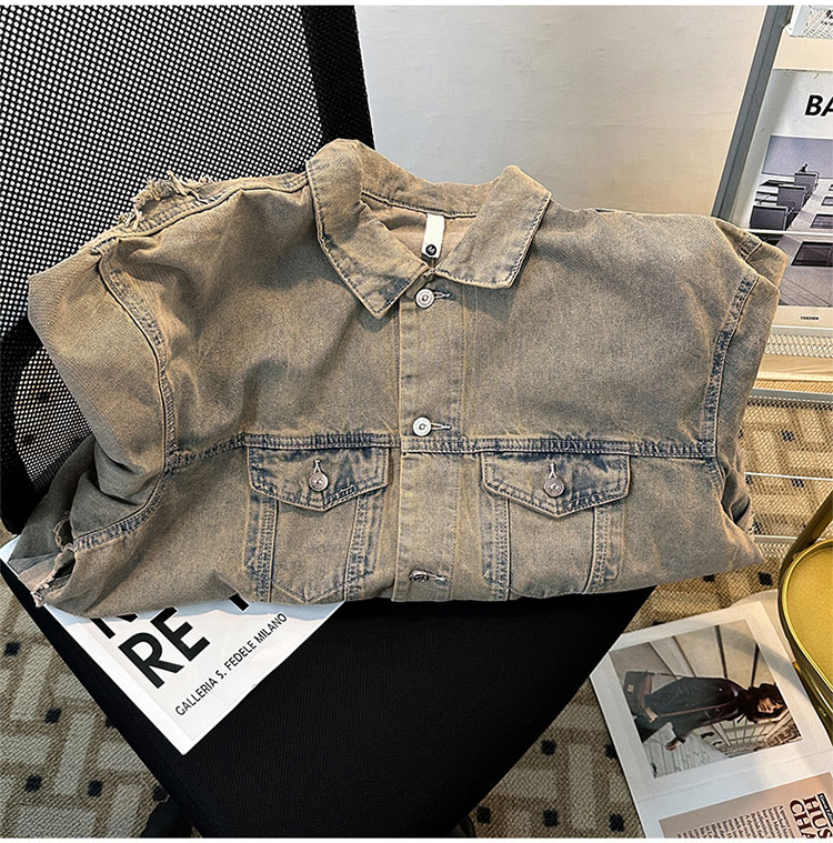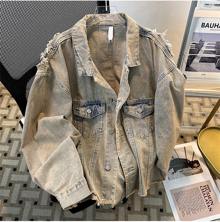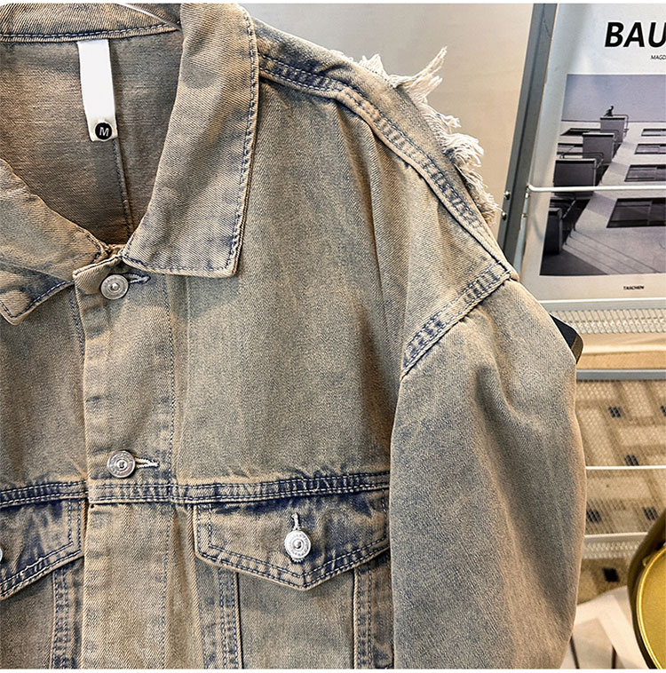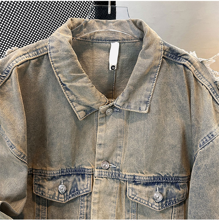 Spring and Autumn Ripped Denim Jacket for Men, Frayed Edges, Washed, Japanese Retro, American Style, High-End, Cool and Loose, Distressed Jacket