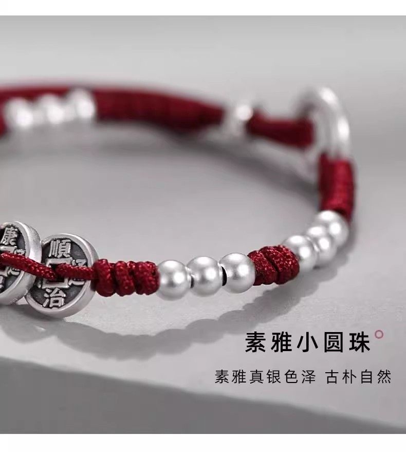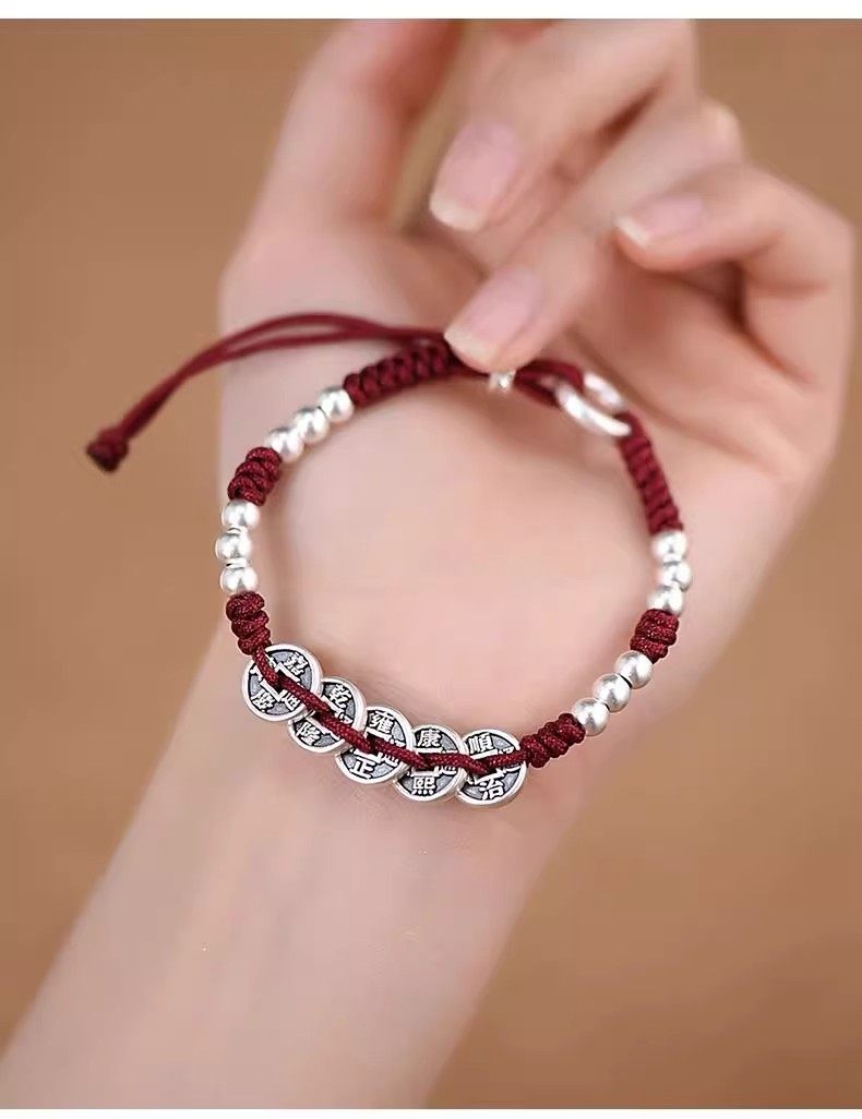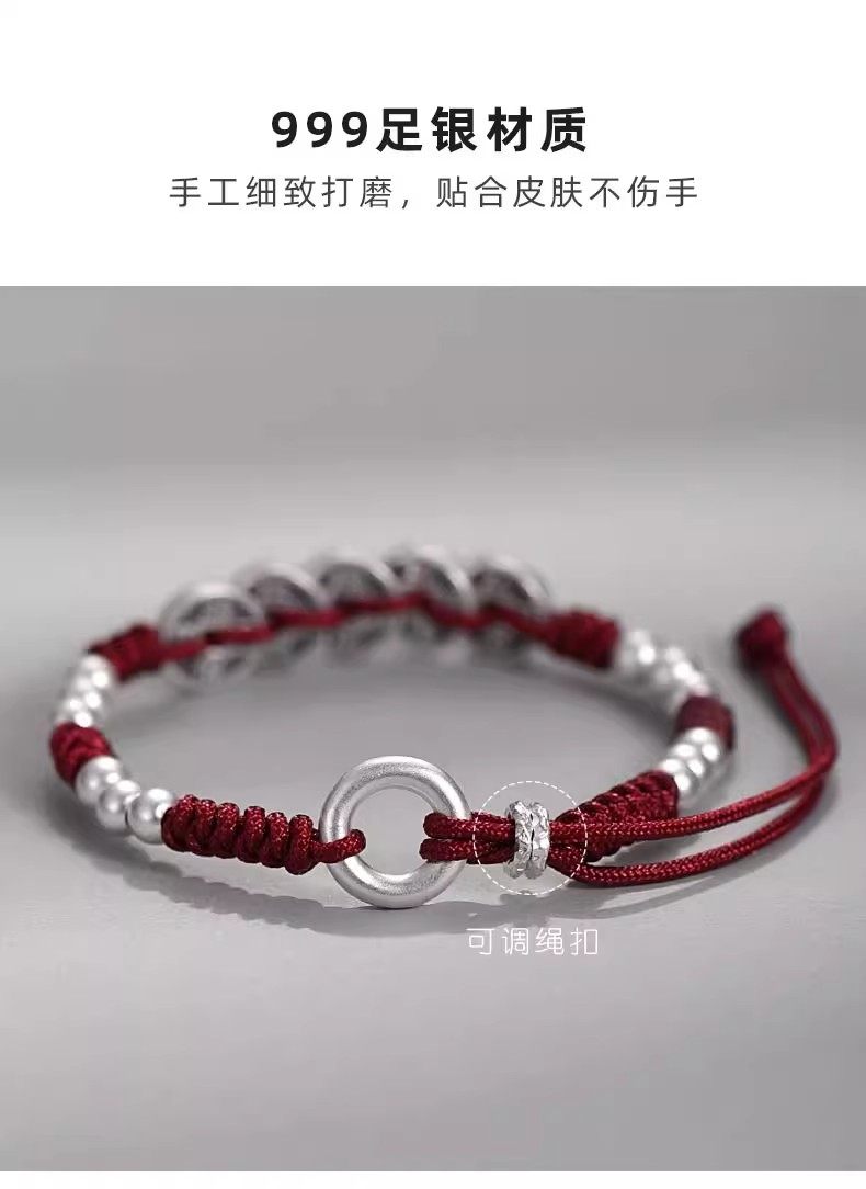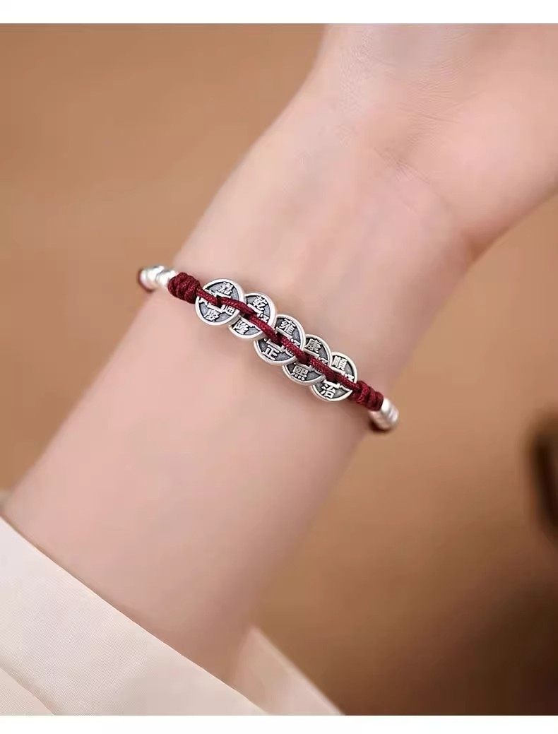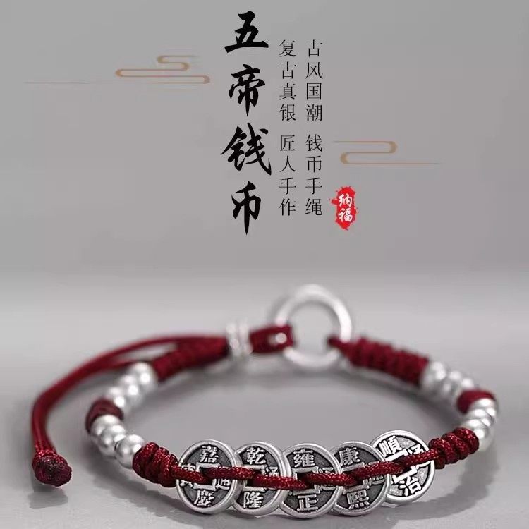 S999 Pure Silver Five Emperors Coin Bracelet for Men and Women, Peace Charm, 2026 Year of the Horse, Zodiac Year Red String, Vintage Style, Gift for Boyfriend