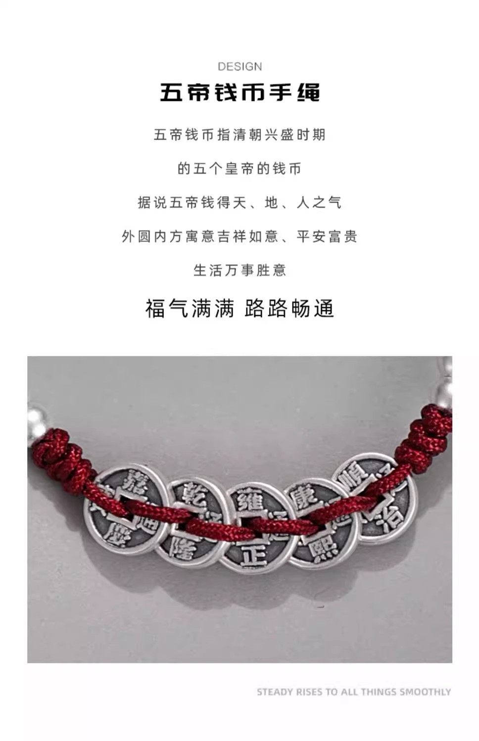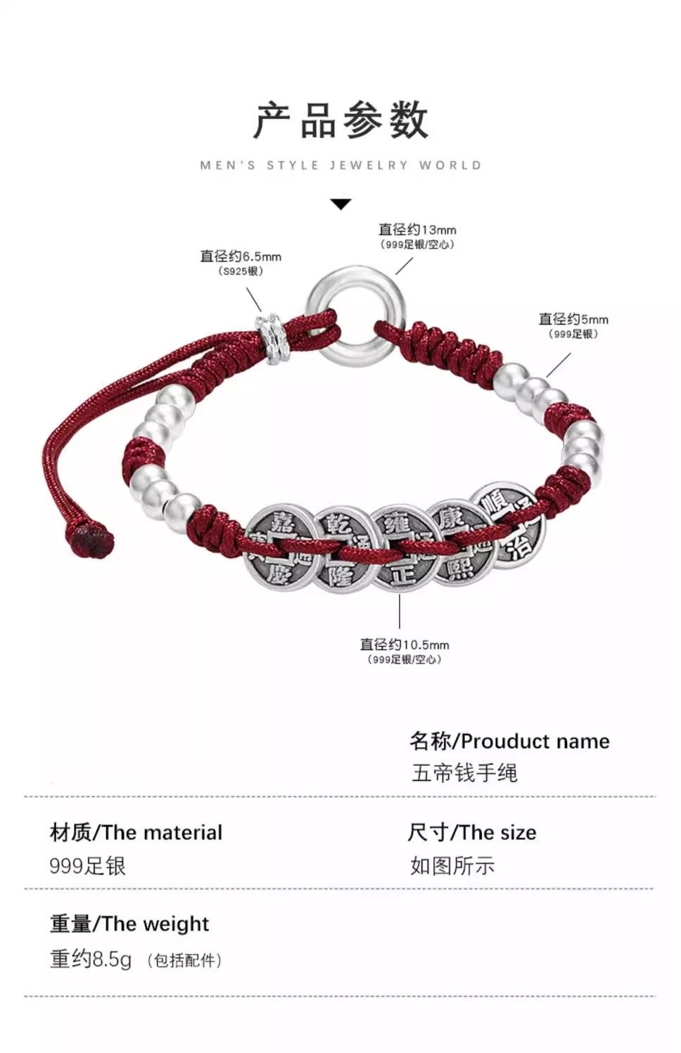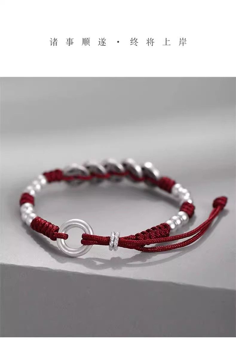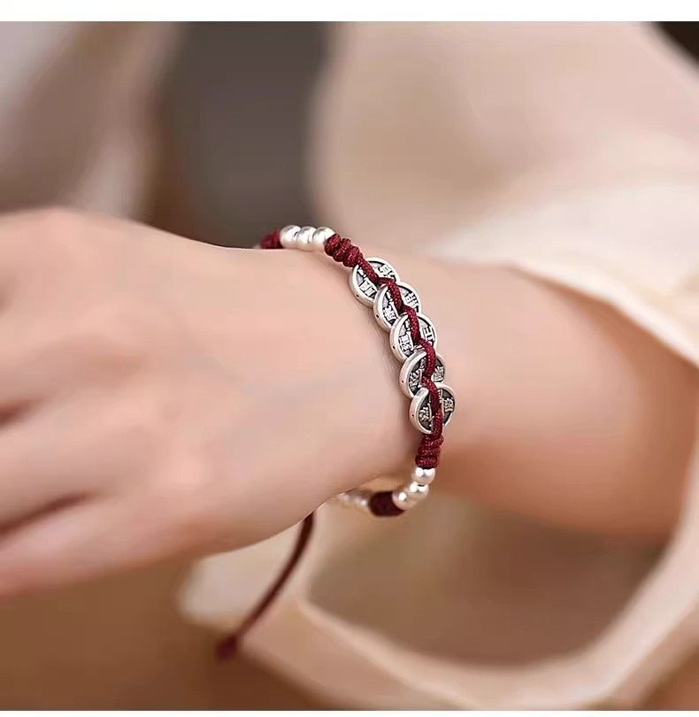 S999 Pure Silver Five Emperors Coin Bracelet for Men and Women, Peace Charm, 2026 Year of the Horse, Zodiac Year Red String, Vintage Style, Gift for Boyfriend