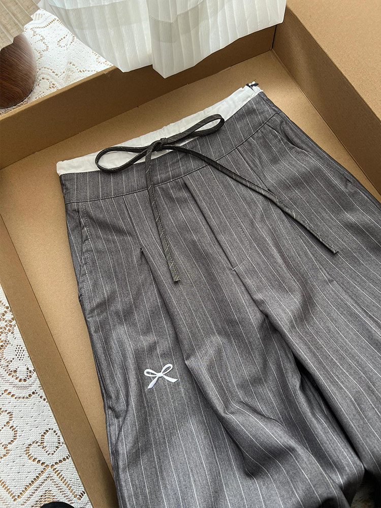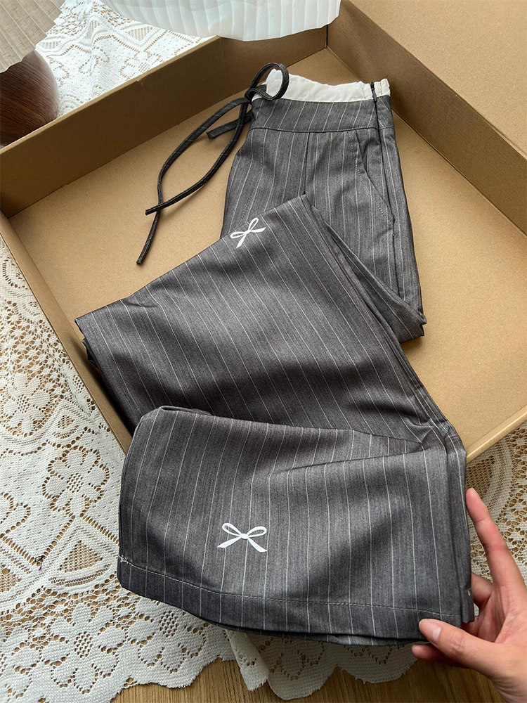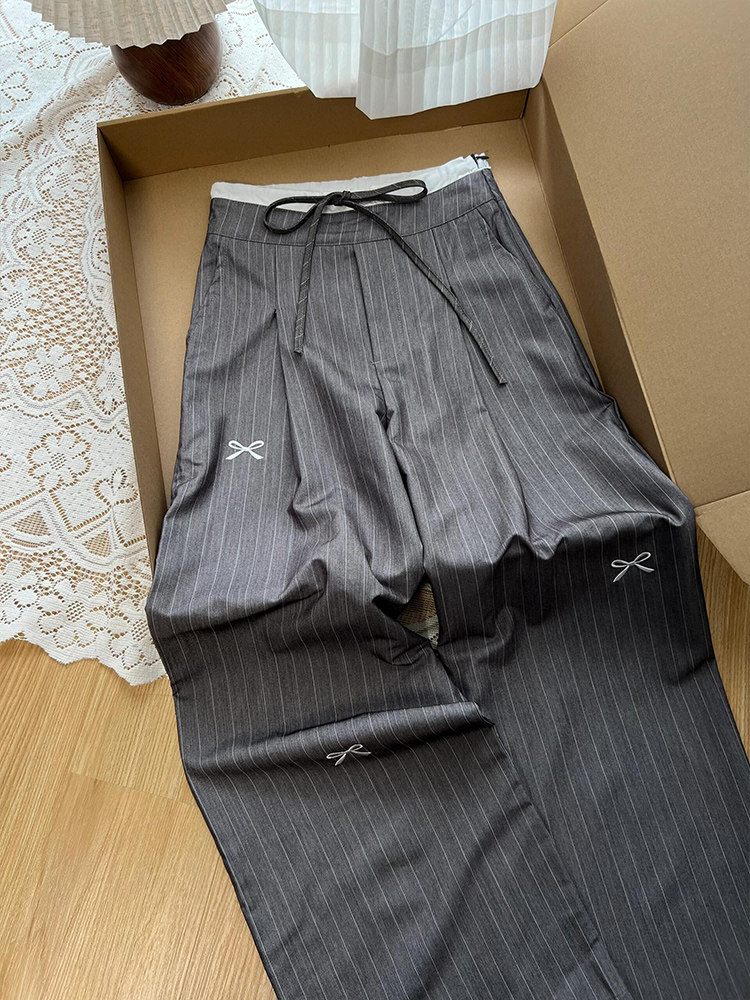 Sun Korean Style Gray Vertical Striped Suit Pants for Women, Spring 2025, Faux Two-Piece with Bow Embroidery, Casual Long Pants