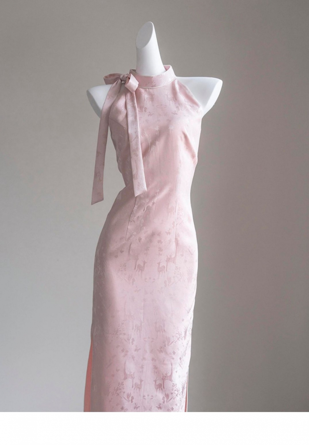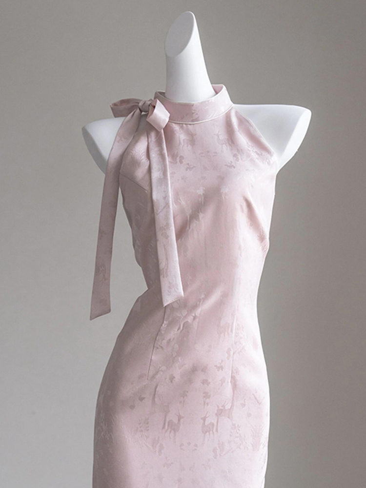2025 Summer New Chinese-Style Pink Dress with a High-End Feel, Sexy and Alluring Halter Neck Engagement Dress Cheongsam Dress