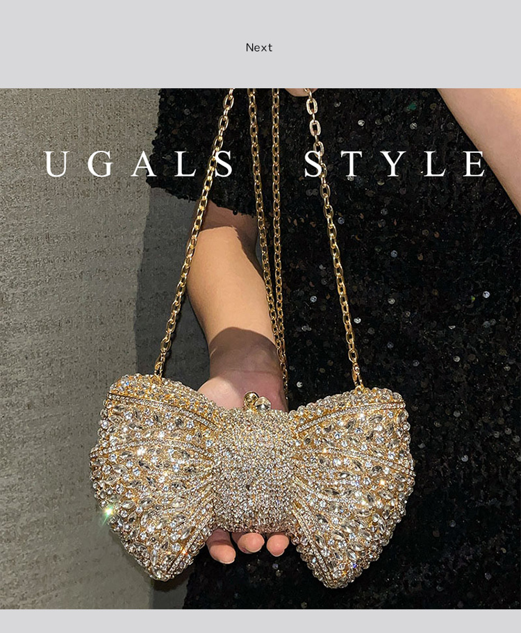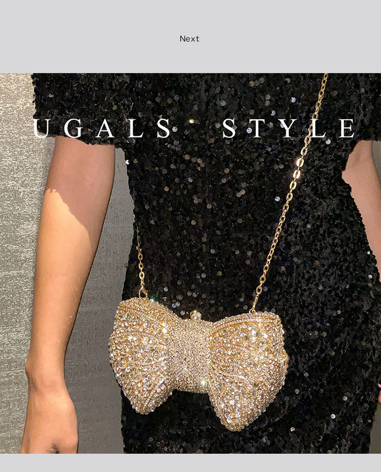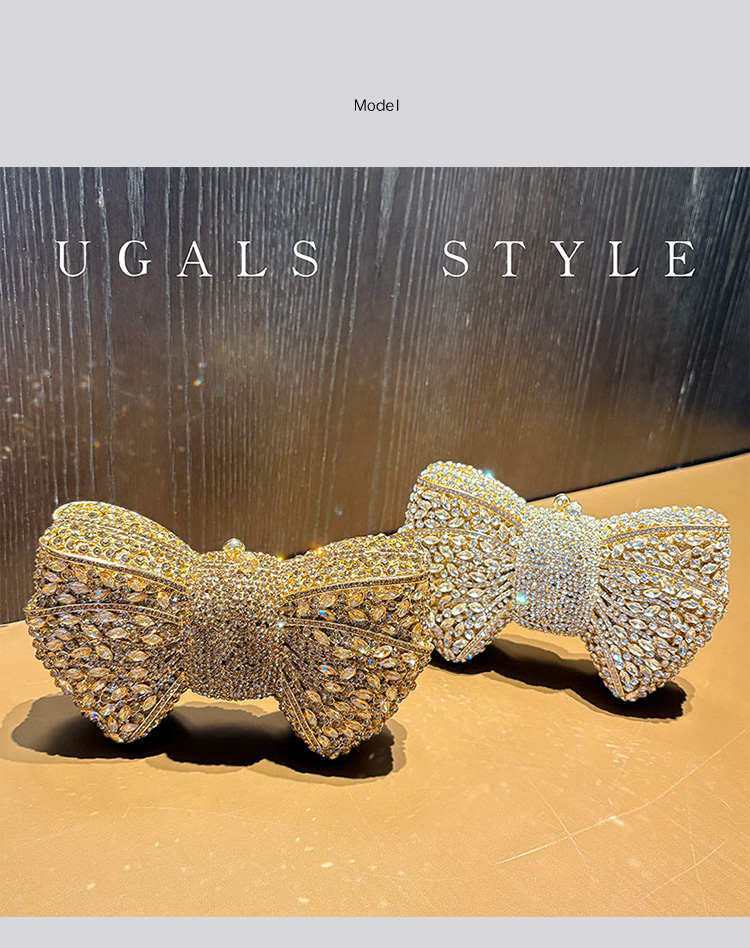 Ugals French-Style Light Luxury Diamond-Encrusted Bow Full Rhinestone Box Shiny Evening Party Clutch Crossbody Bag