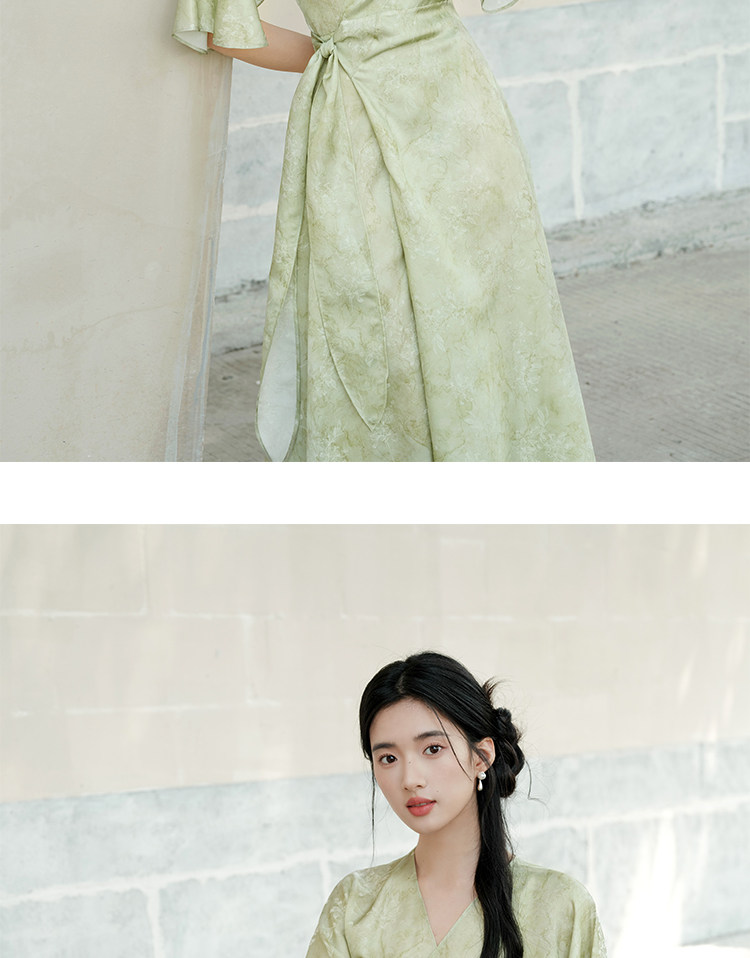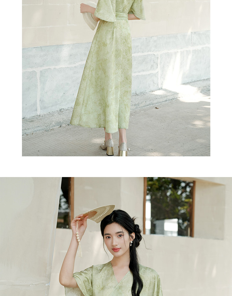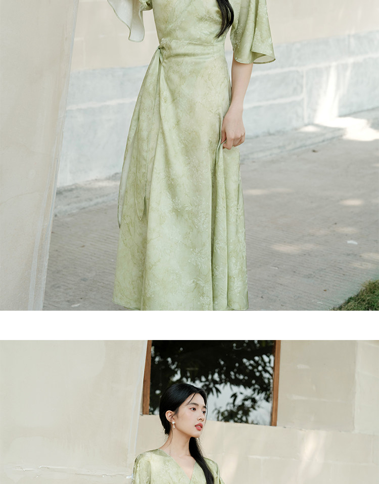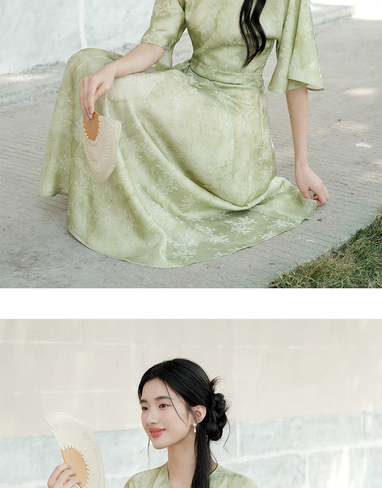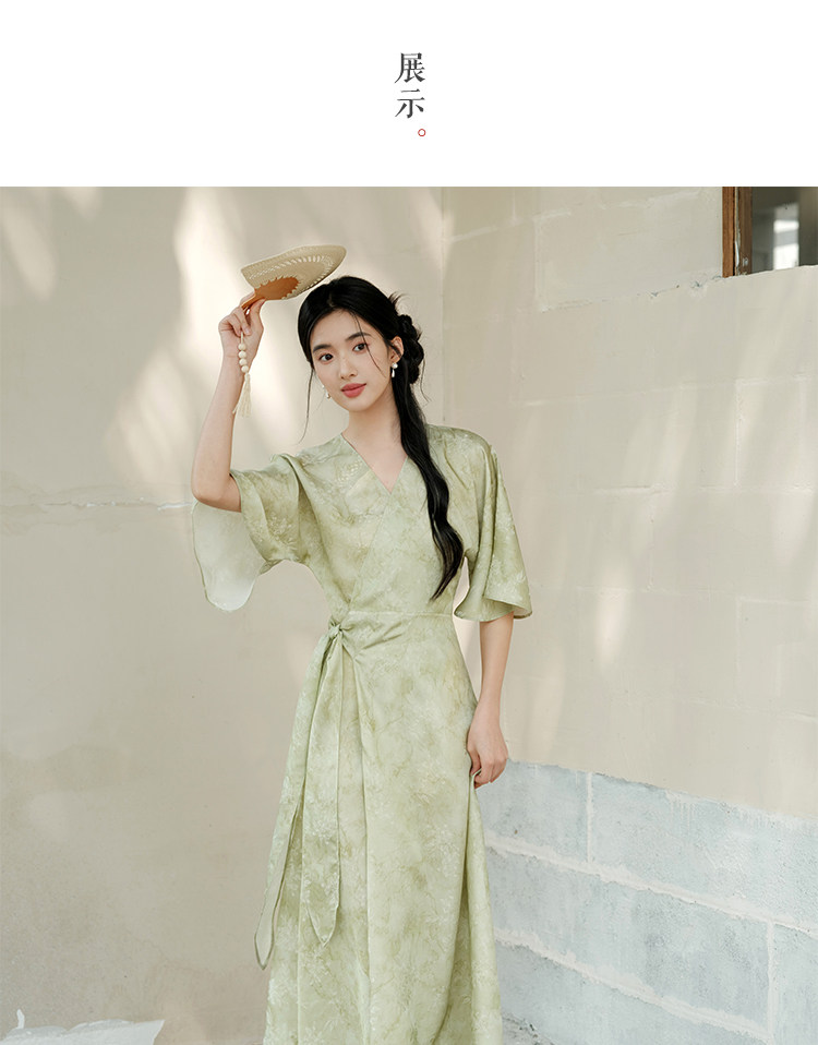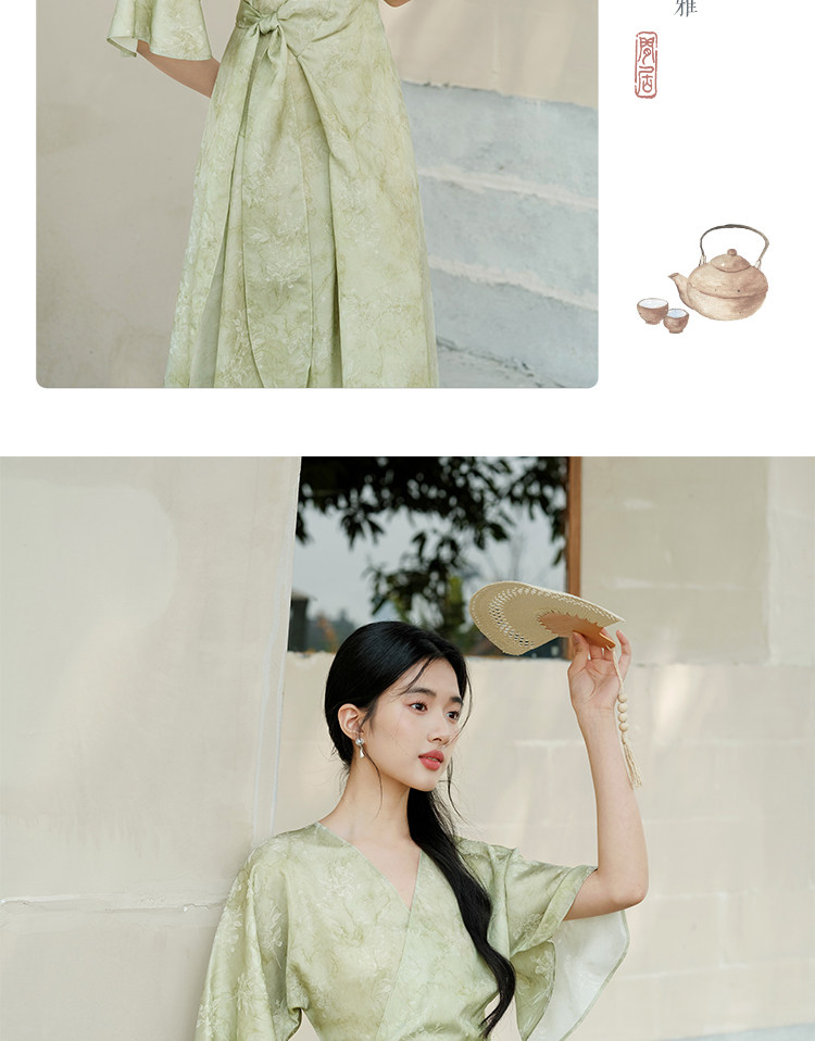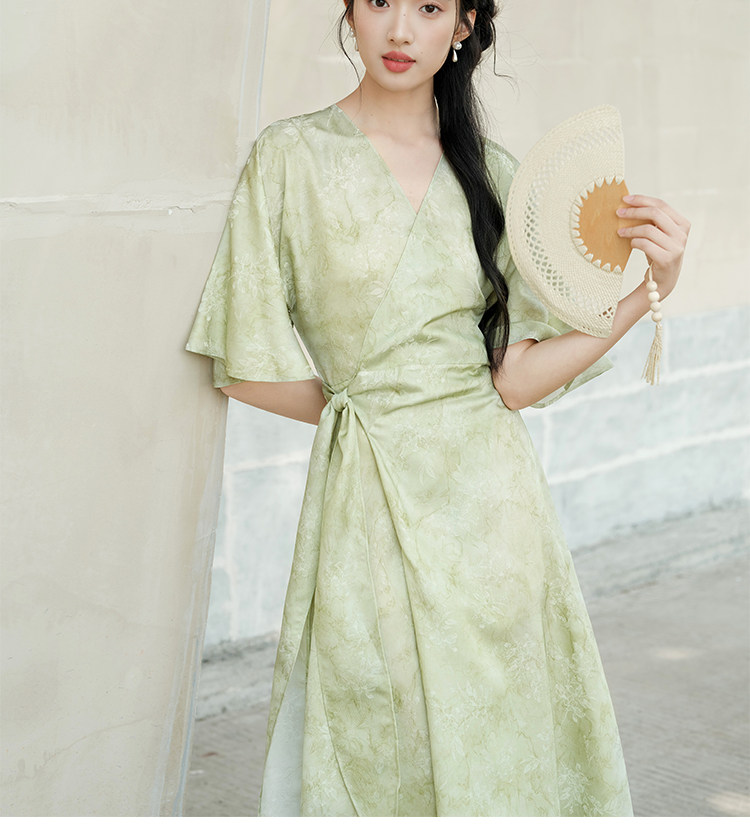 Chu Chan New Chinese Style Hanfu Dress for Women 2025 Summer Chinese Style Wide Sleeve Jacquard Green Elegant Tie-Up Long Dress