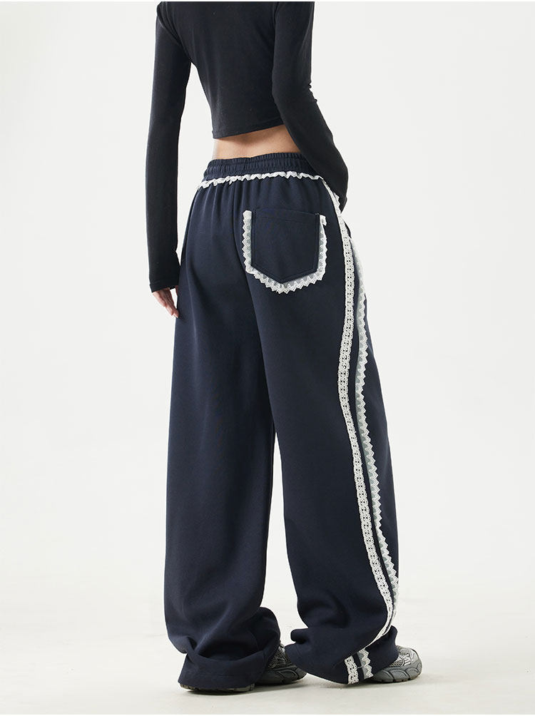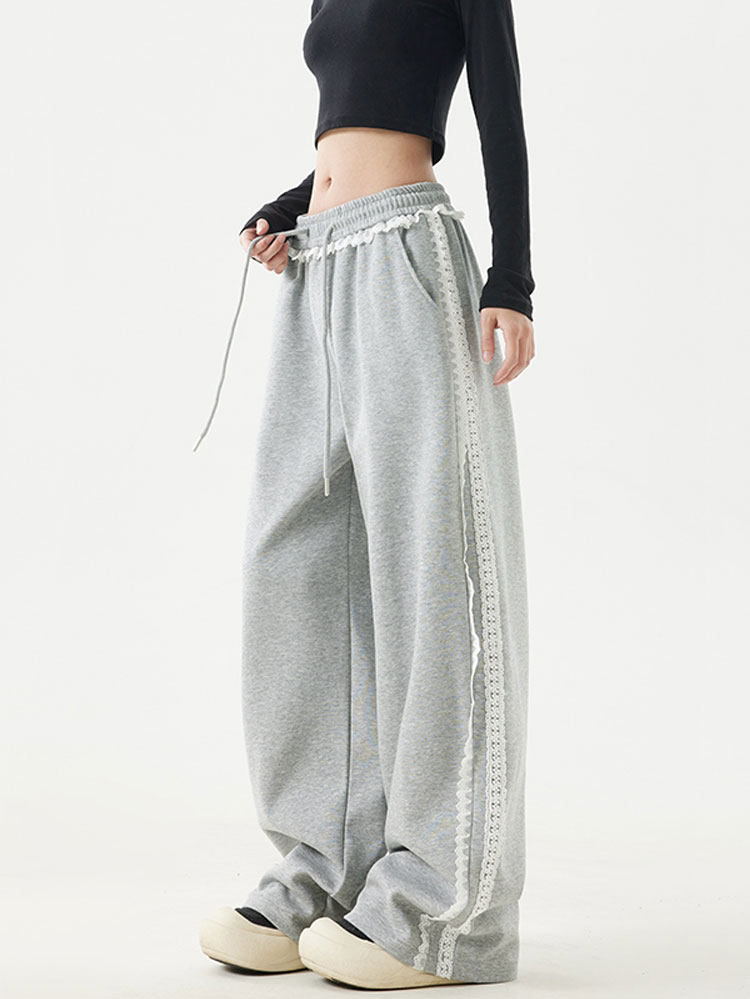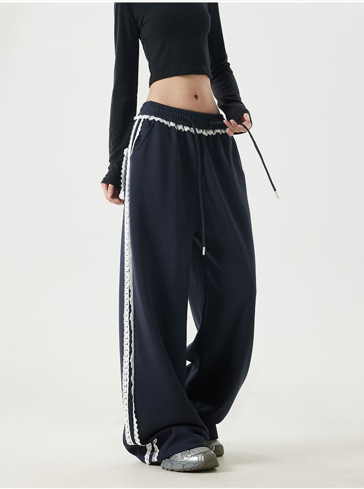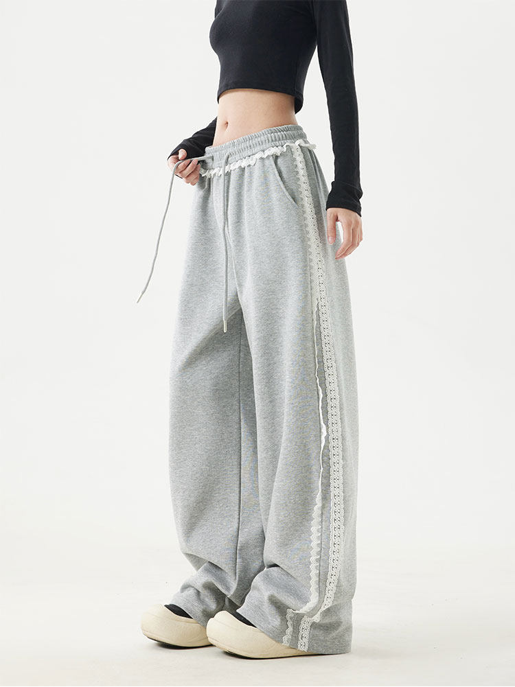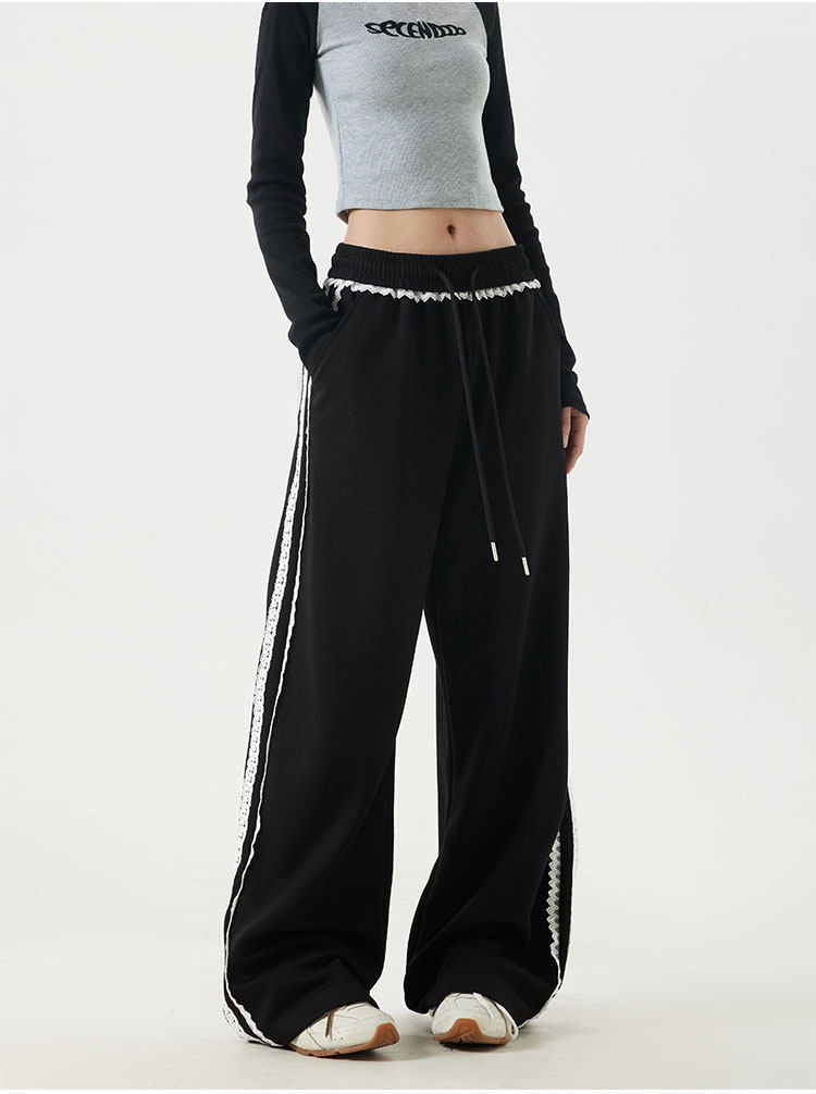2025 Spring Cotton Straight-Leg Sweatpants, Spring Pants, Loose Casual Lace-Trimmed American-Style Patchwork Sports Pants