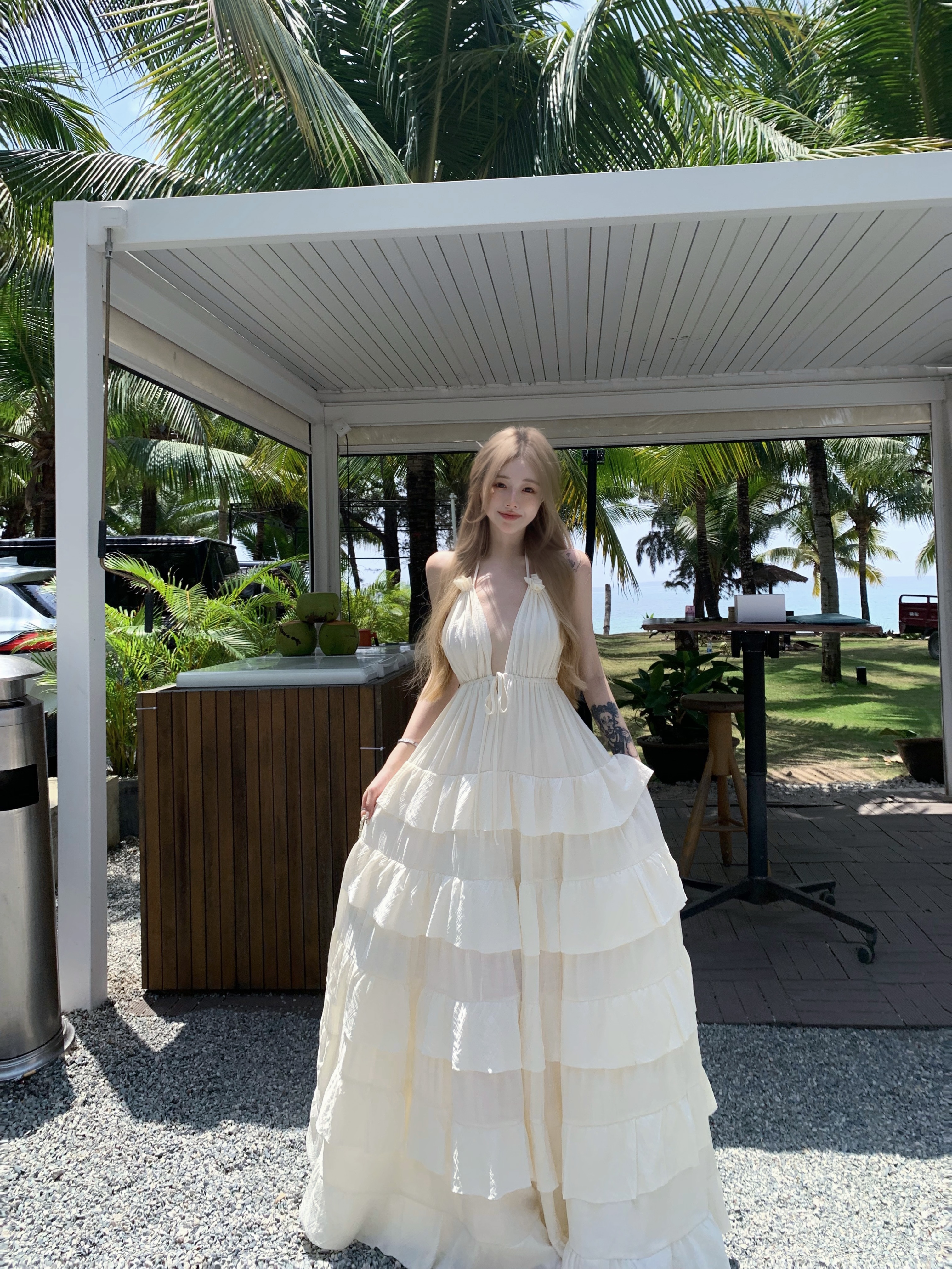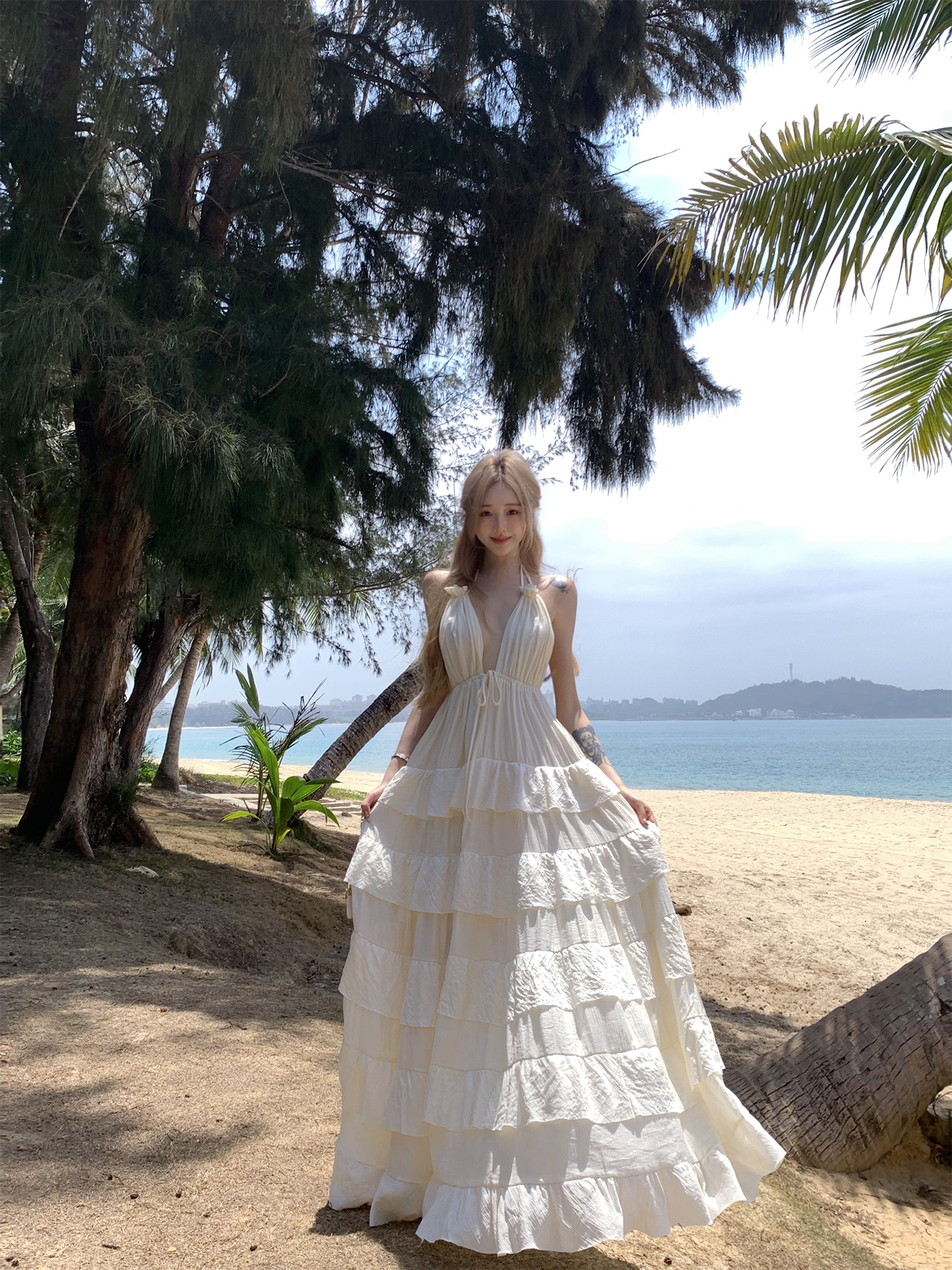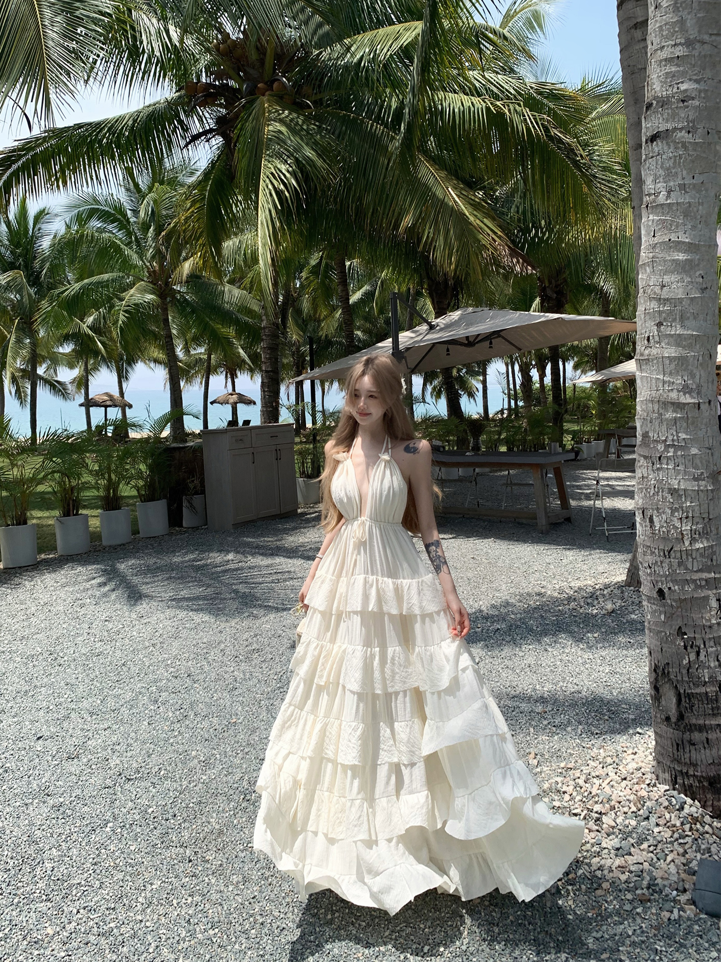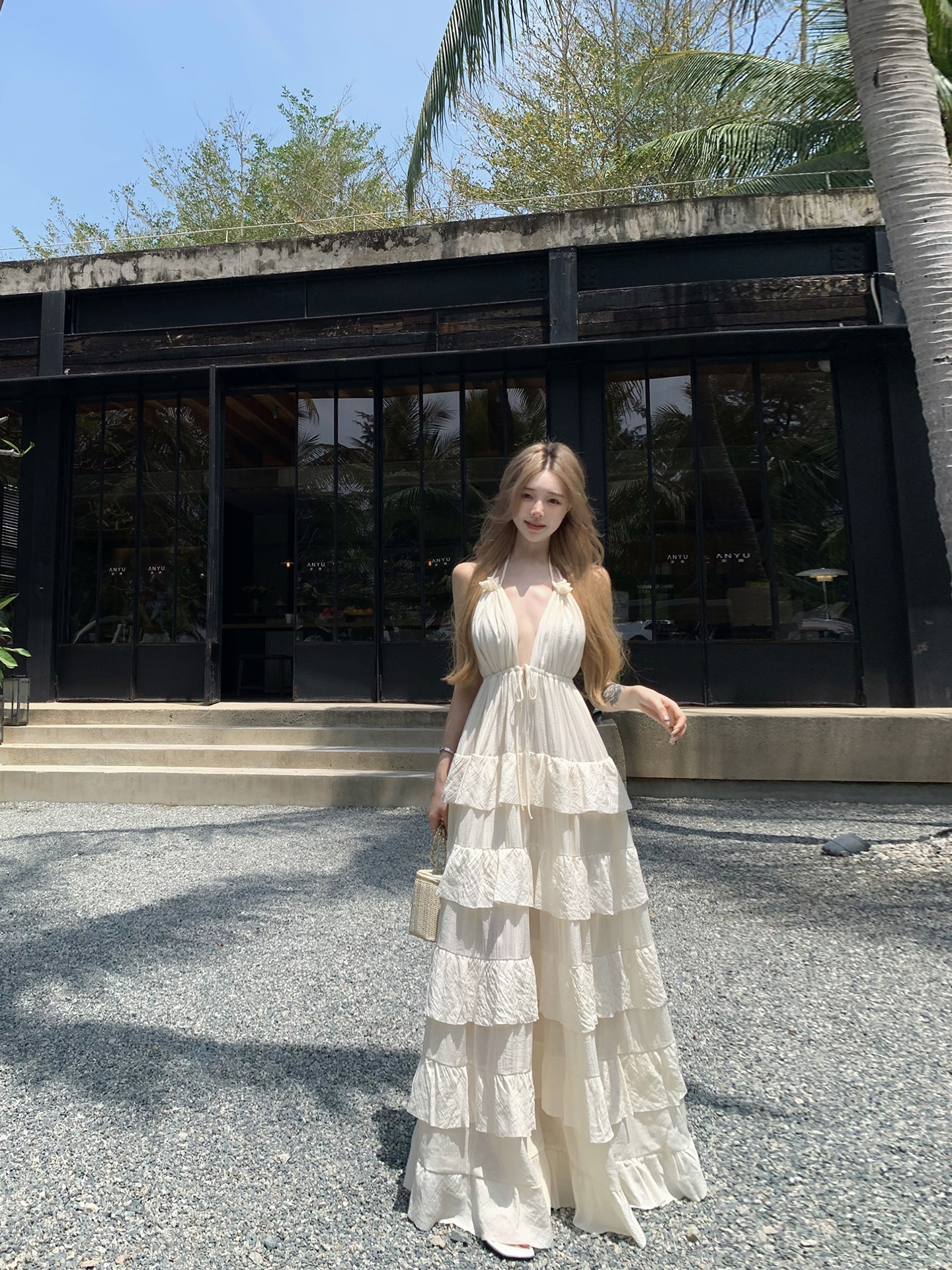 Thai Yunnan Seaside Resort Cotton and Linen V-Neck Halter Dress Fairy-Like Sexy Backless Ruffled Tiered Long Dress