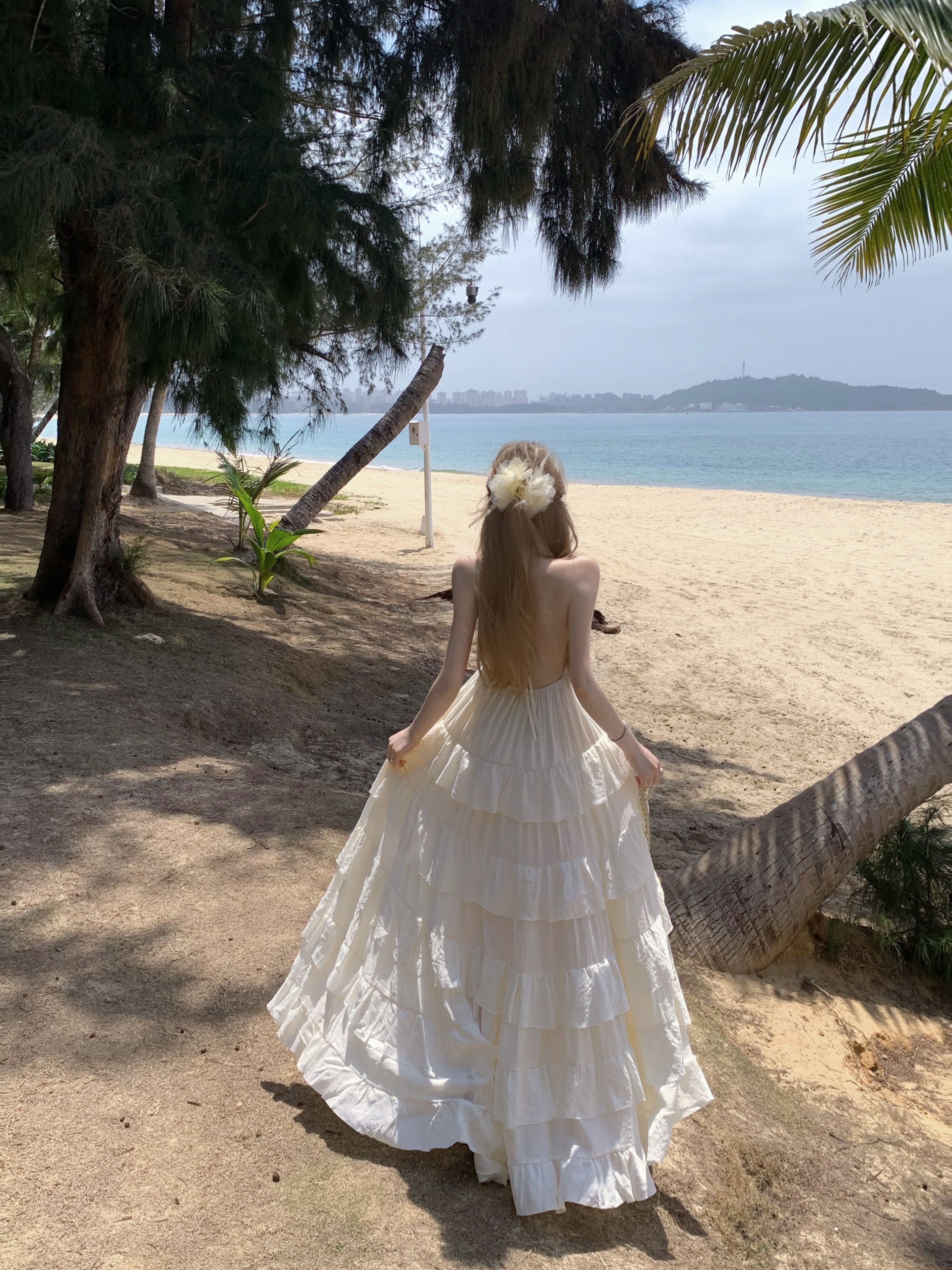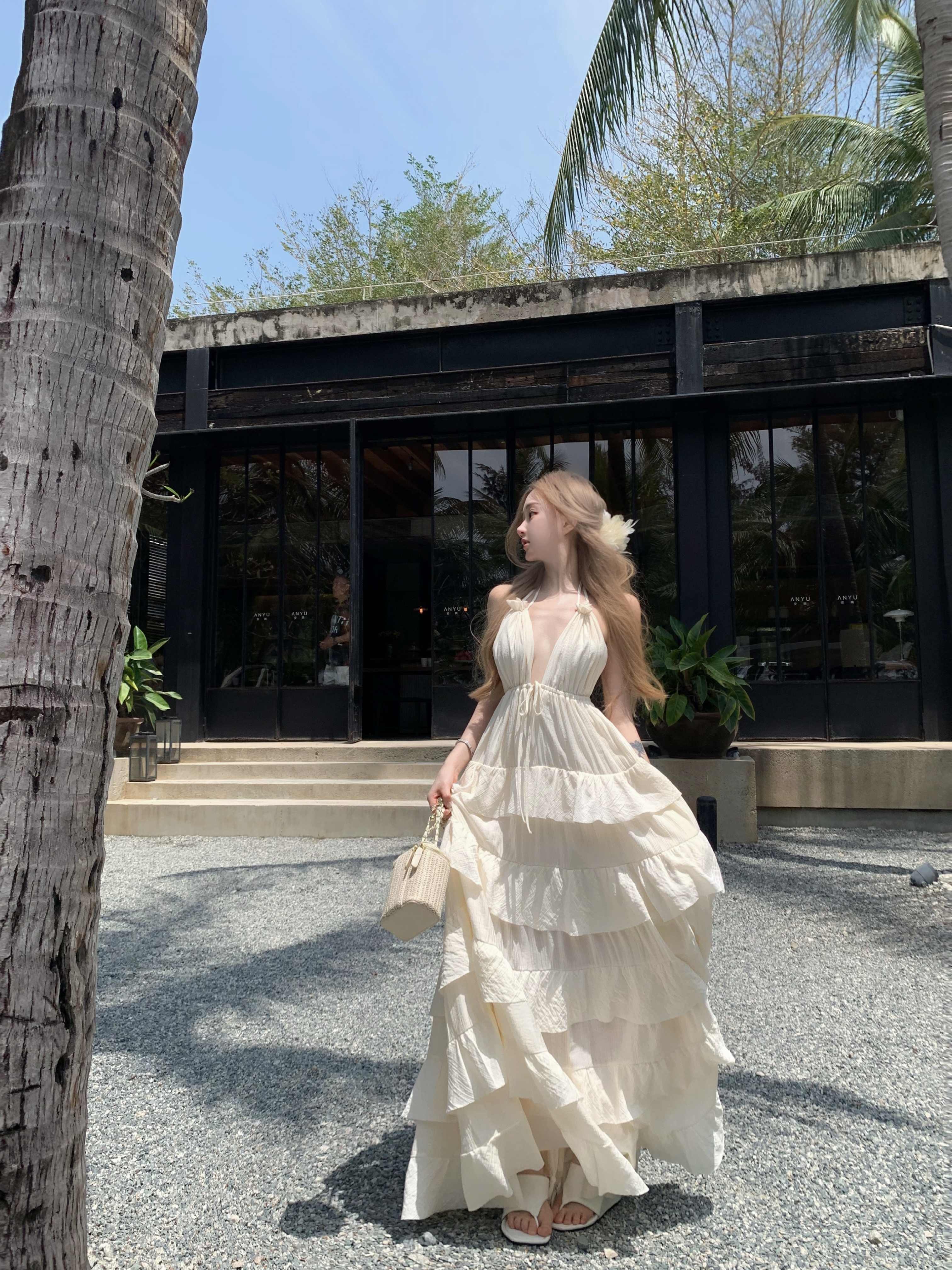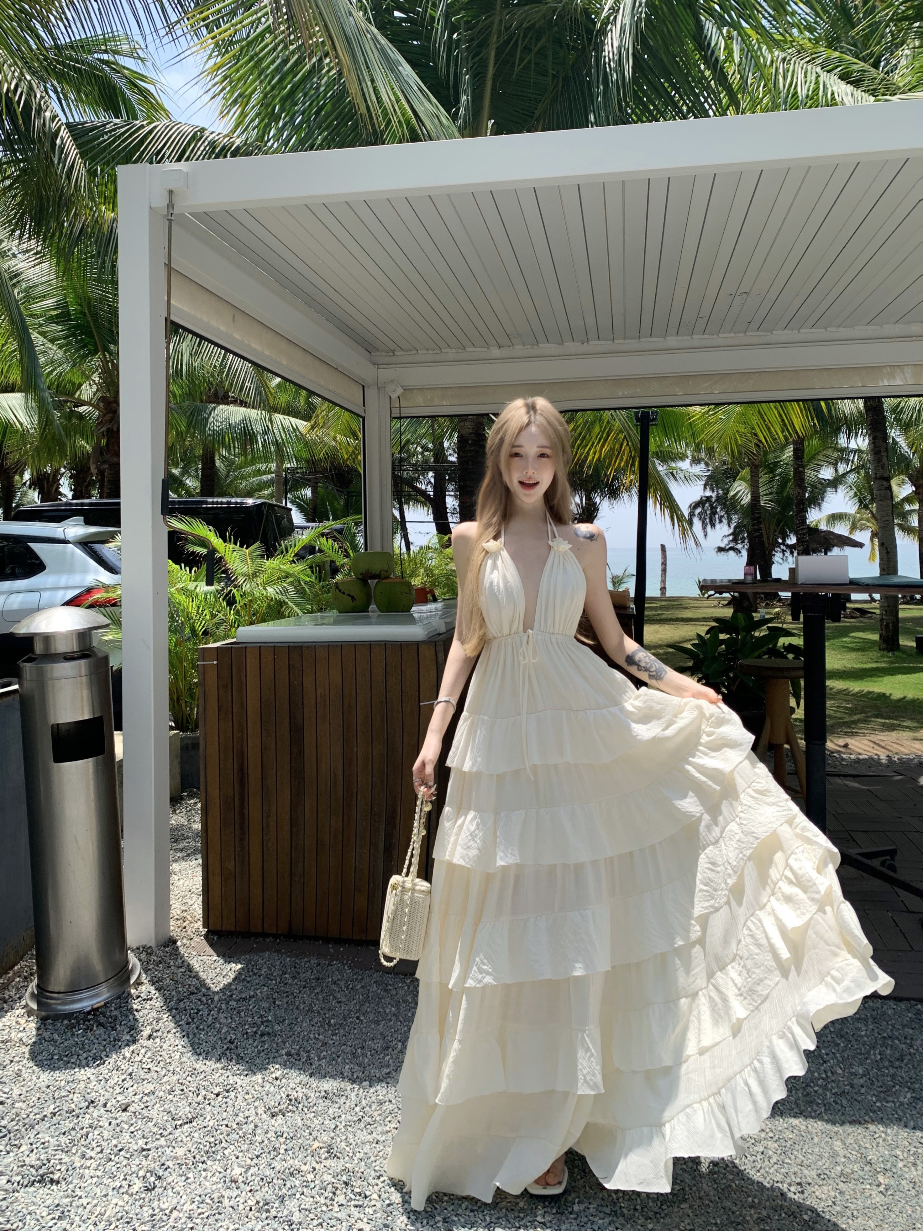 Thai Yunnan Seaside Resort Cotton and Linen V-Neck Halter Dress Fairy-Like Sexy Backless Ruffled Tiered Long Dress