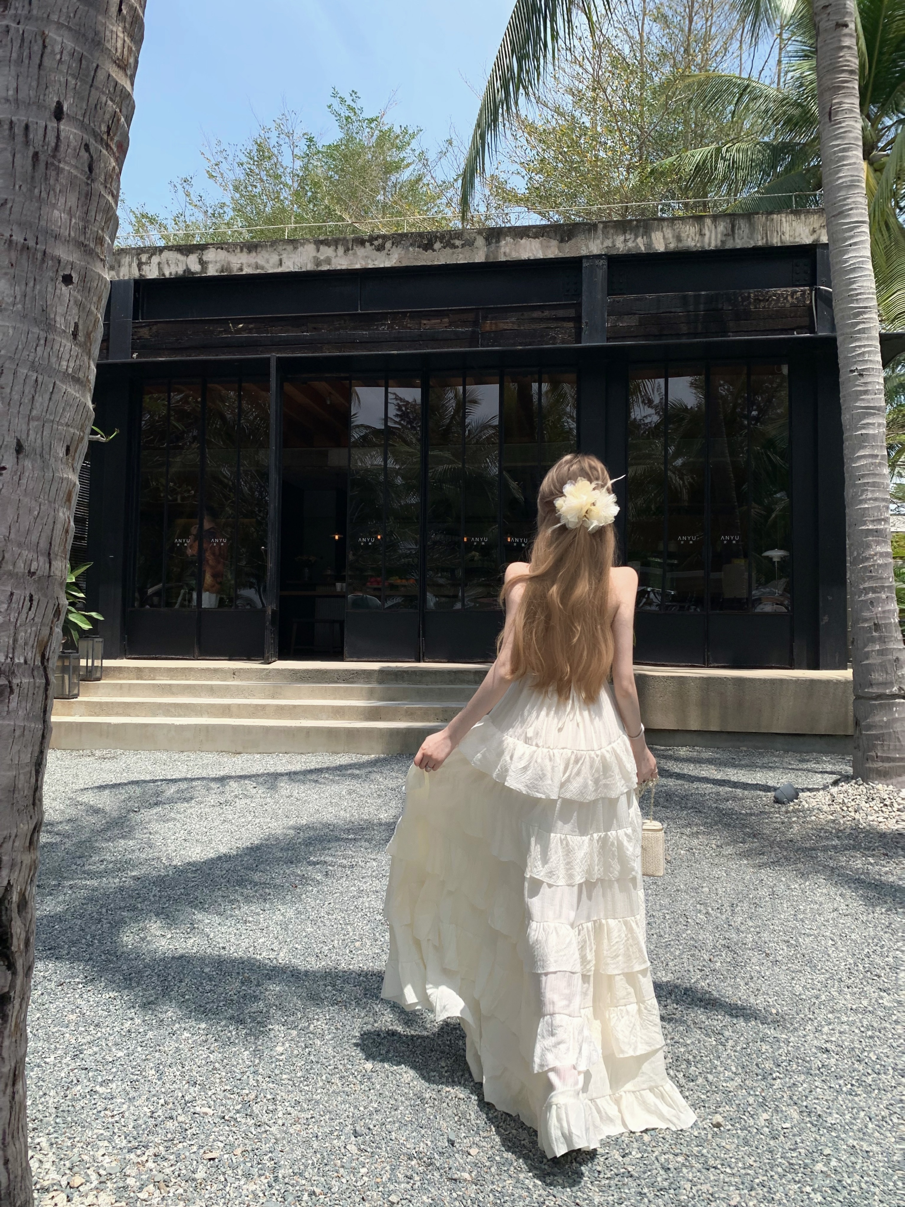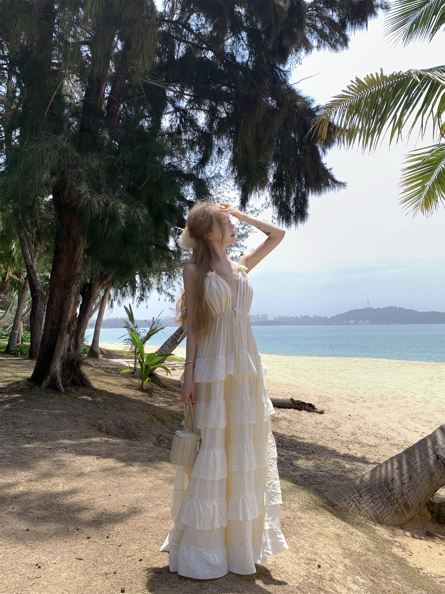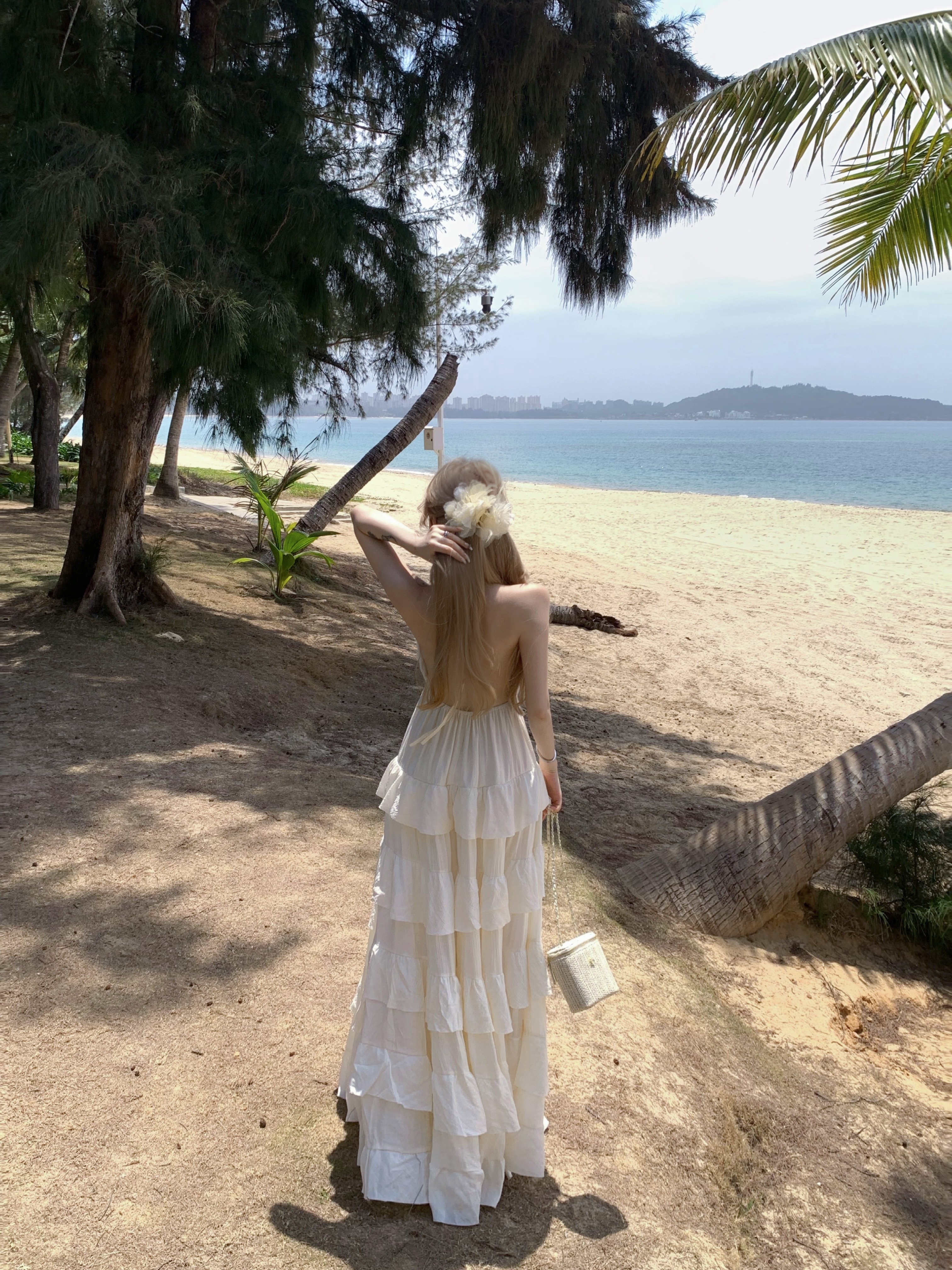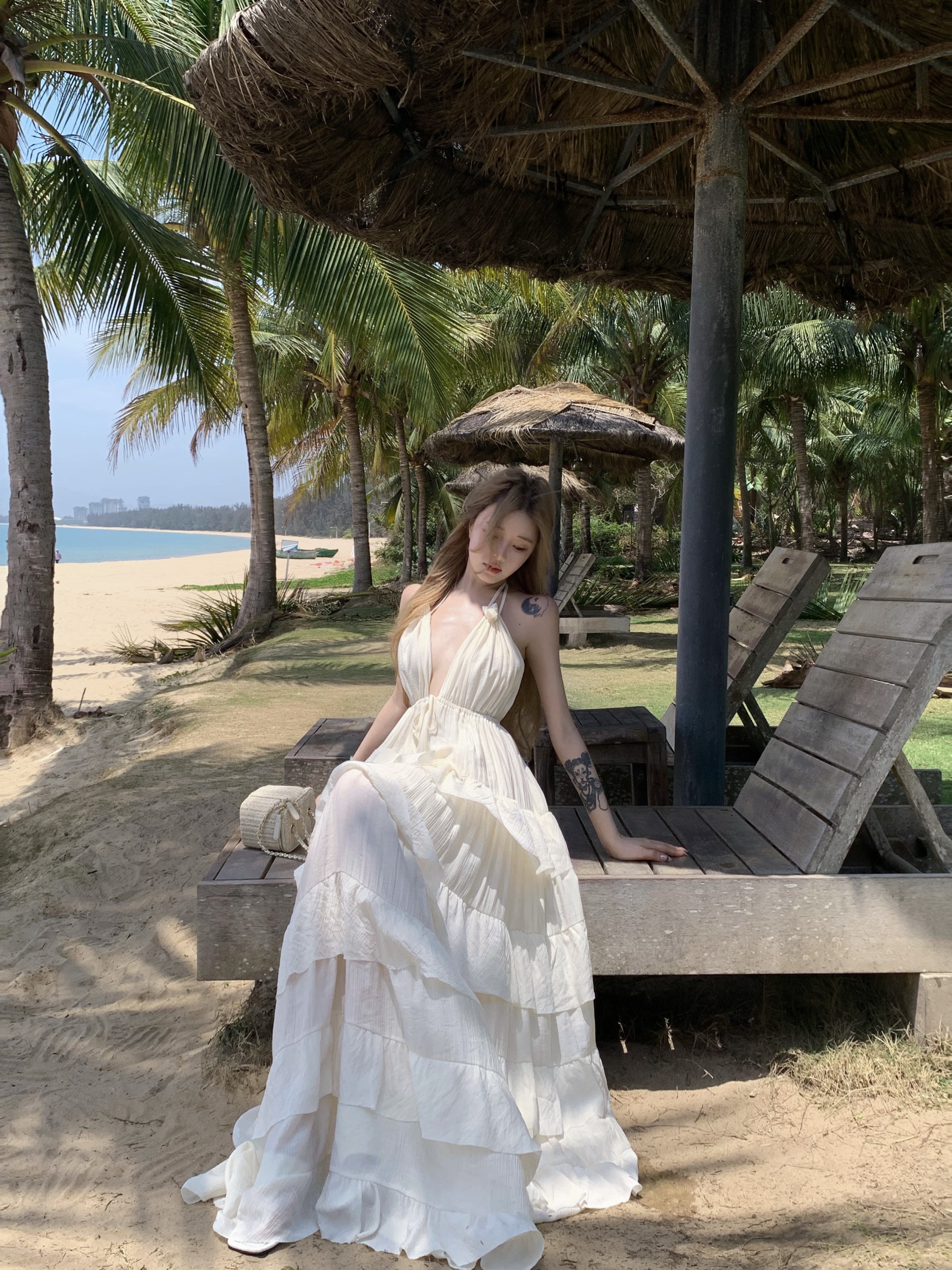 Thai Yunnan Seaside Resort Cotton and Linen V-Neck Halter Dress Fairy-Like Sexy Backless Ruffled Tiered Long Dress