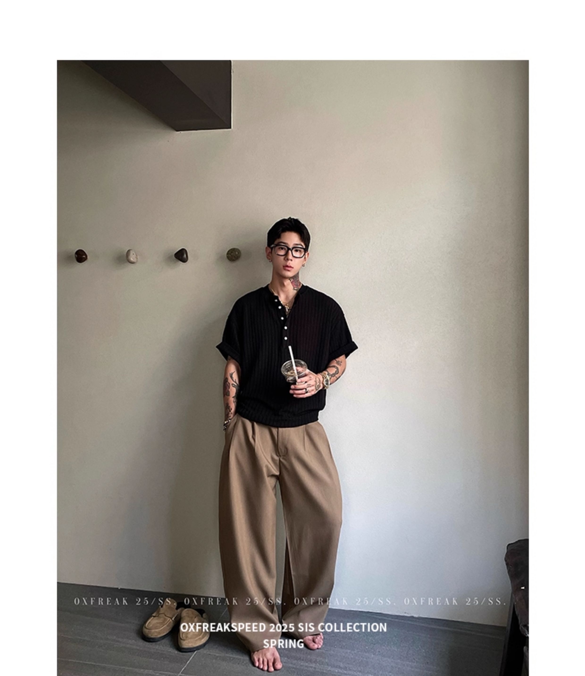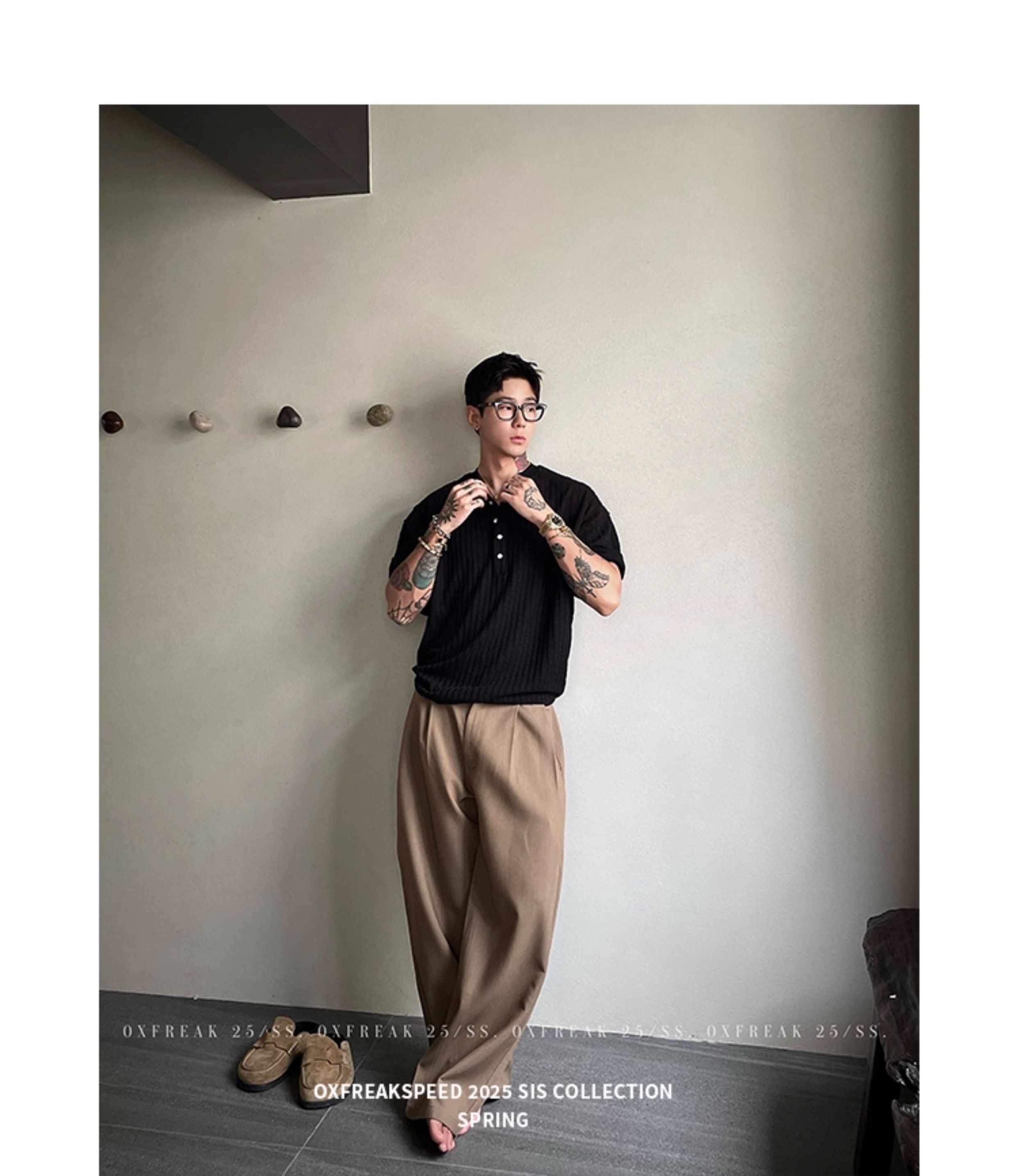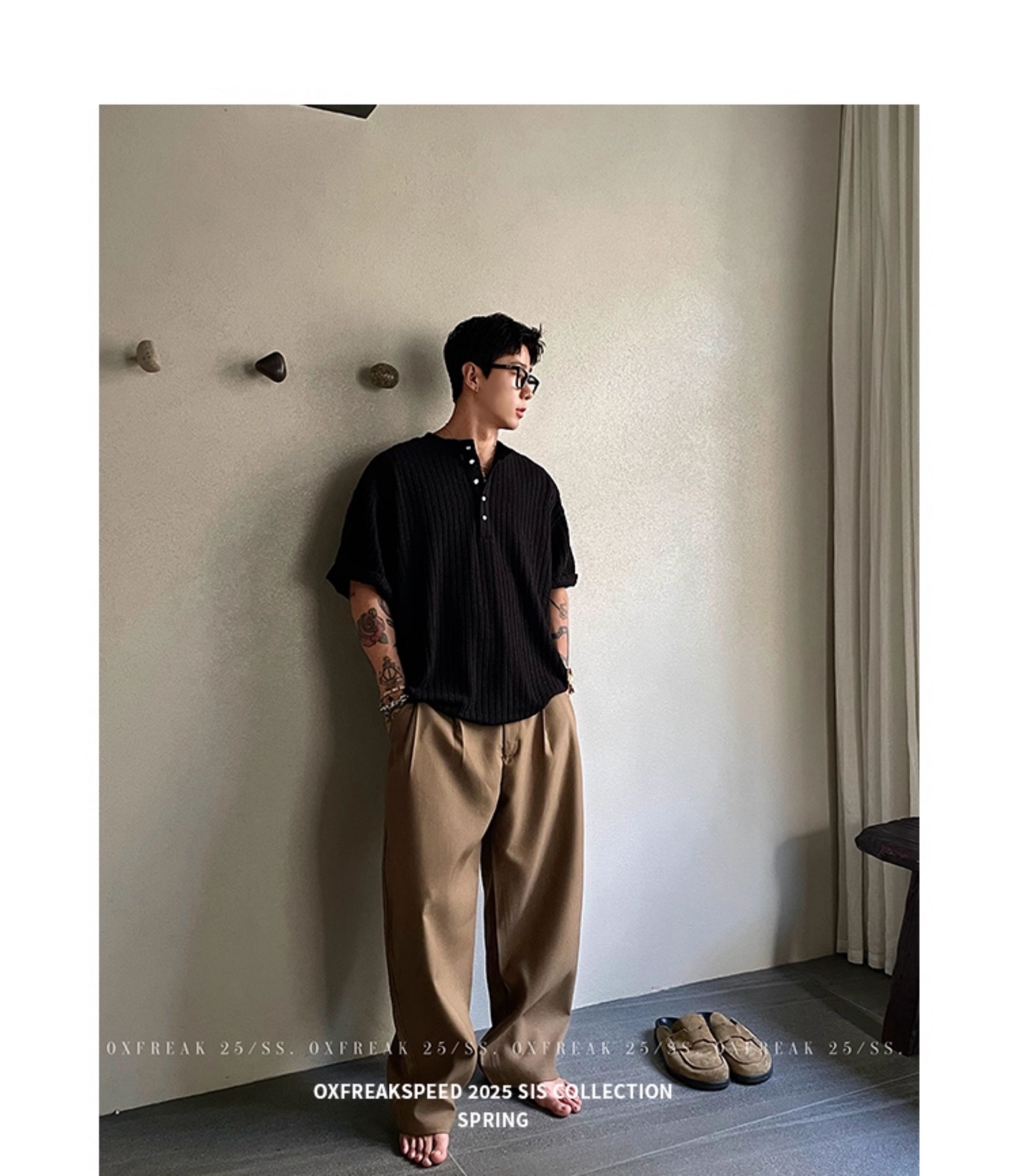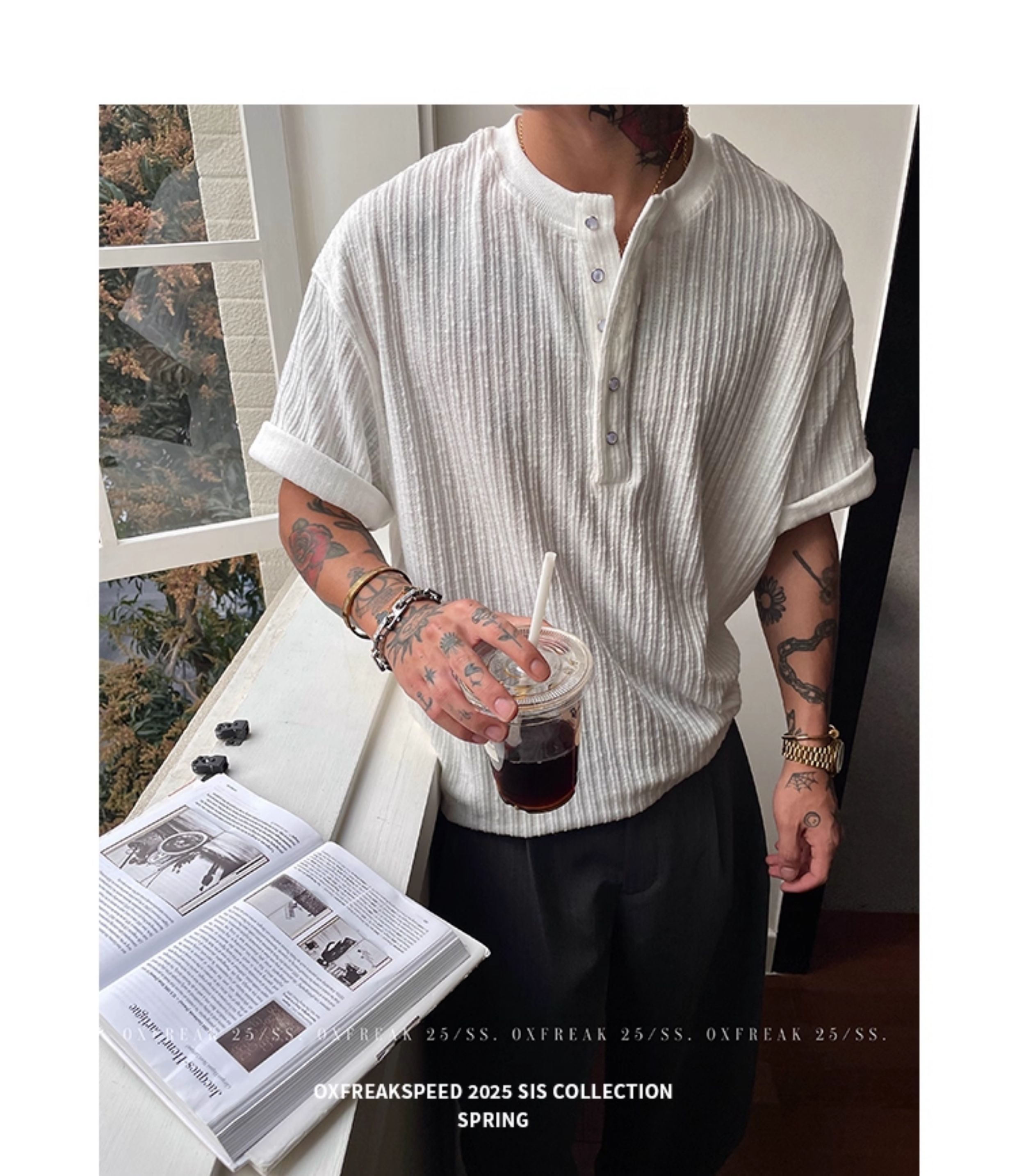 Oxfreak'Textured Wrinkle Soft Feel' Old Money Style Henry Collar Short Sleeve T-Shirt Men's Slim Fit V-Neck Top