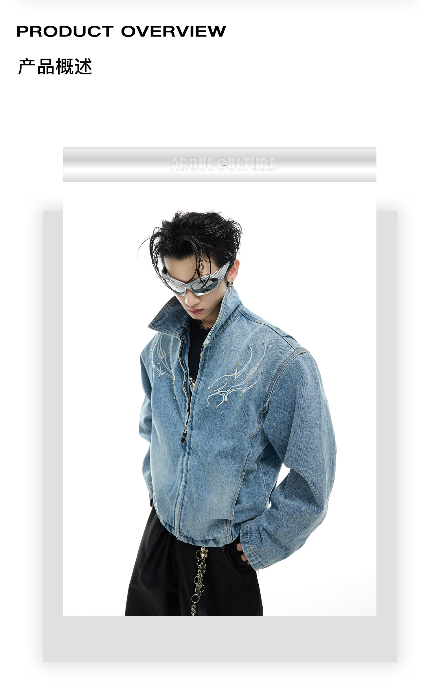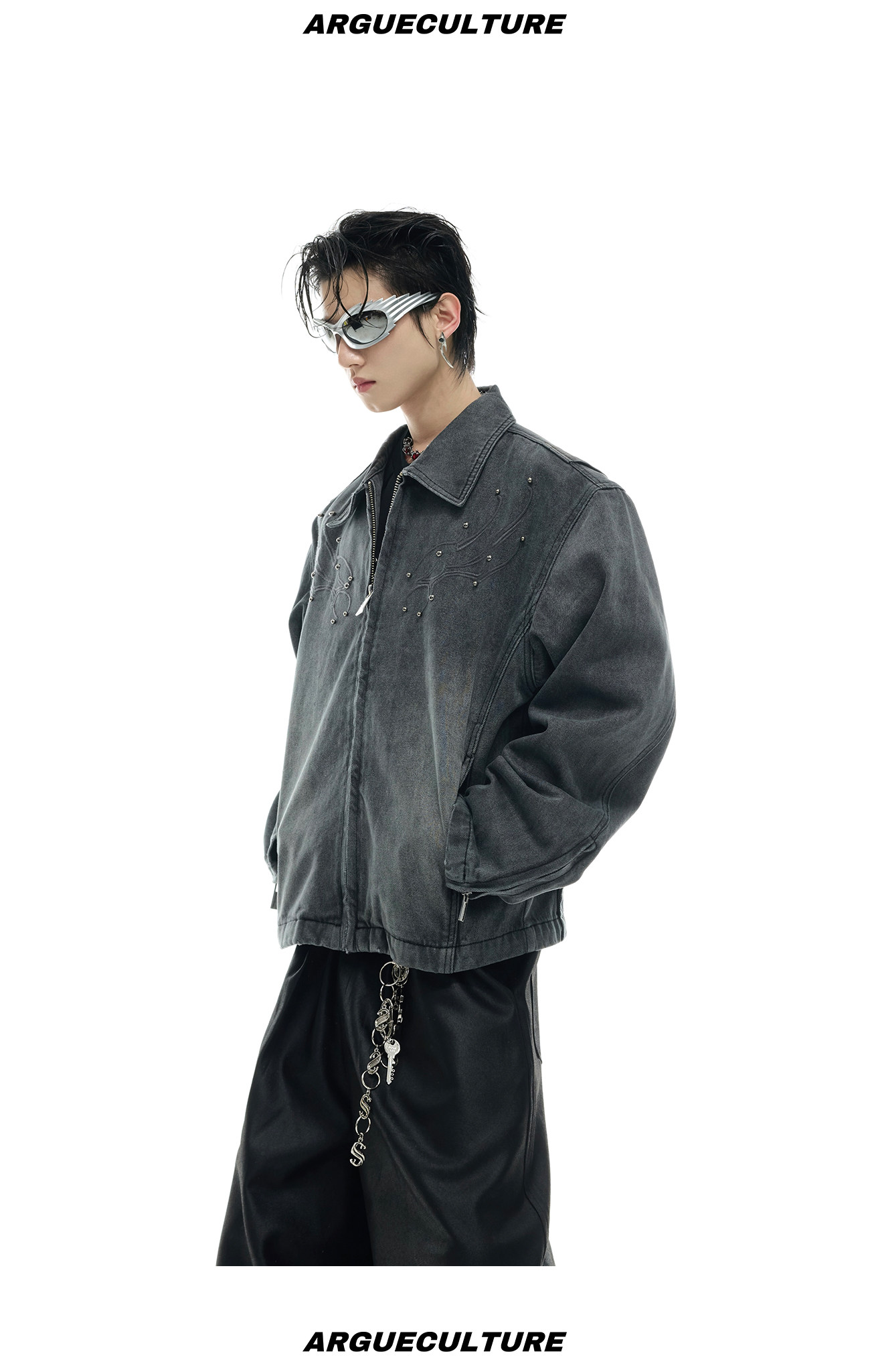 Argue Culture Heavy Vintage Washed Studded Spine Denim Jacket Short Wide Fit Jacket