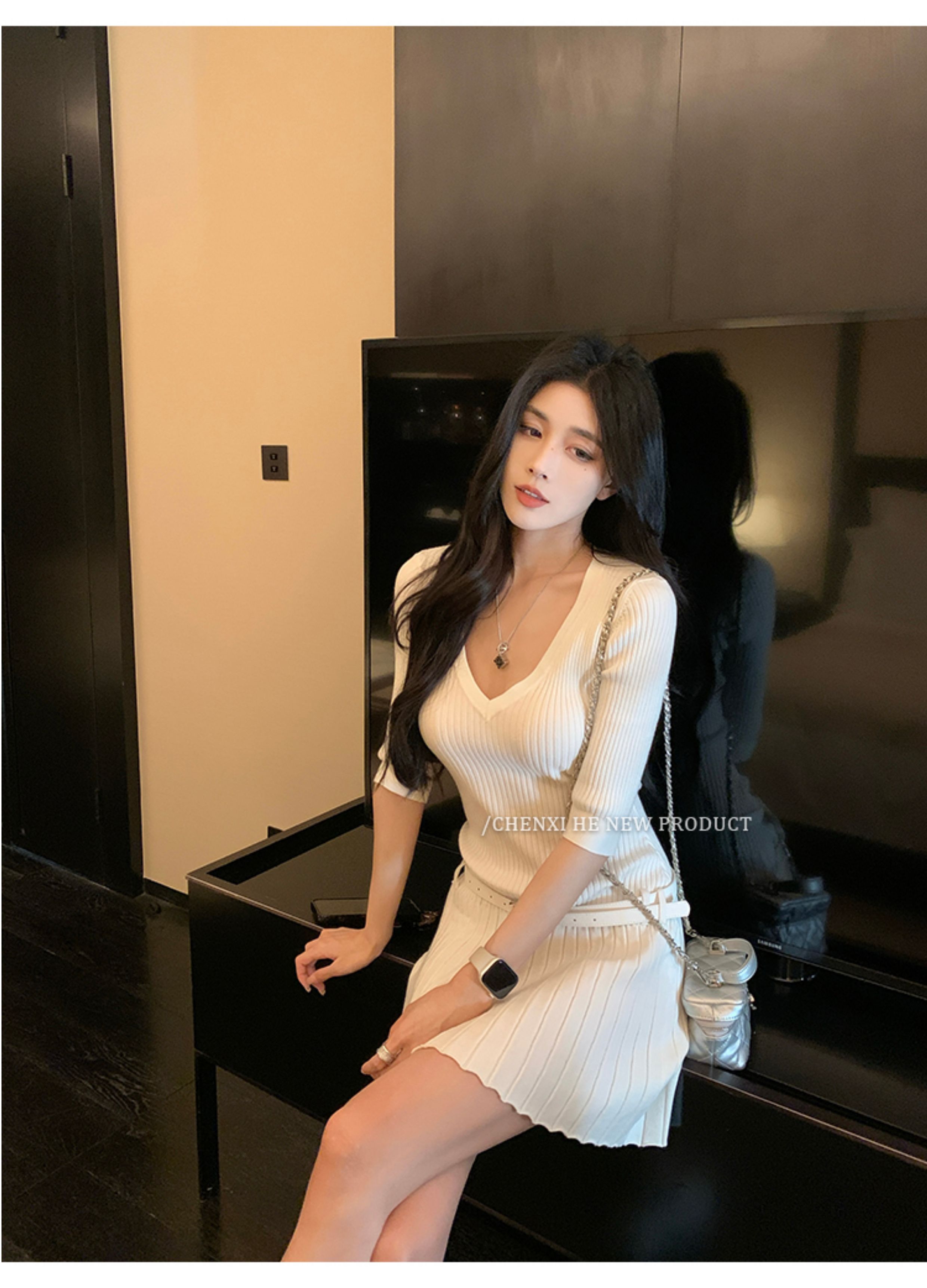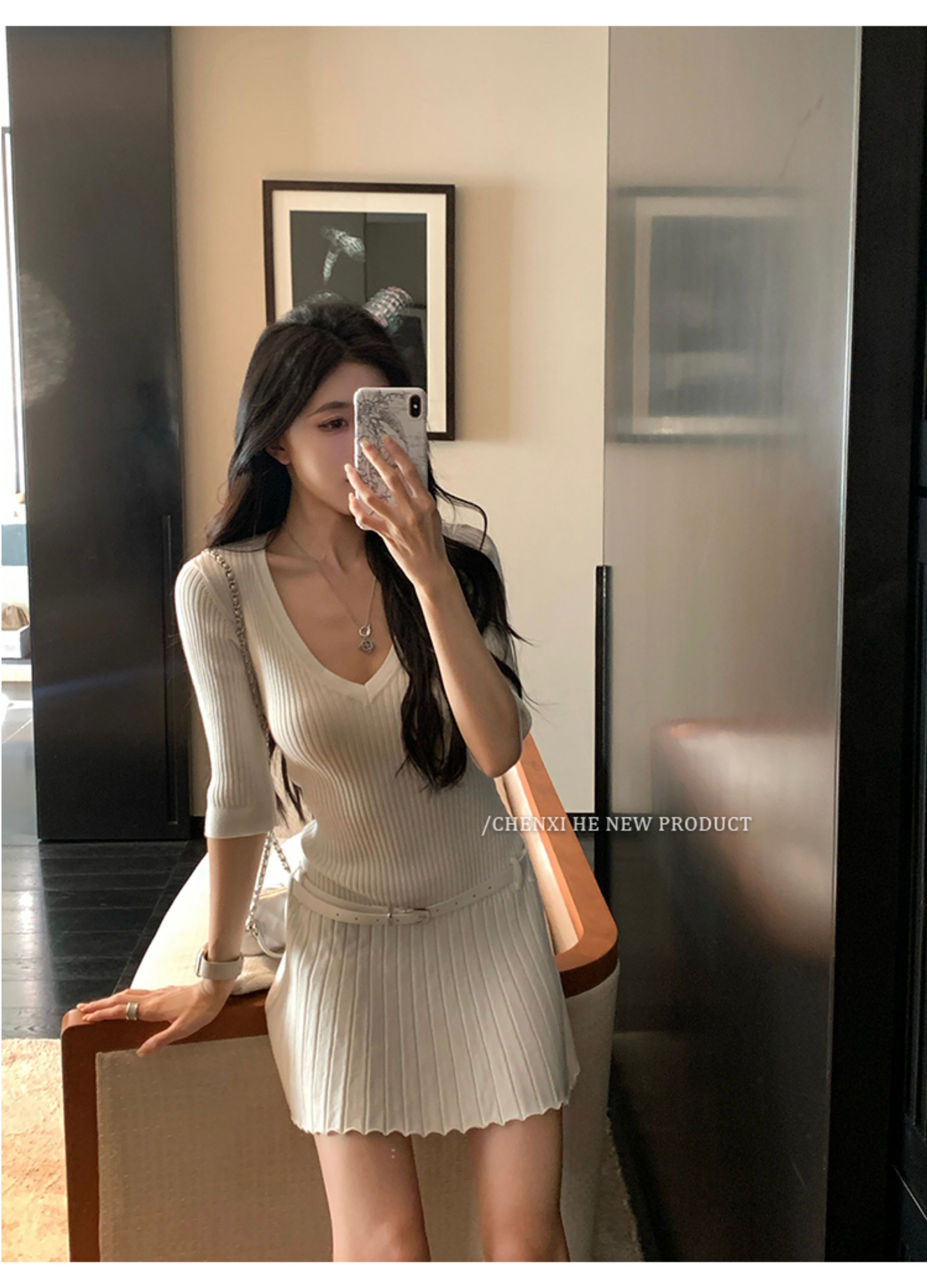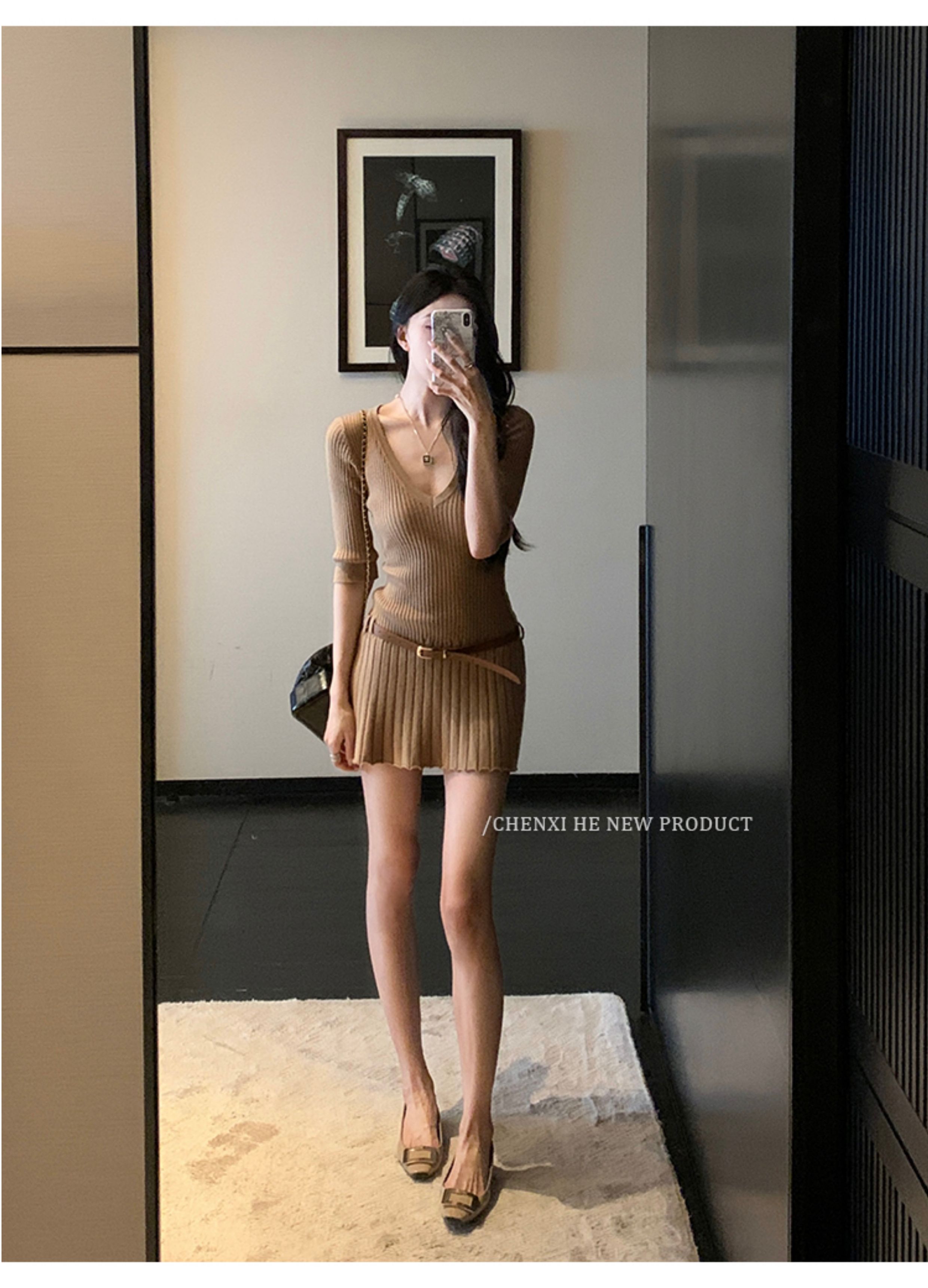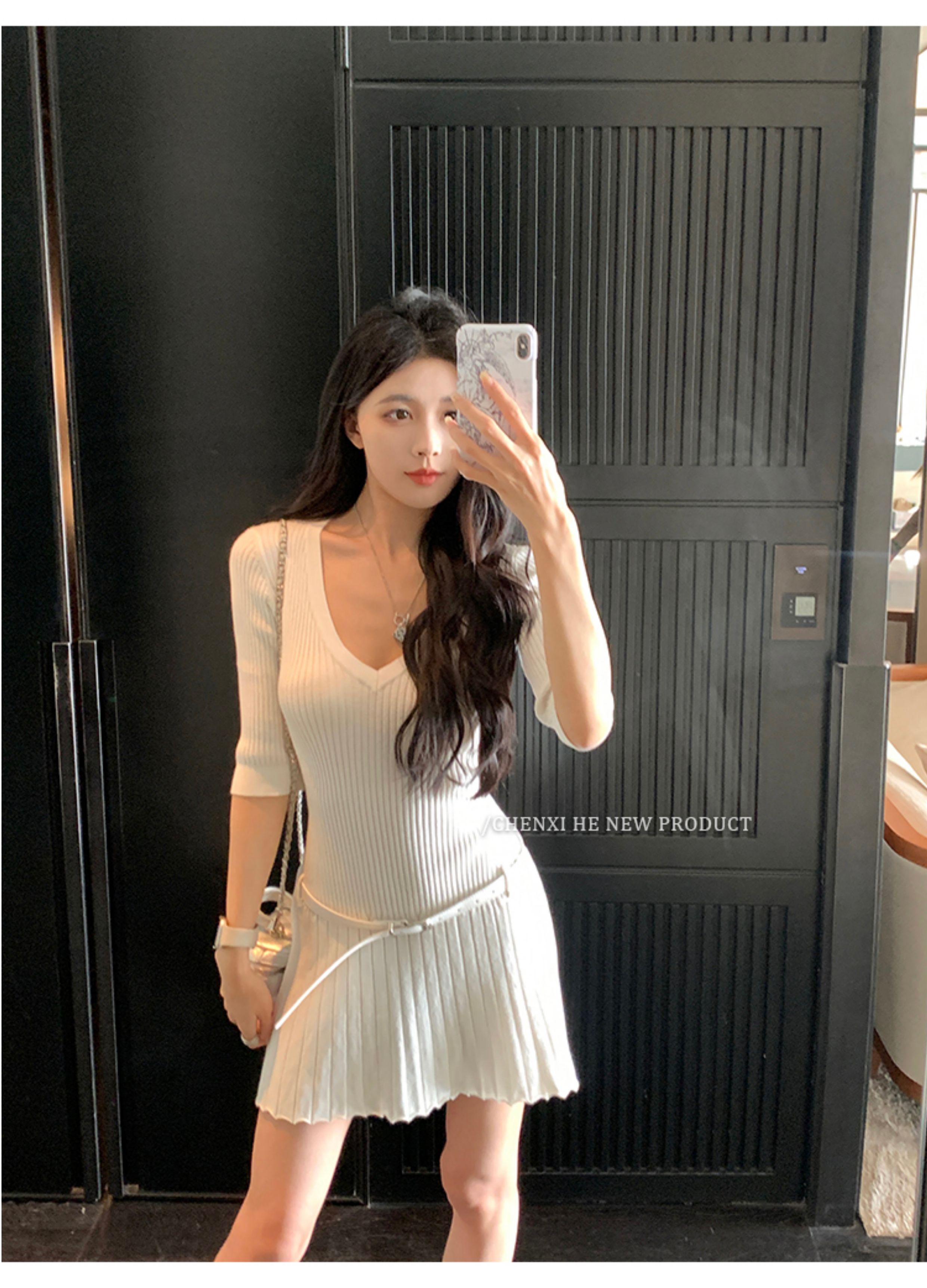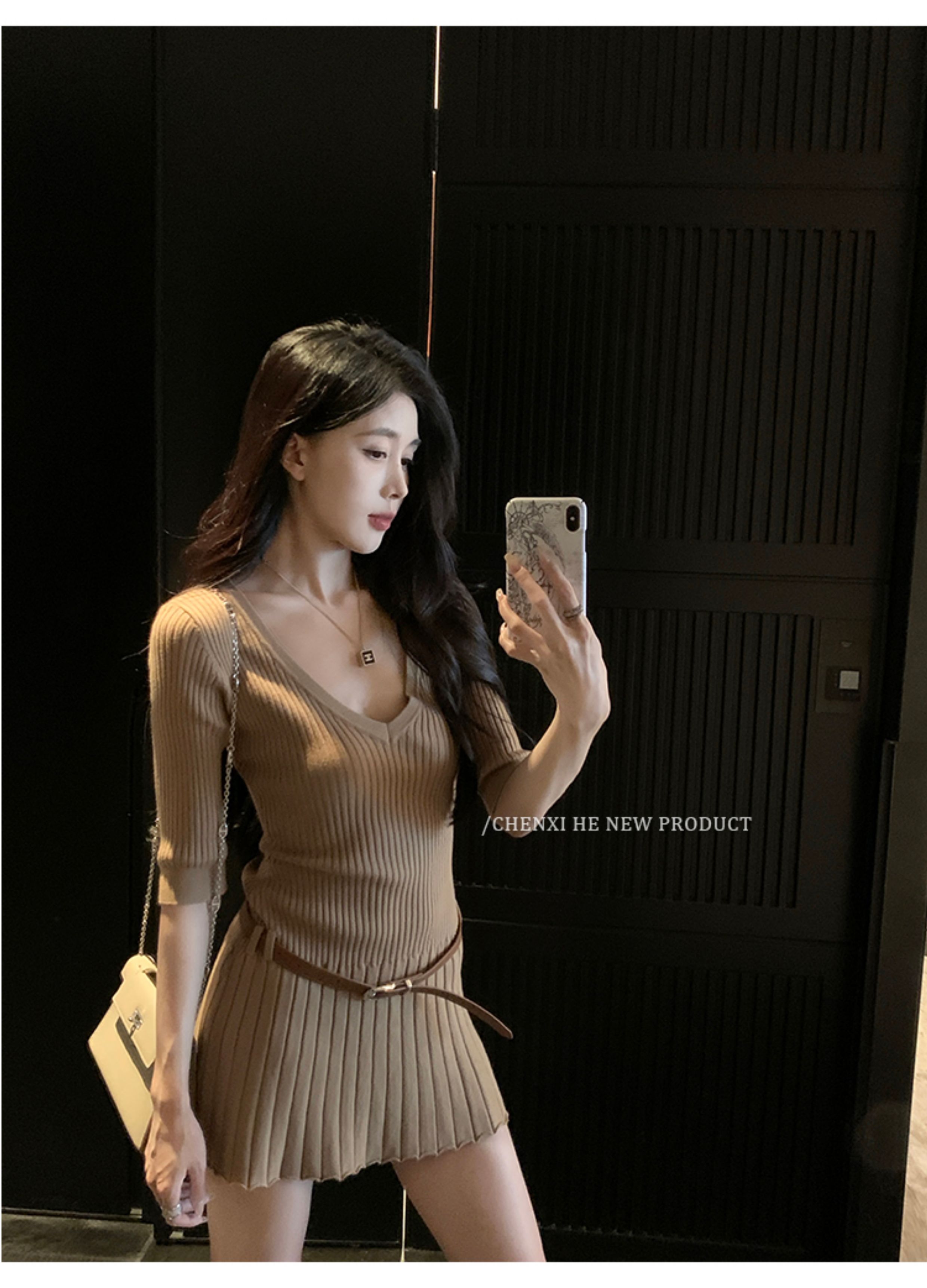 He Chenxi V Neck Mid-Sleeve Belt Knitted Skirt for Women Summer Sexy Retro Slim Slim Pleated Knitted Skirt
