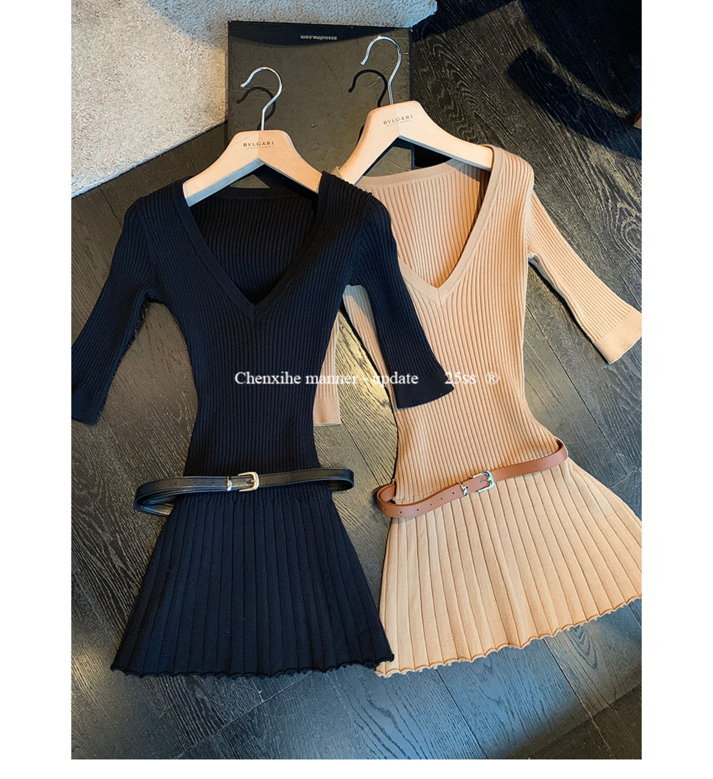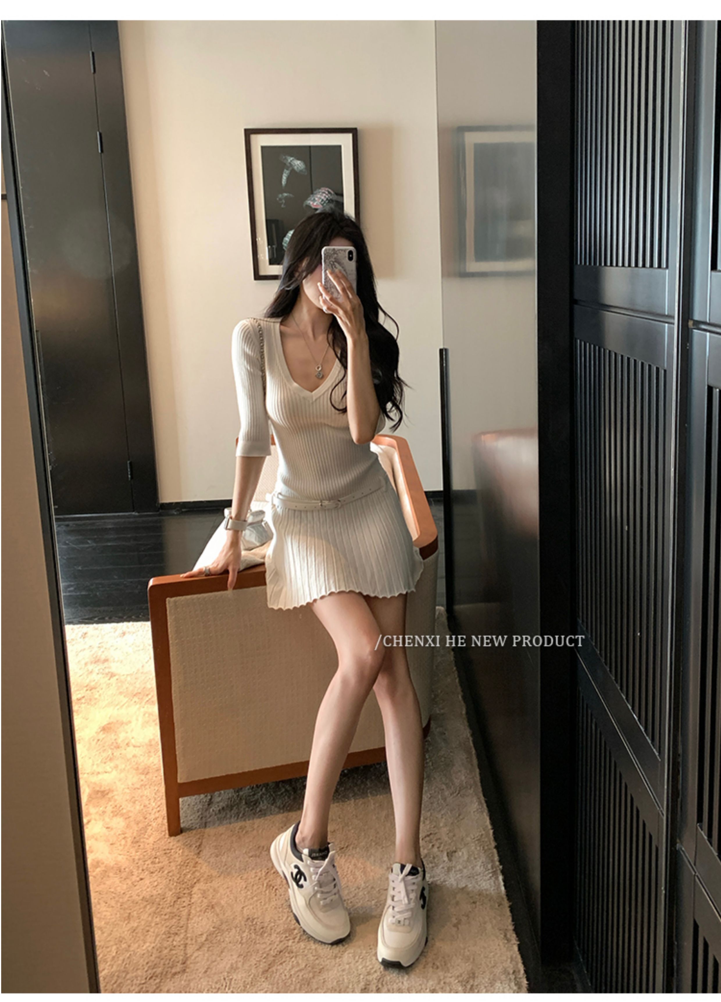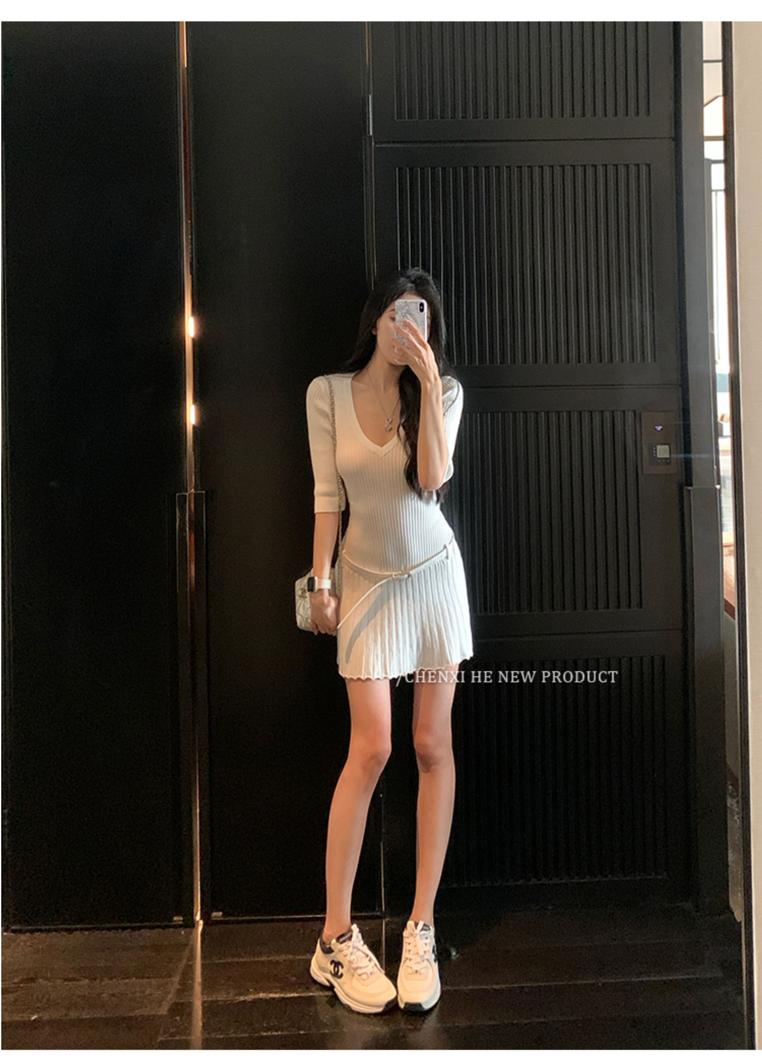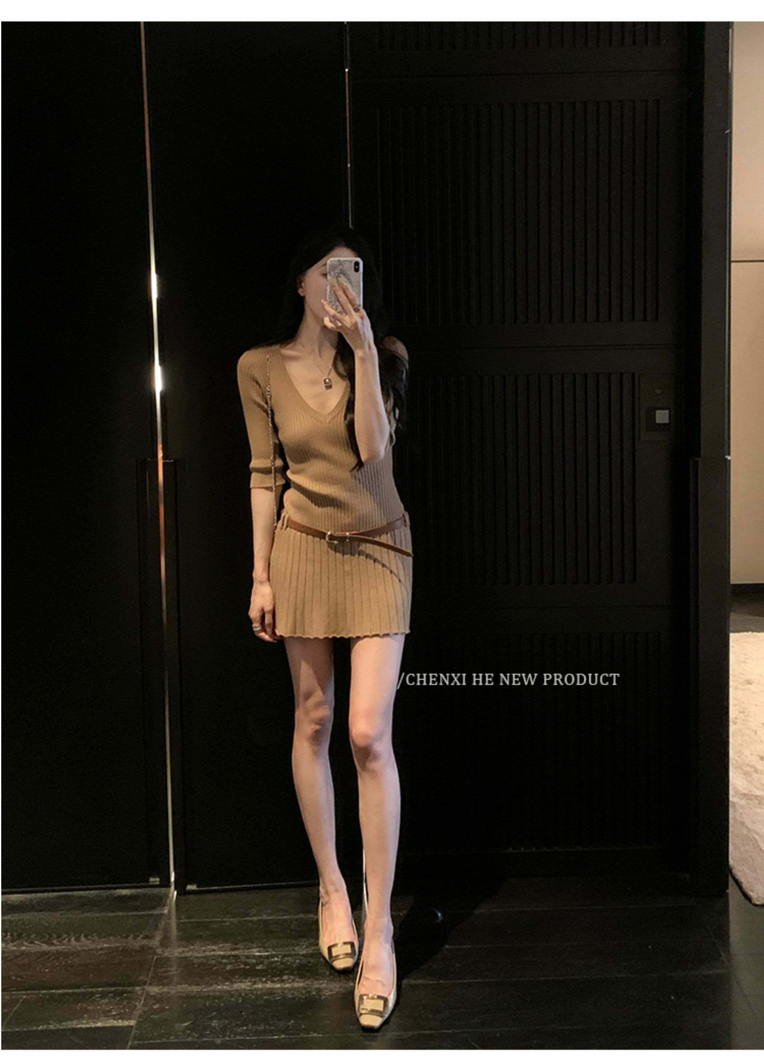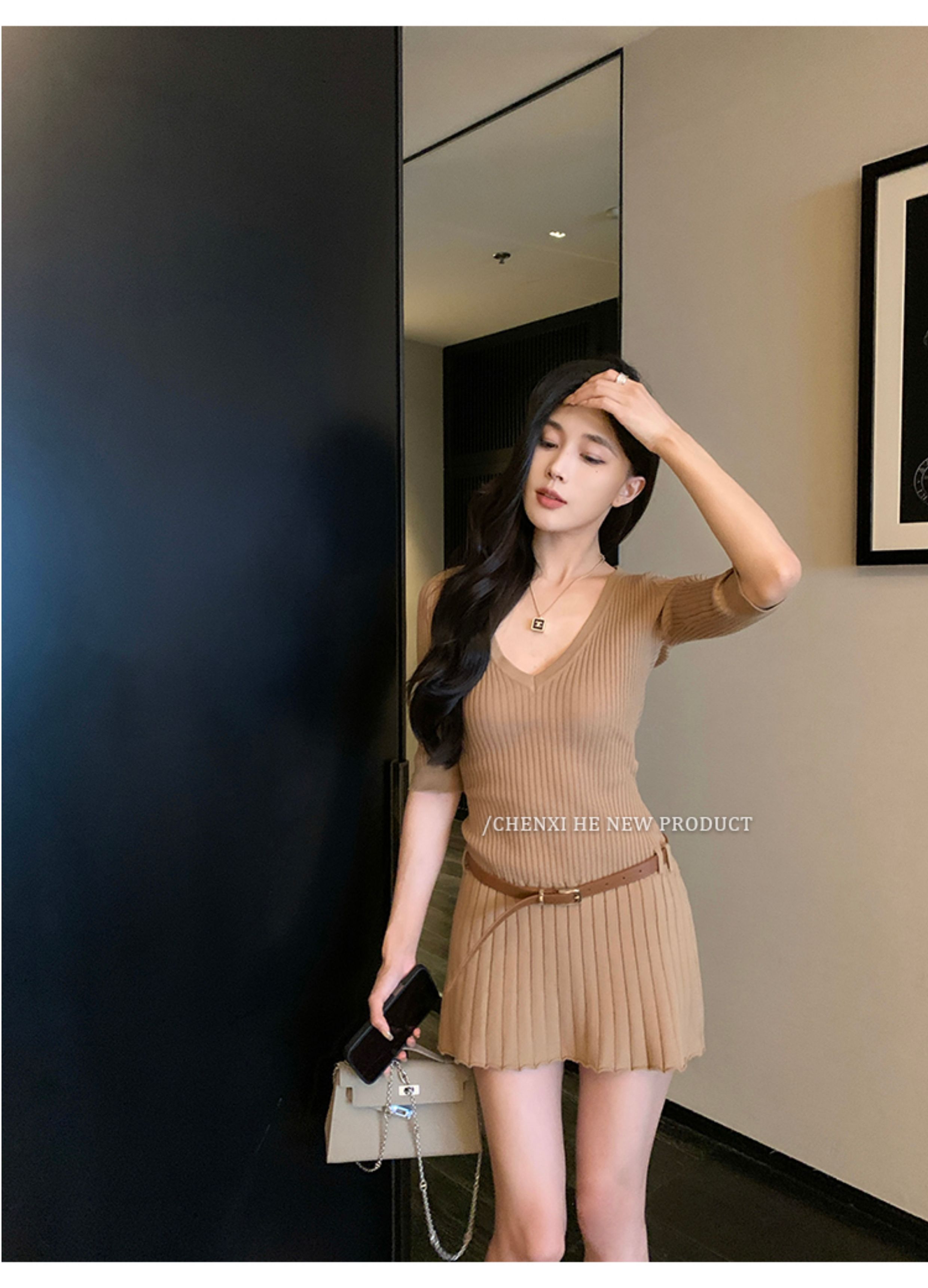 He Chenxi V Neck Mid-Sleeve Belt Knitted Skirt for Women Summer Sexy Retro Slim Slim Pleated Knitted Skirt