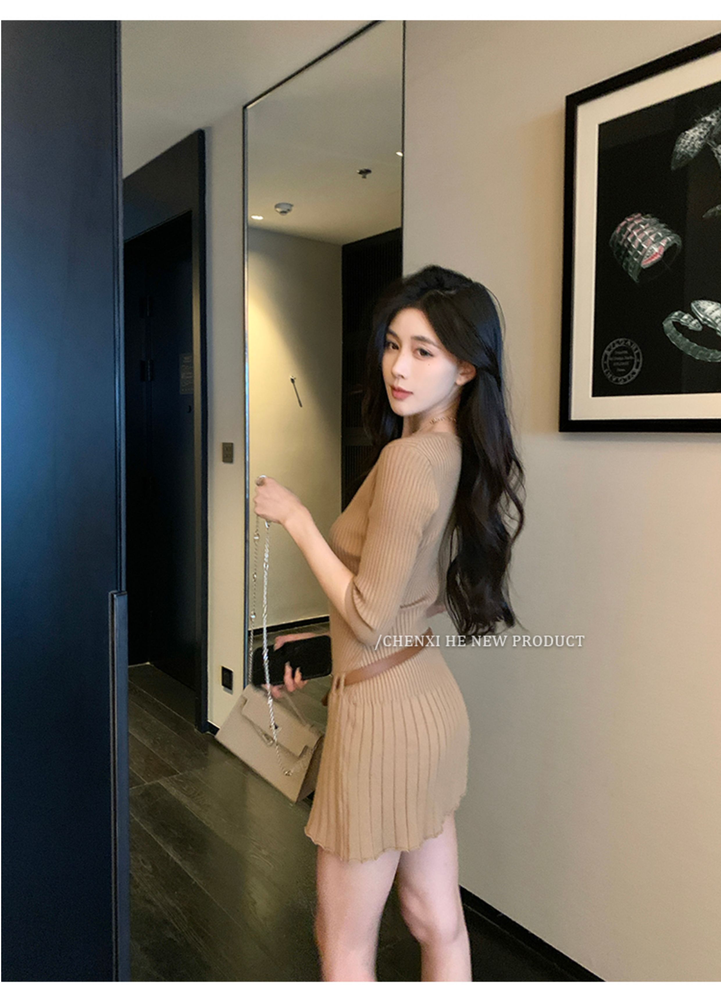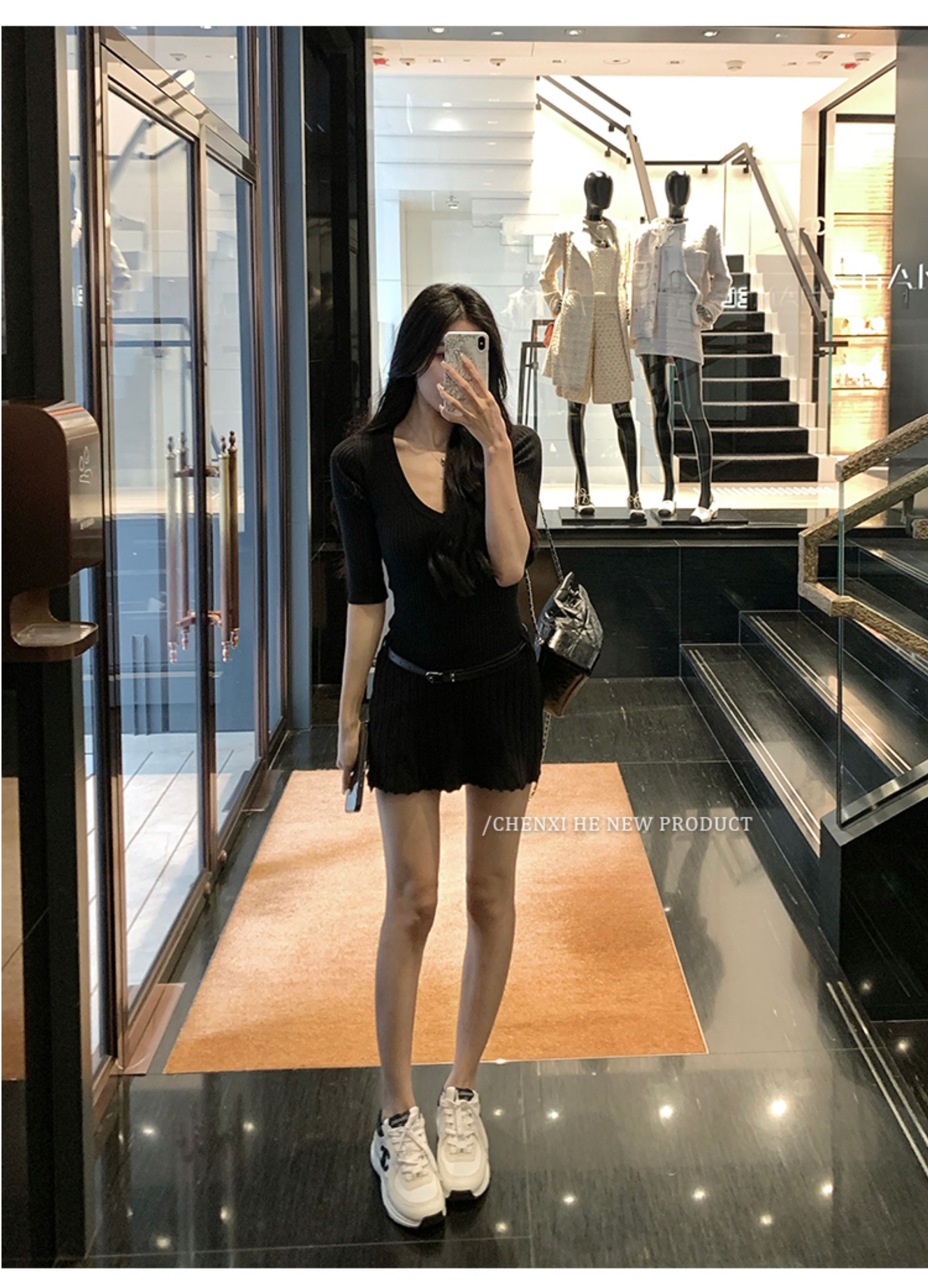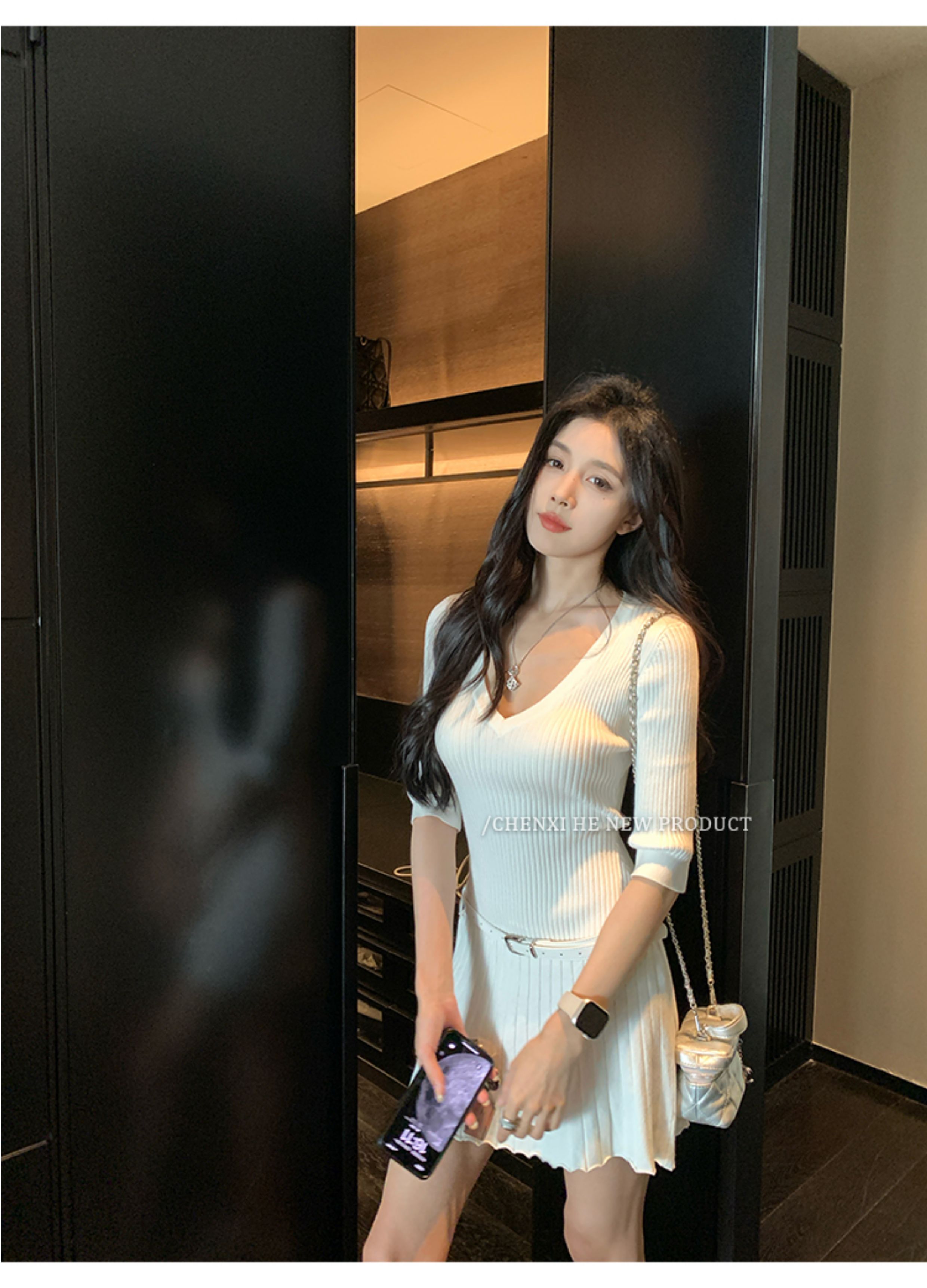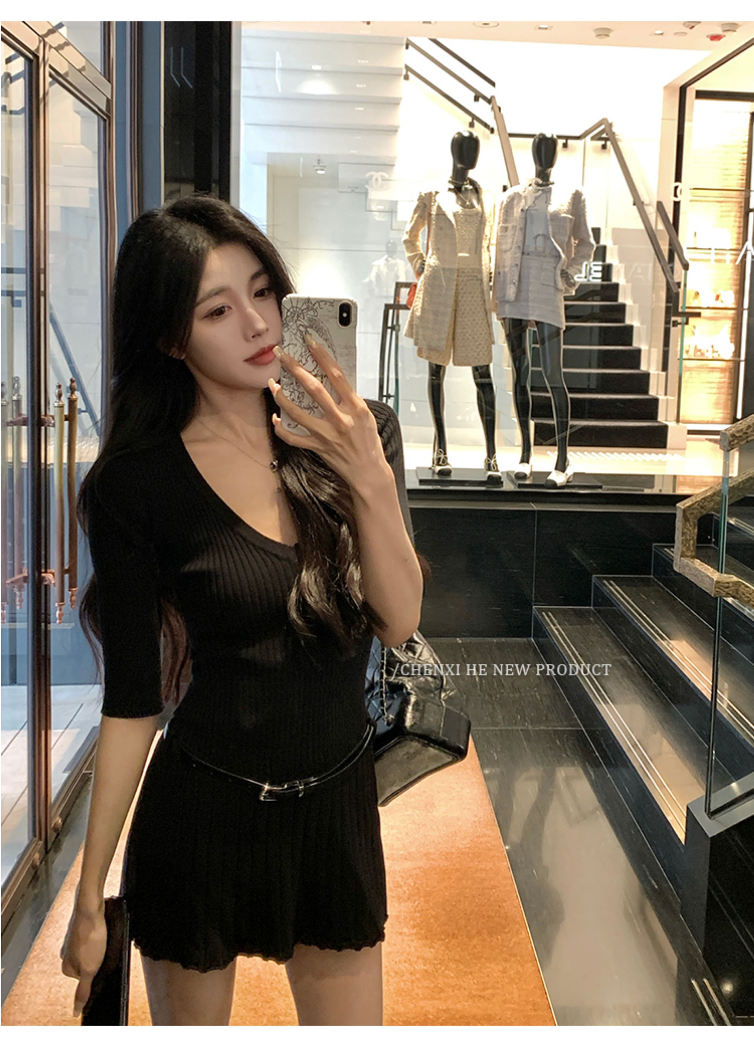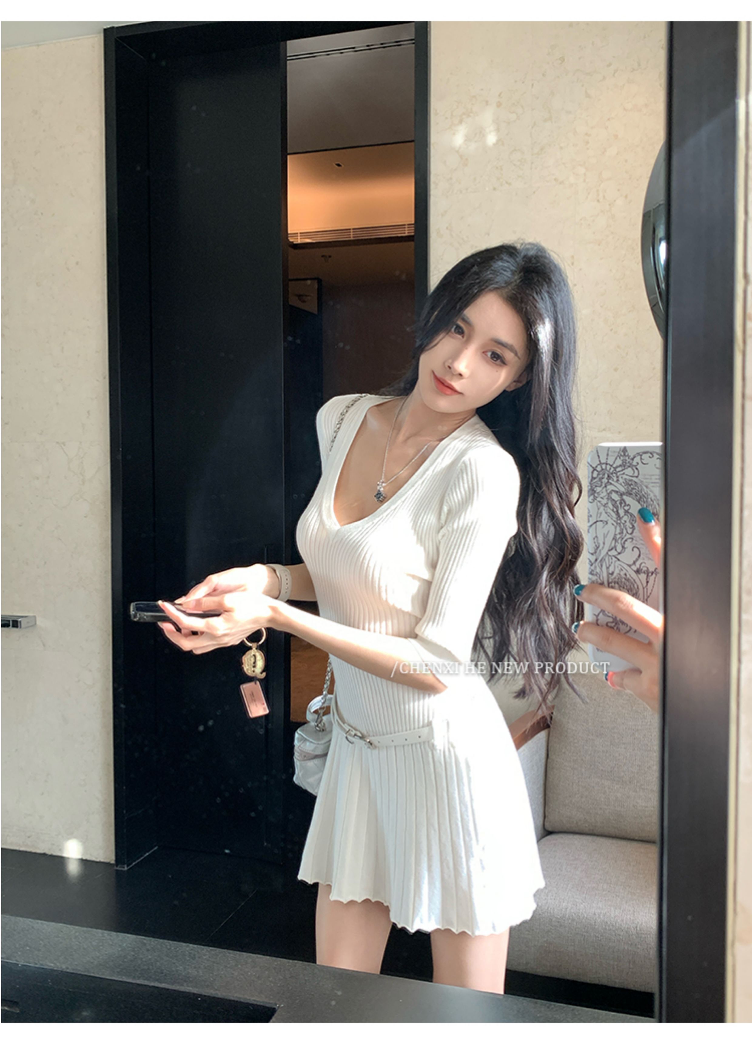 He Chenxi V Neck Mid-Sleeve Belt Knitted Skirt for Women Summer Sexy Retro Slim Slim Pleated Knitted Skirt