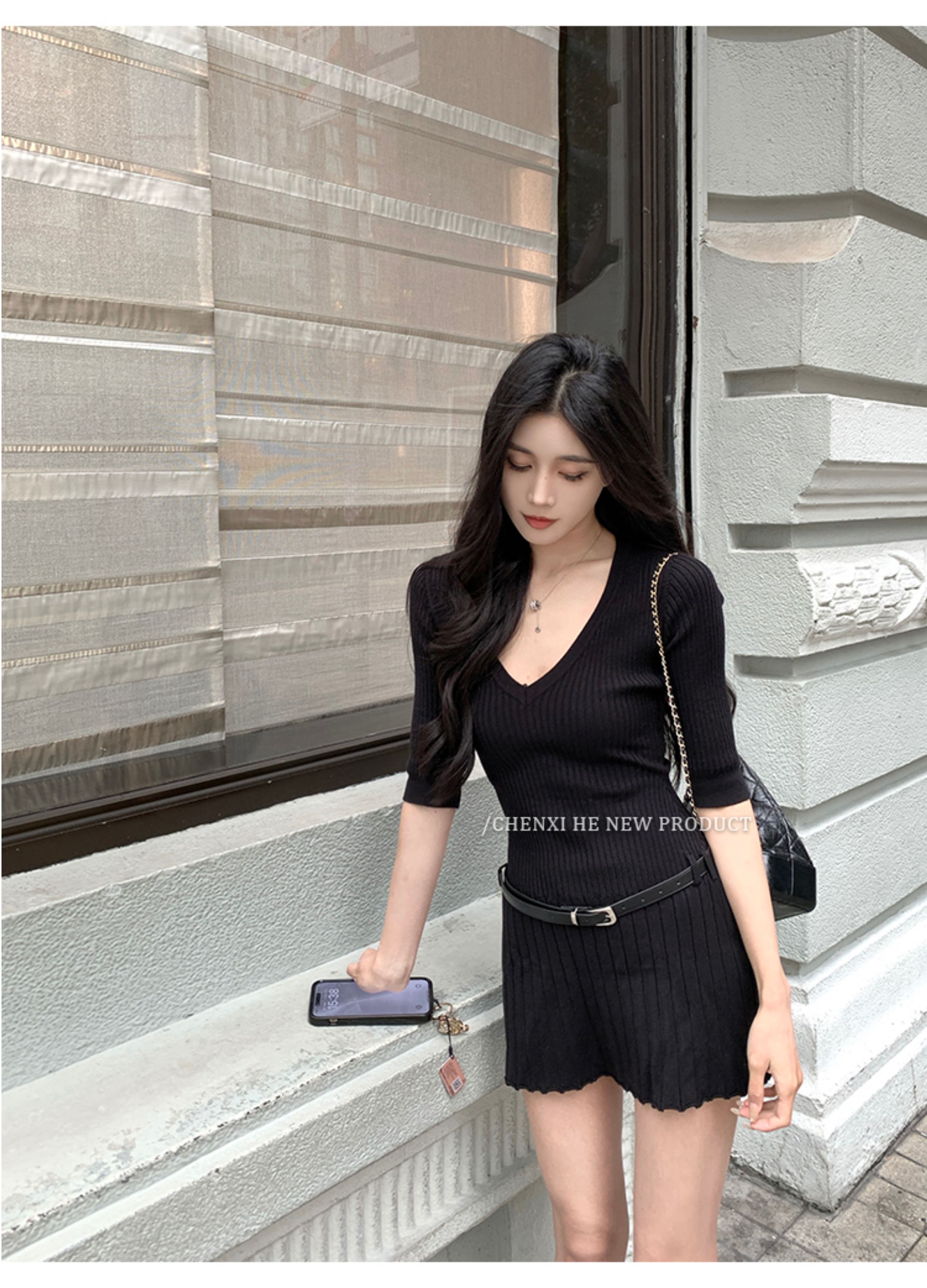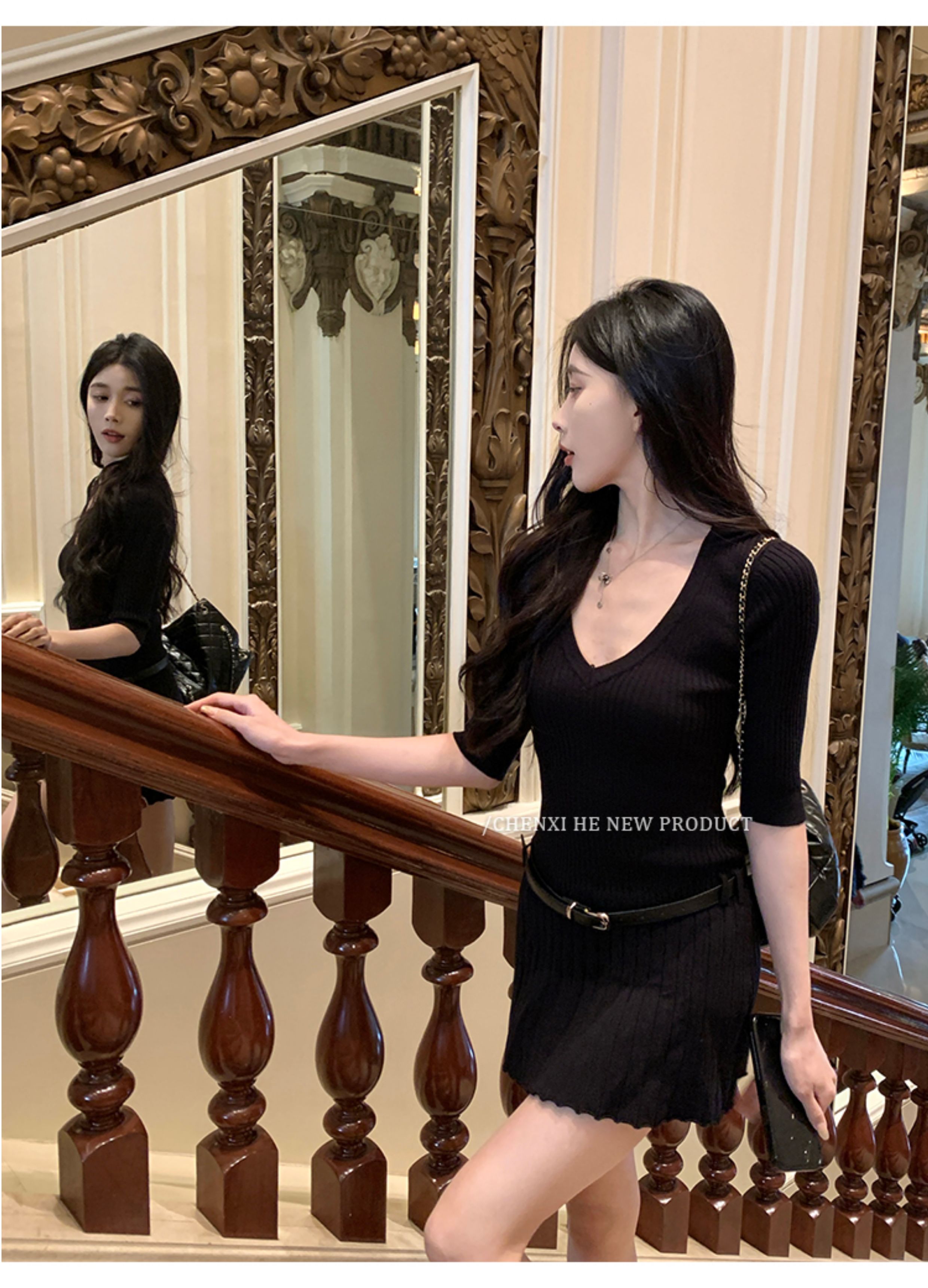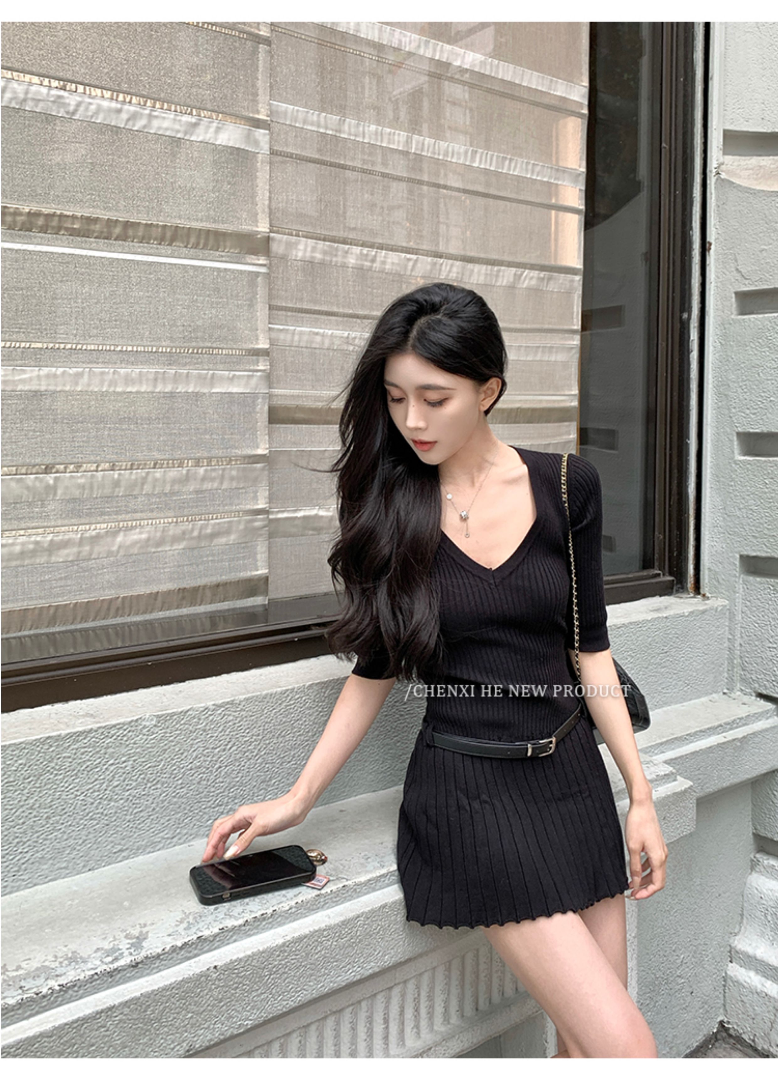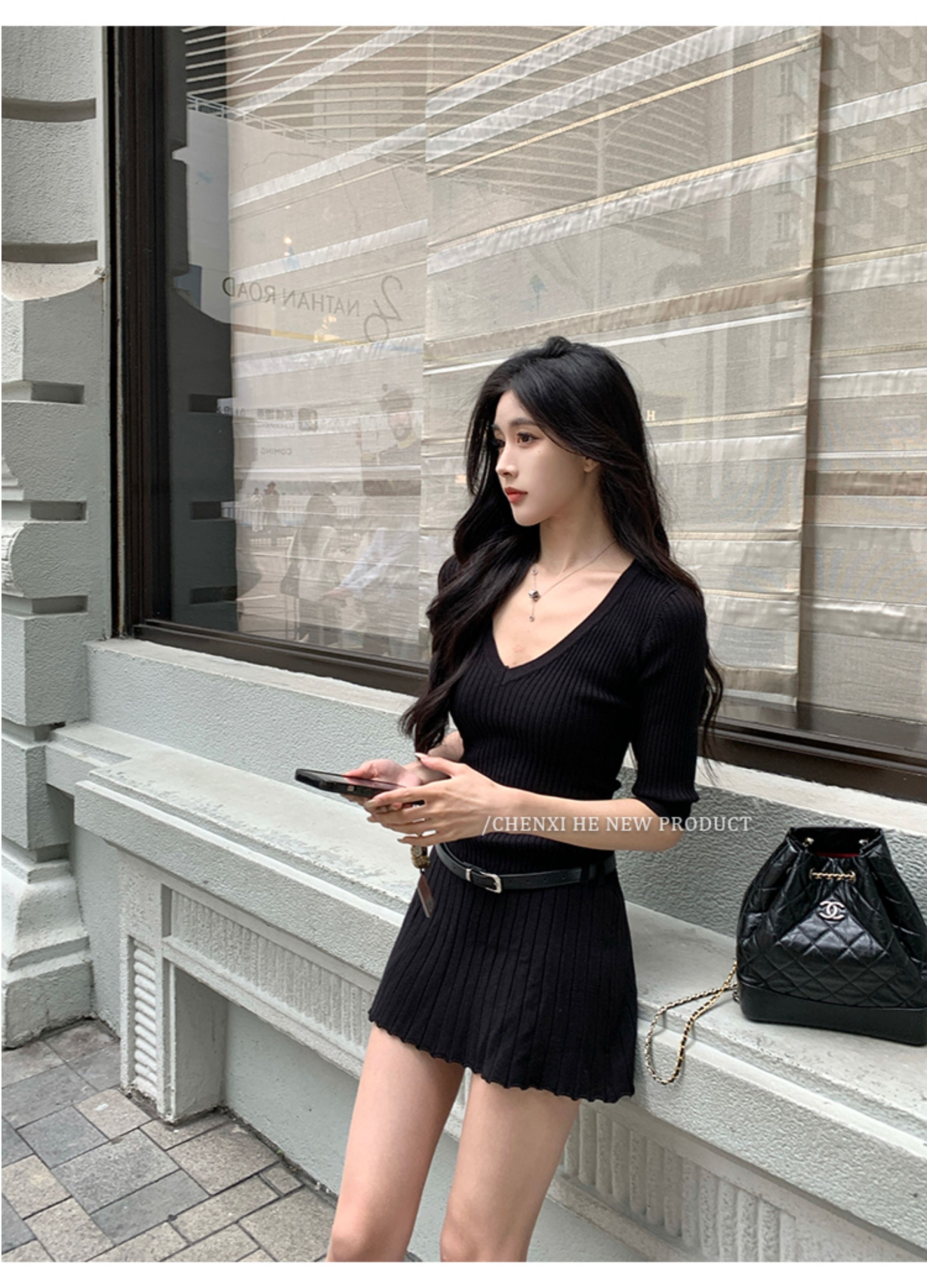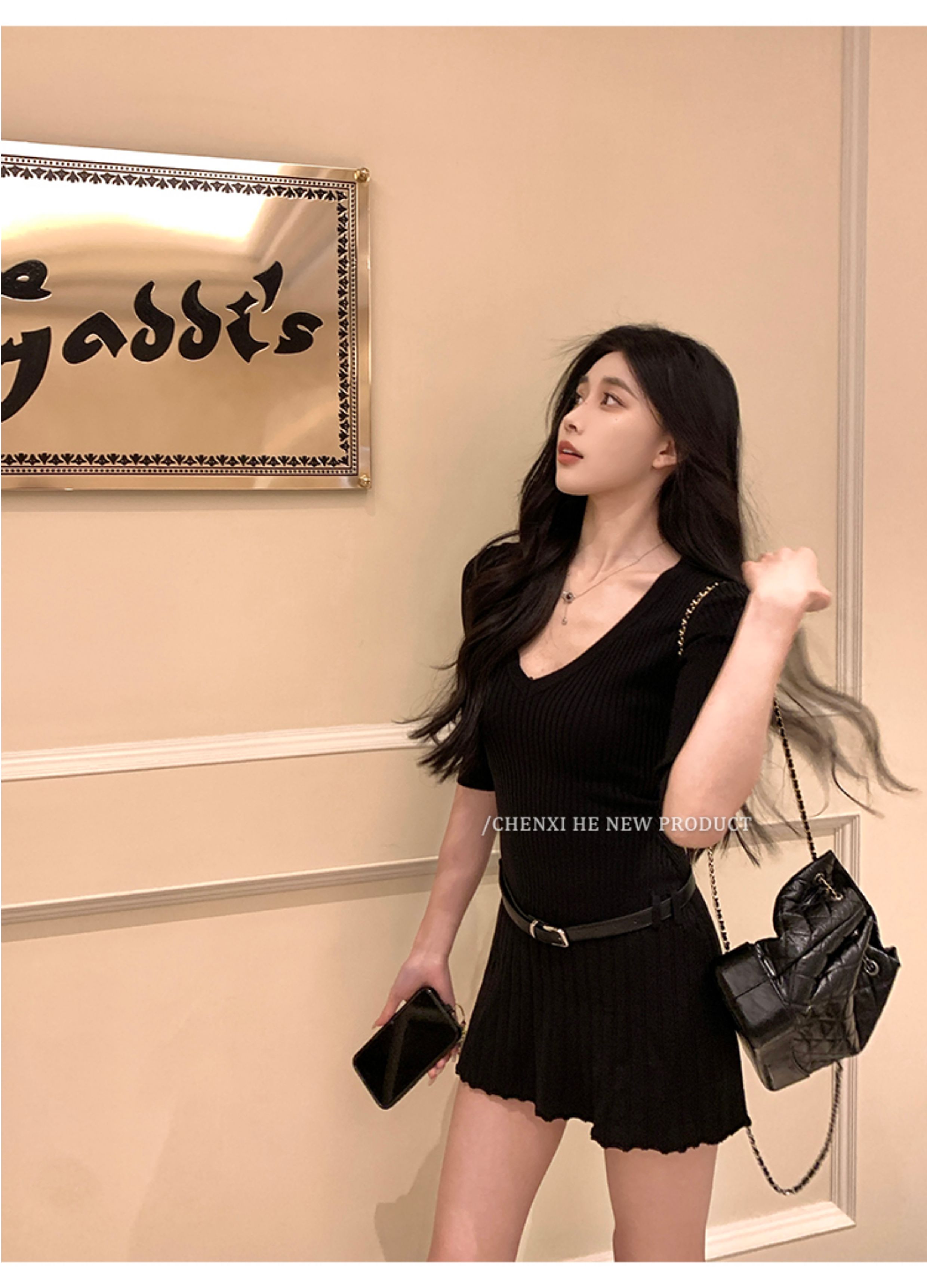 He Chenxi V Neck Mid-Sleeve Belt Knitted Skirt for Women Summer Sexy Retro Slim Slim Pleated Knitted Skirt