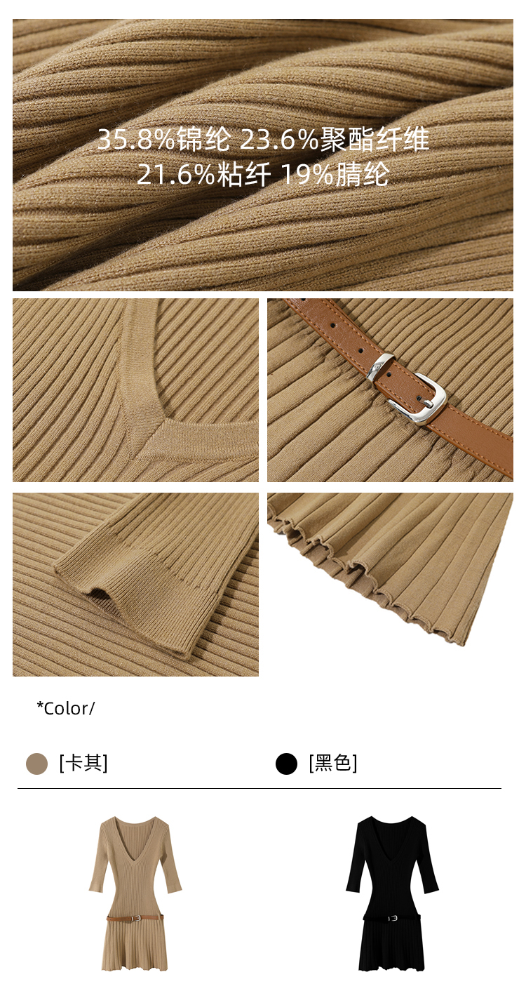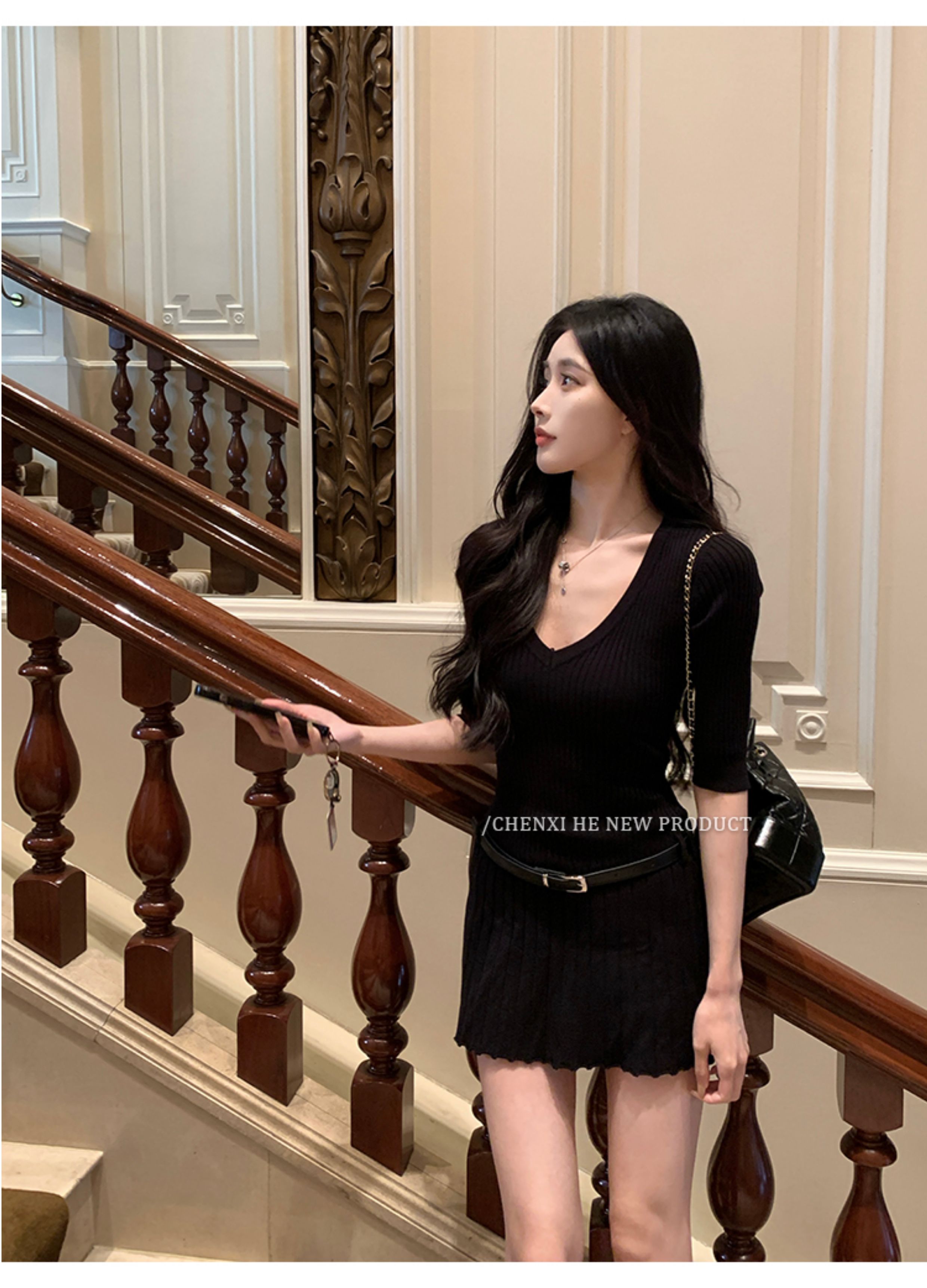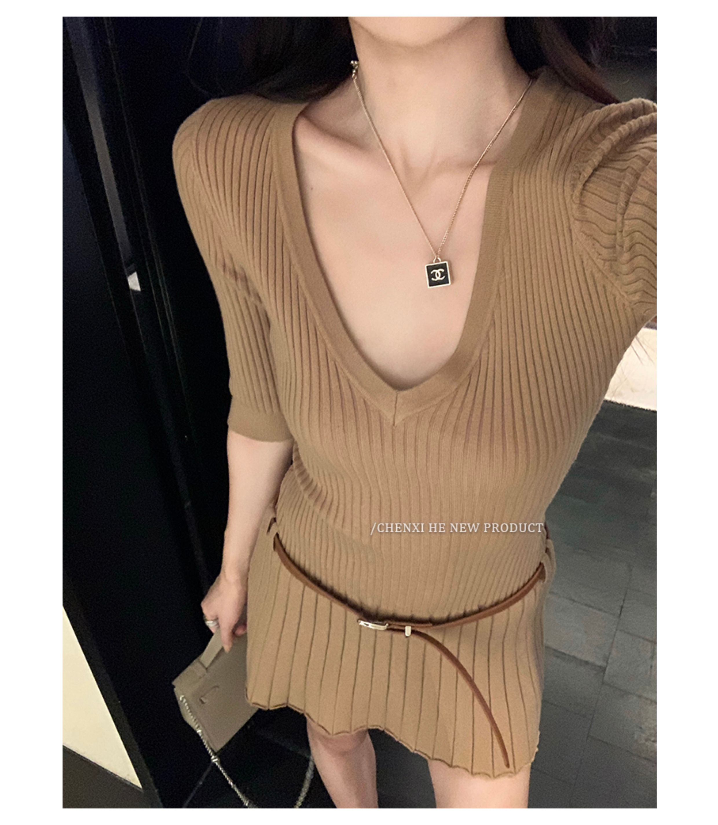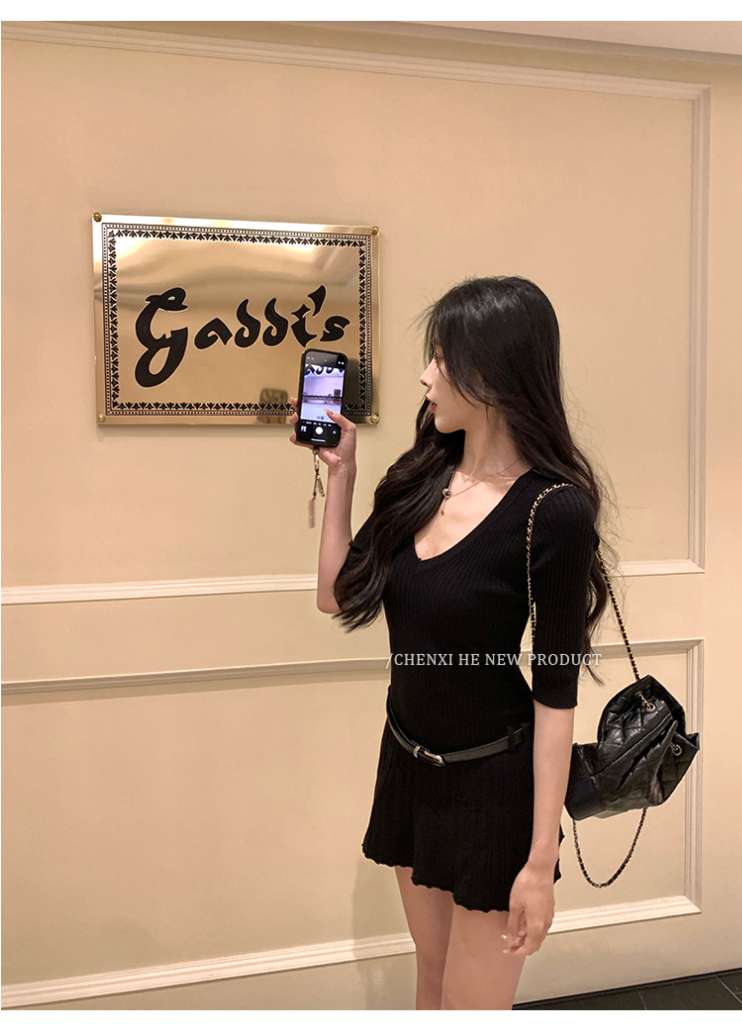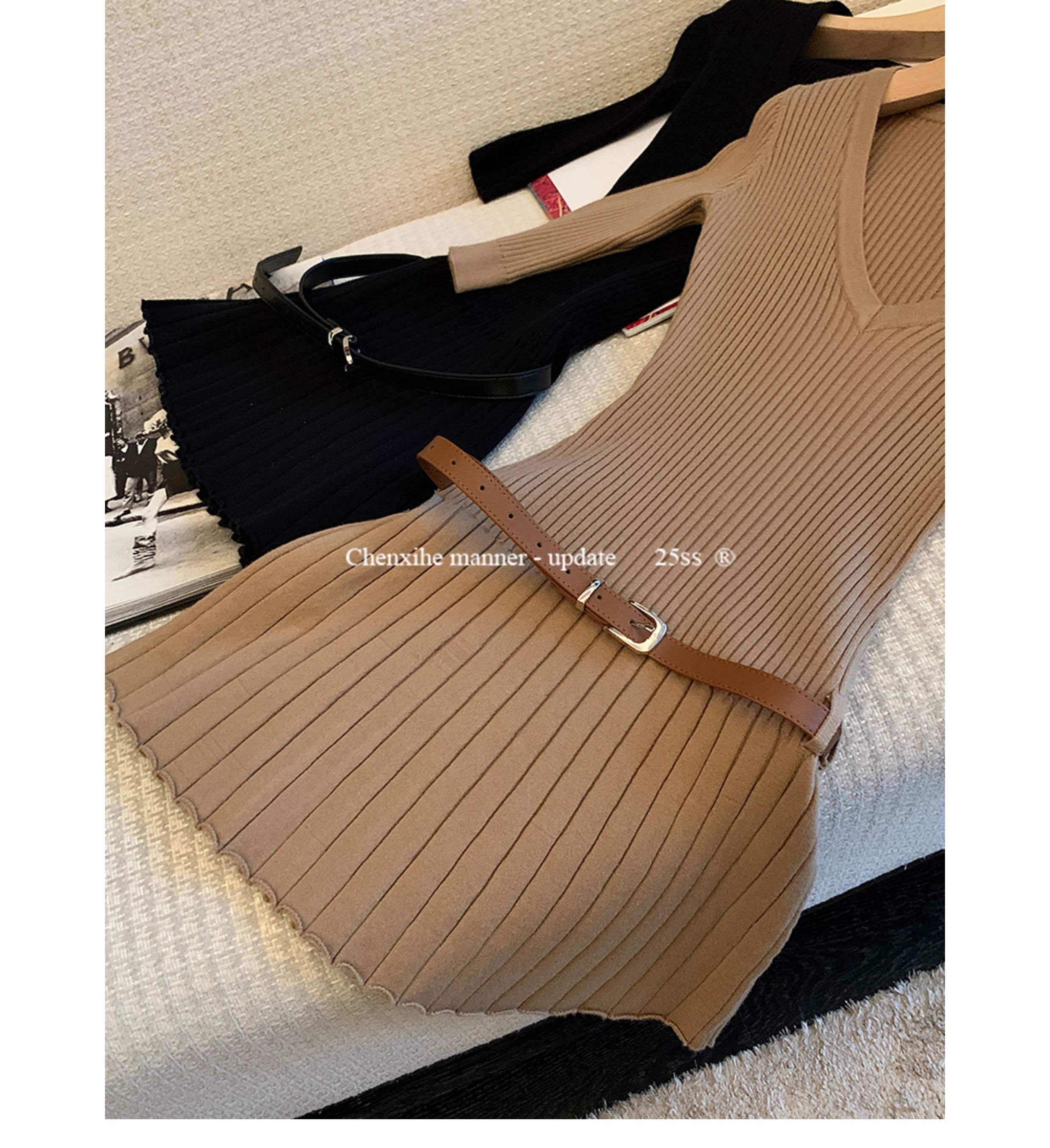He Chenxi V Neck Mid-Sleeve Belt Knitted Skirt for Women Summer Sexy Retro Slim Slim Pleated Knitted Skirt