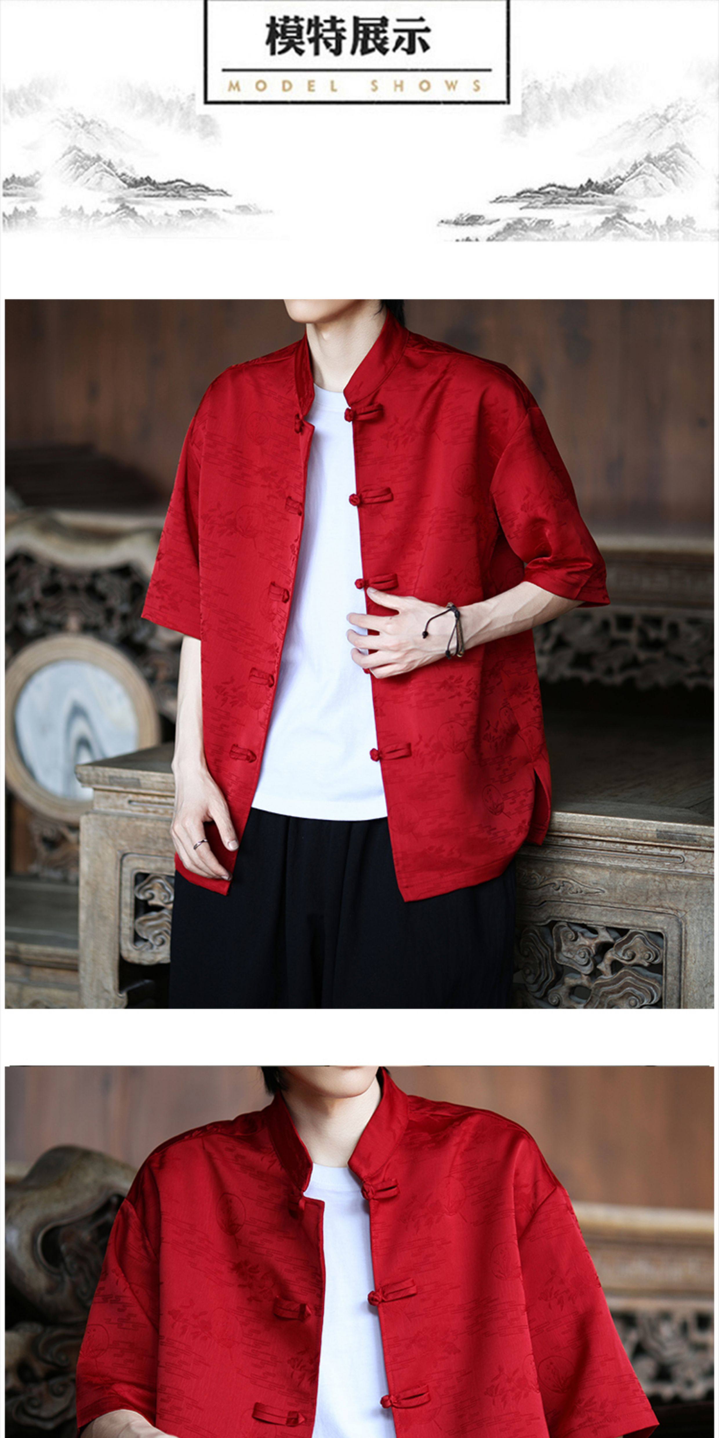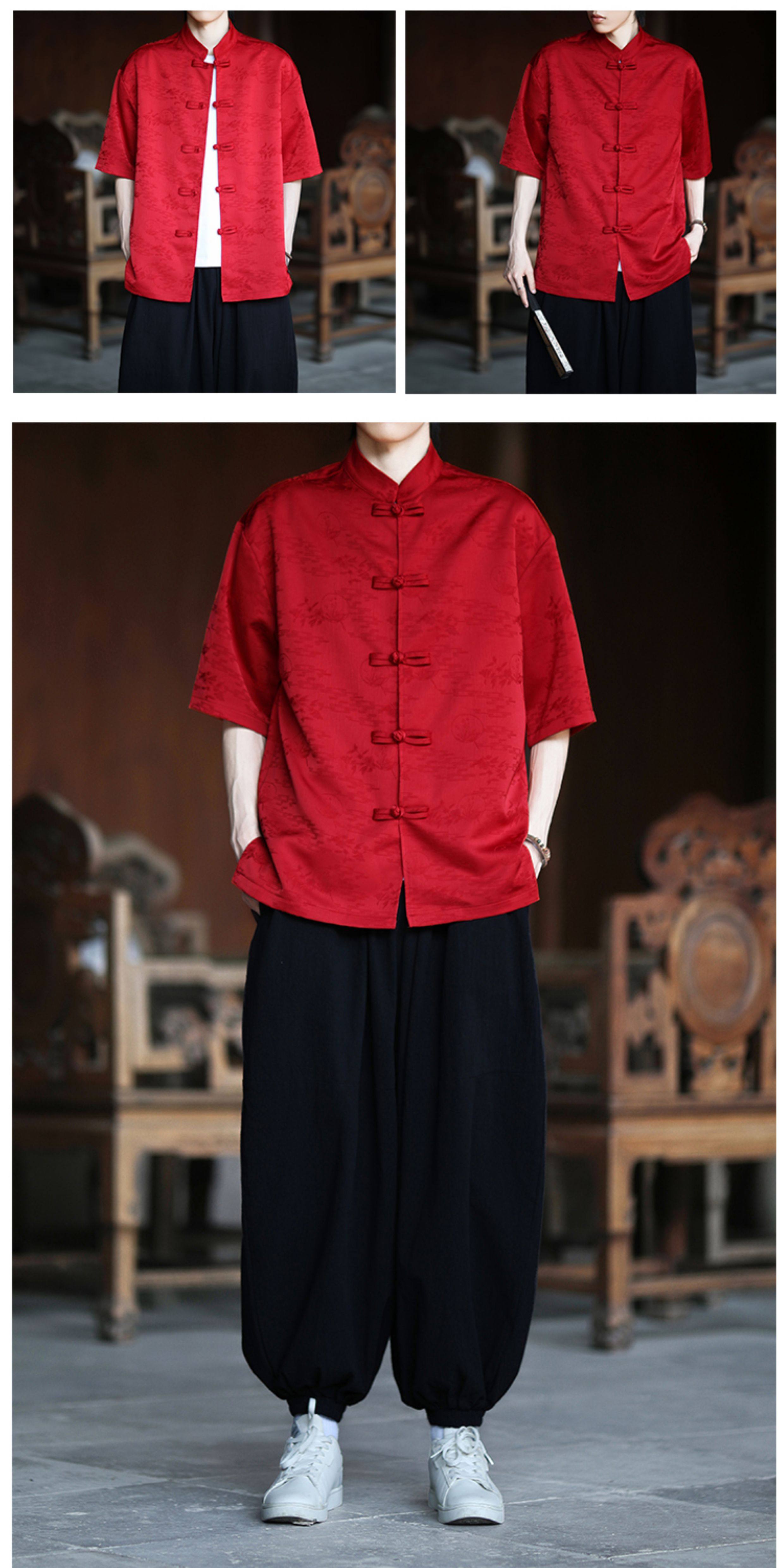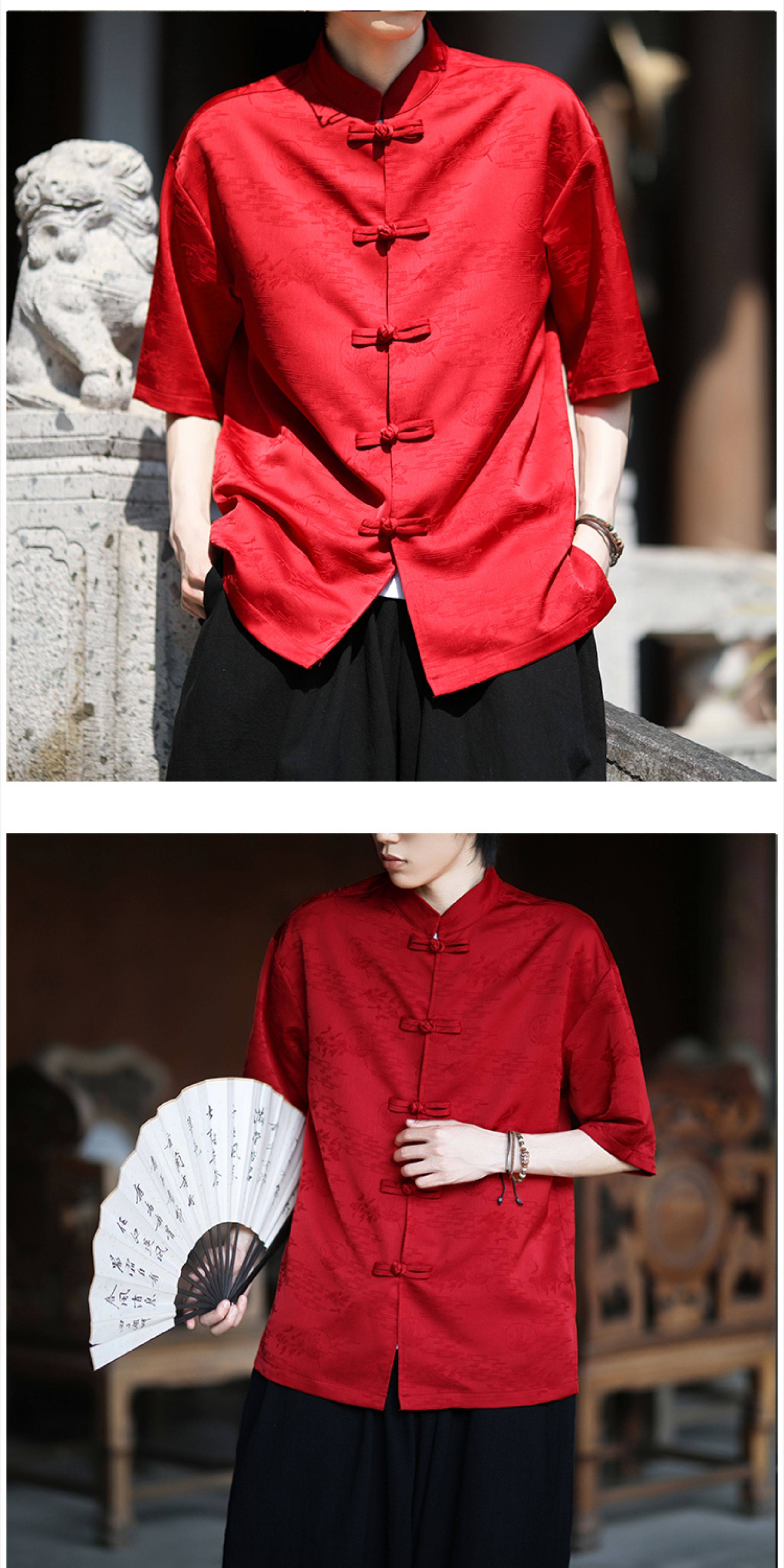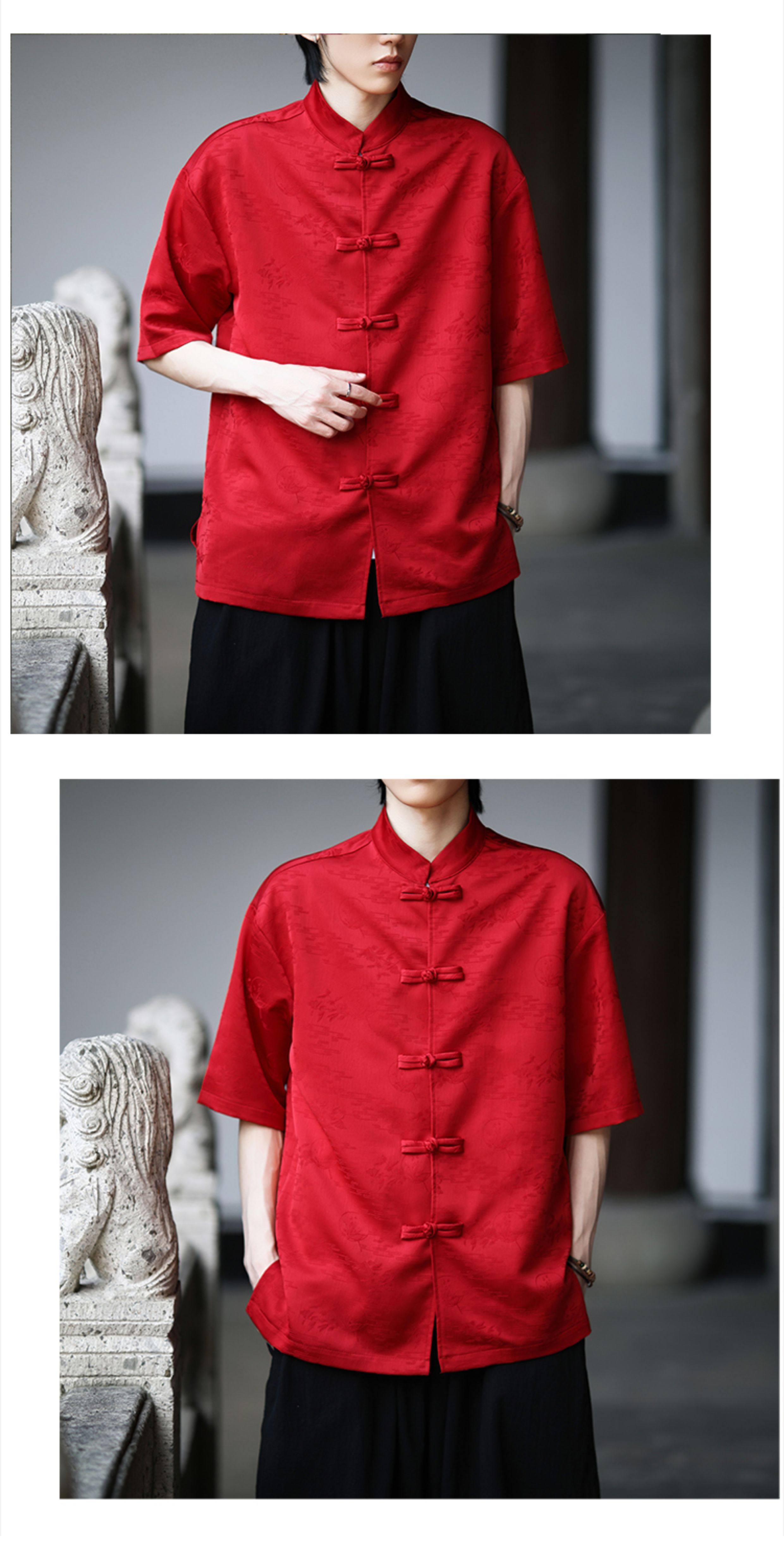 Chinese Style Summer New Red Button-Up Shirt for Wedding Groomsmen Performance, Large Size Tang Suit Hanfu Short-Sleeved Shirt Top