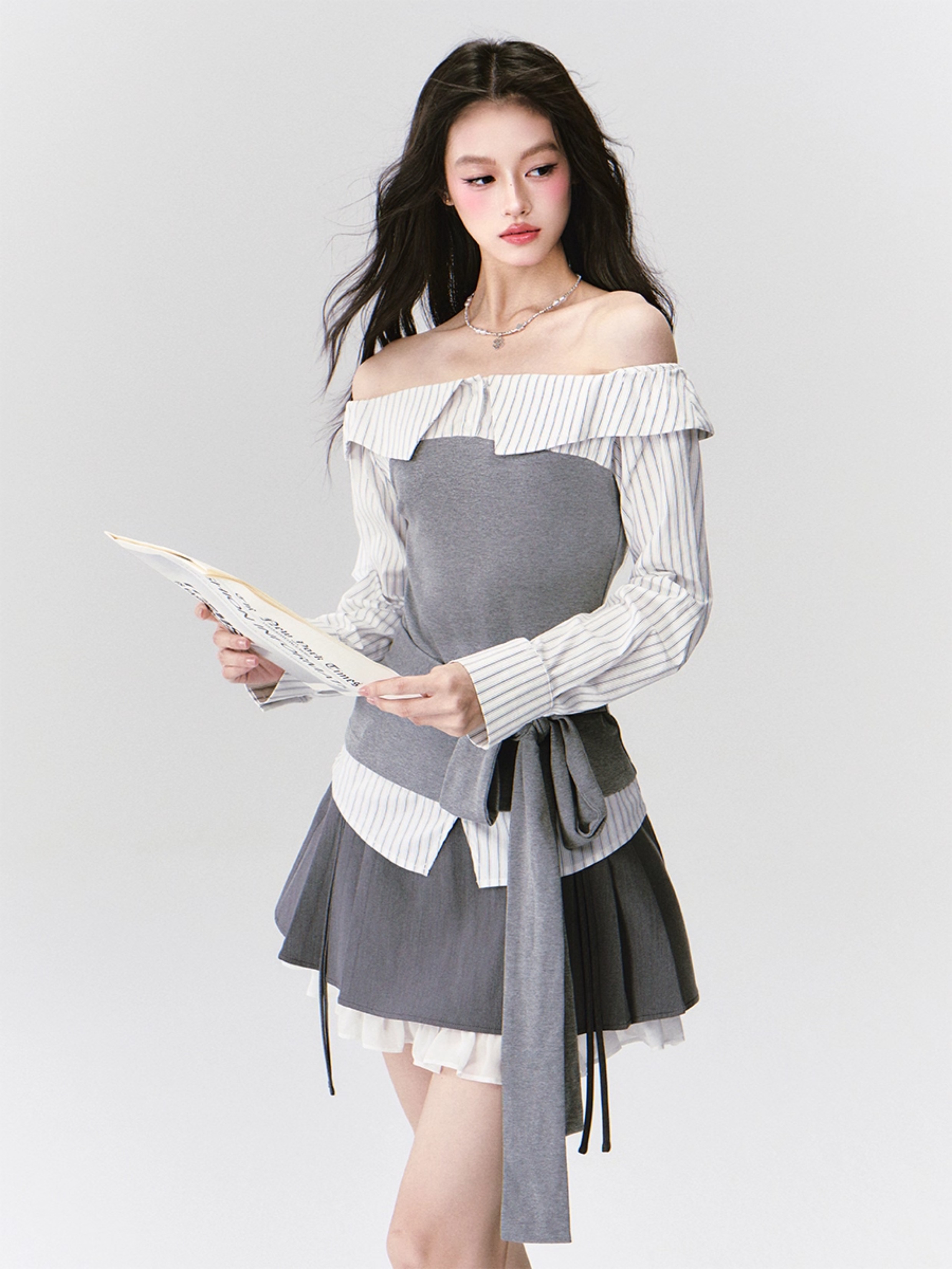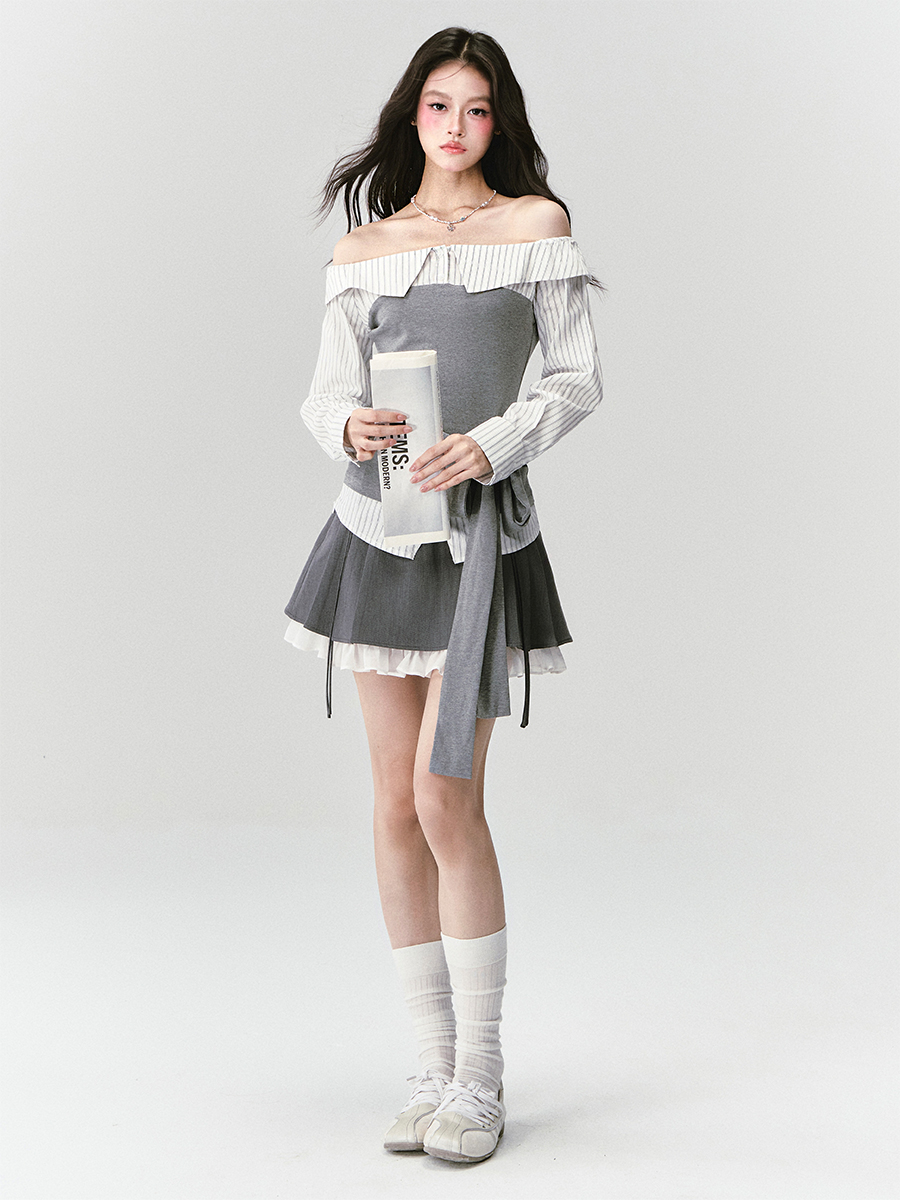 Fragileheart Fragile Store·Street Spring Letter Print Shirt Patchwork Off-Shoulder T-Shirt Tie-Up Top Short-Sleeve Autumn