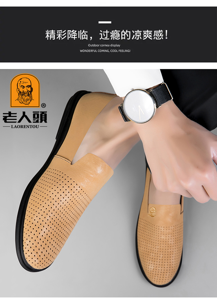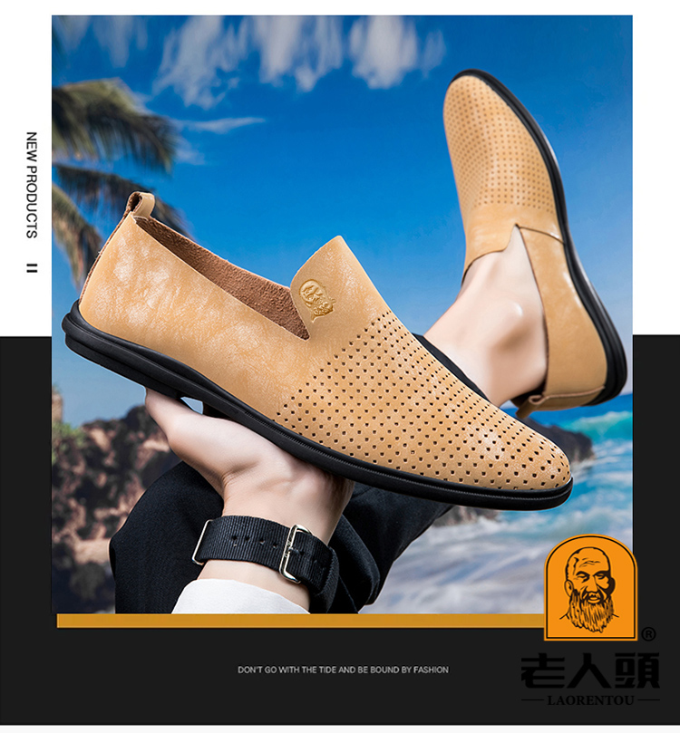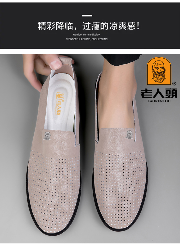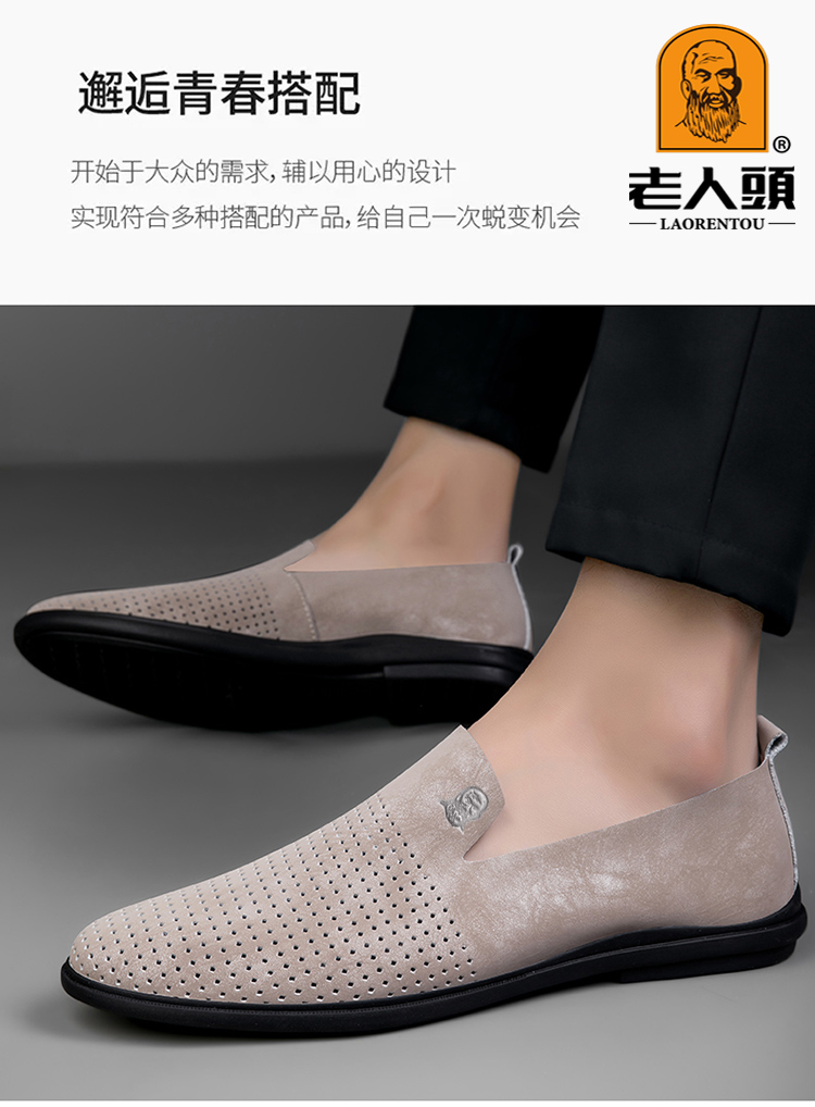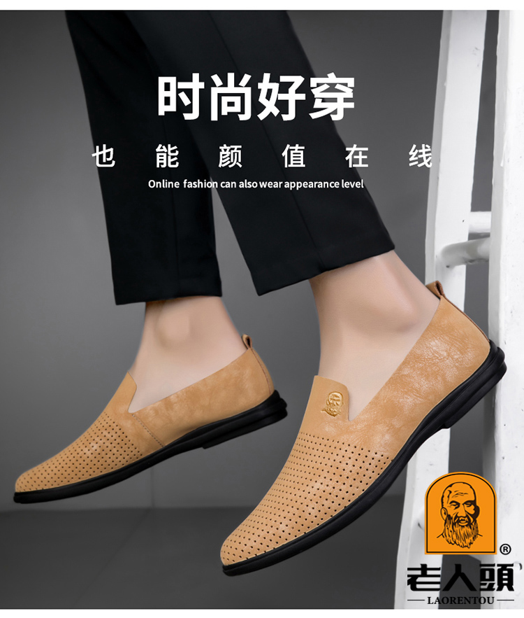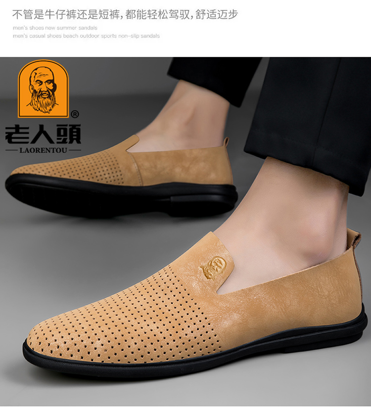 Men's Shoes for the Elderly, Summer Breathable Perforated Casual Leather Shoes, Fashionable Loafers, Slip-On Driving Shoes for Men