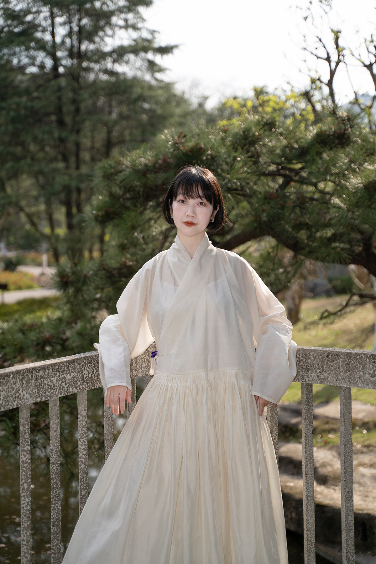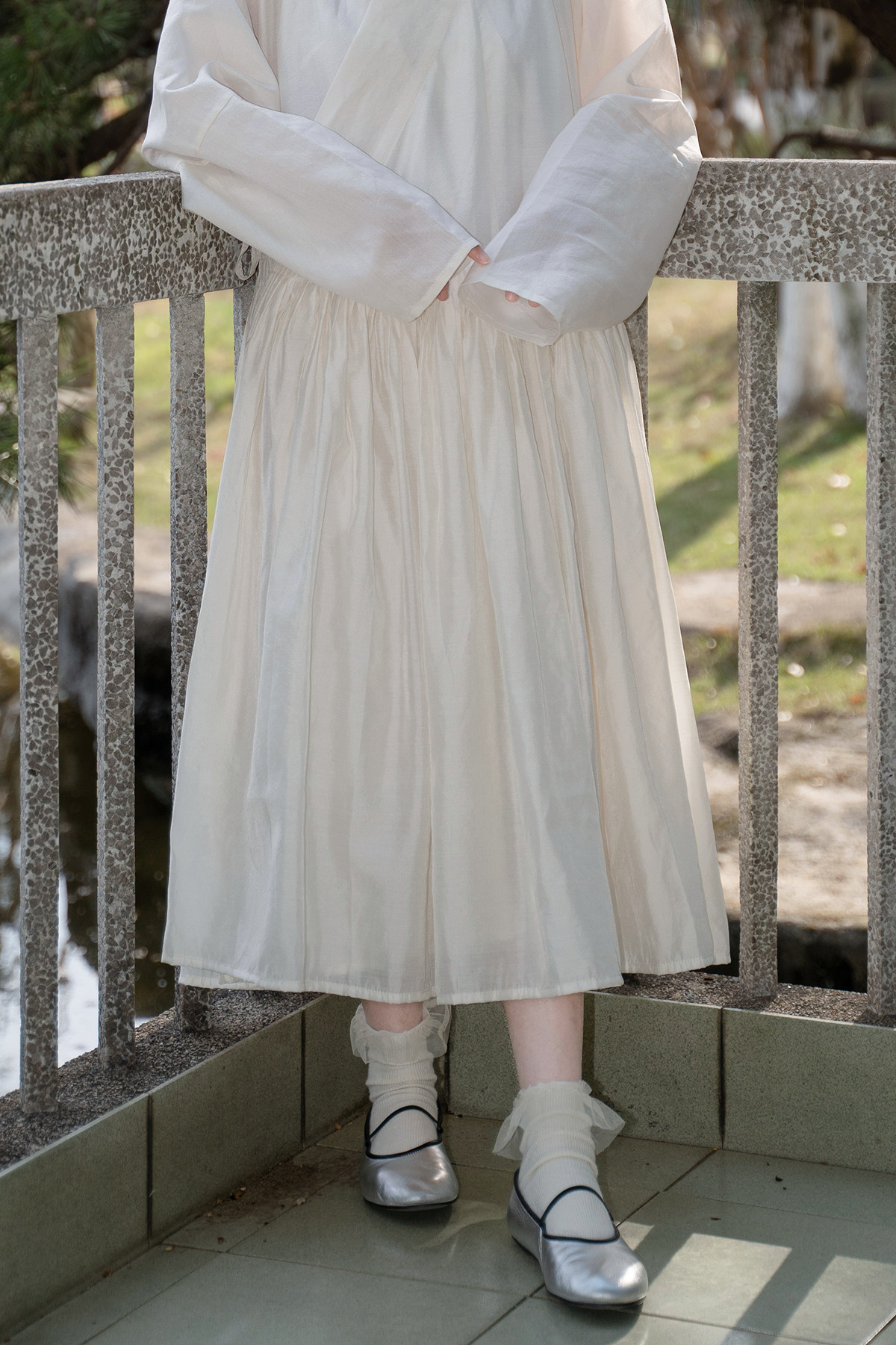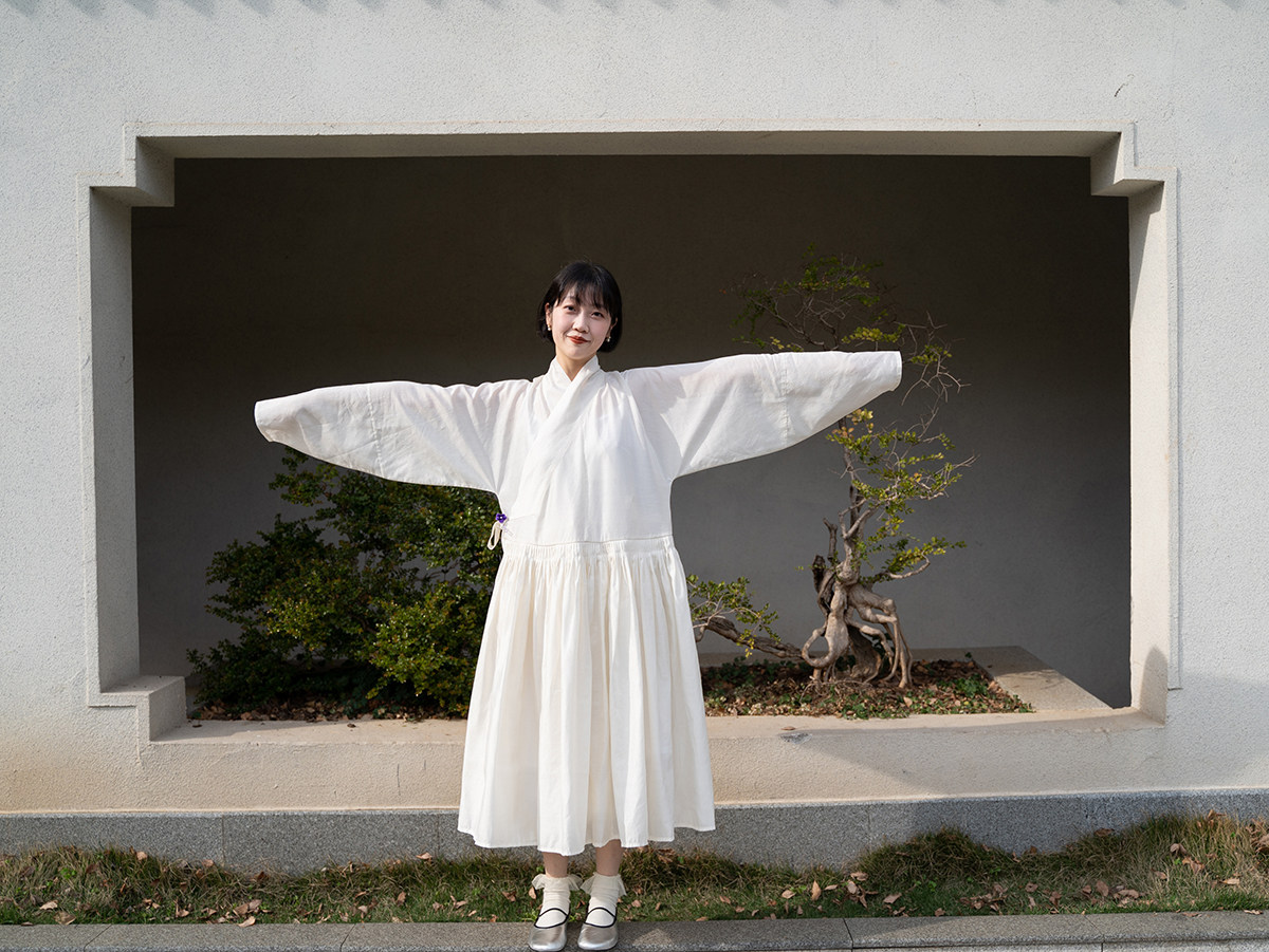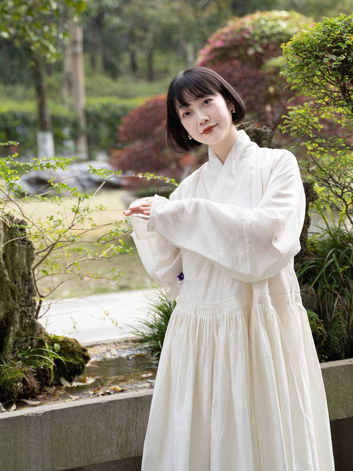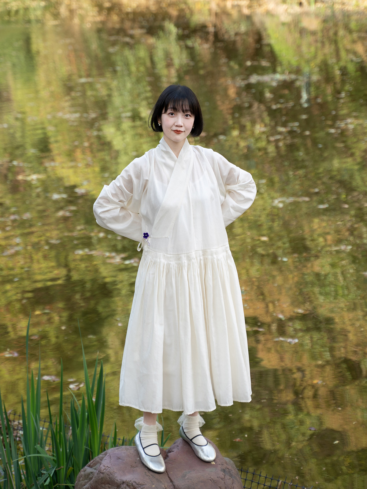 Sansastore Pearl White Silk Linen Lining Chinese Style Cross-Collar Dress Ming Dynasty Hanfu Horizontal Collar