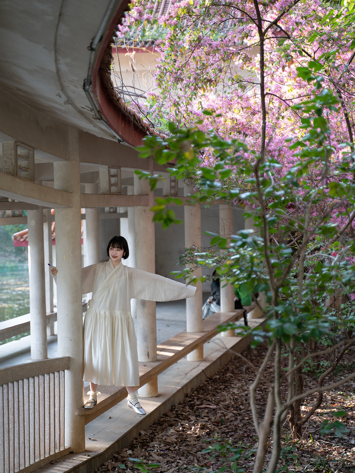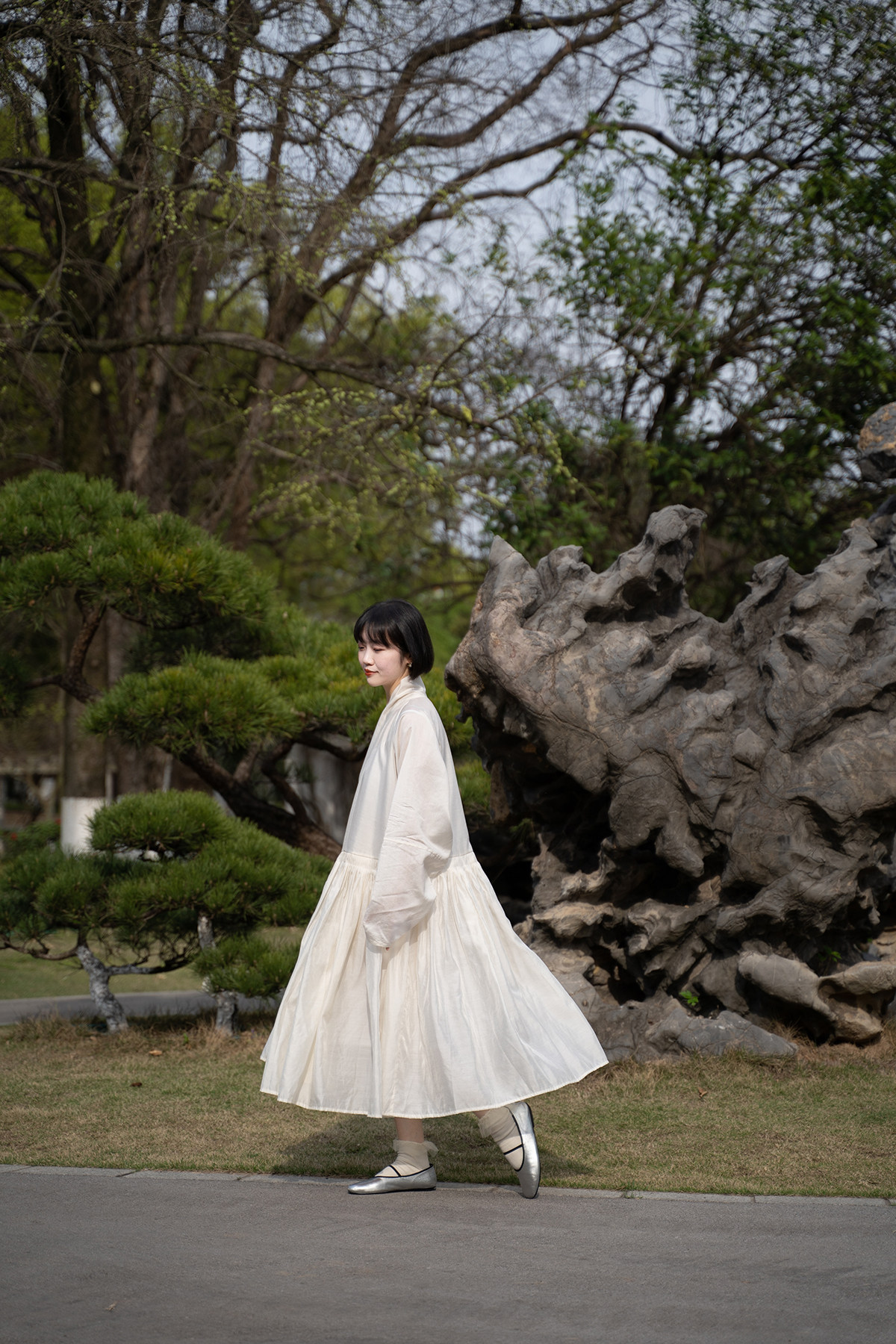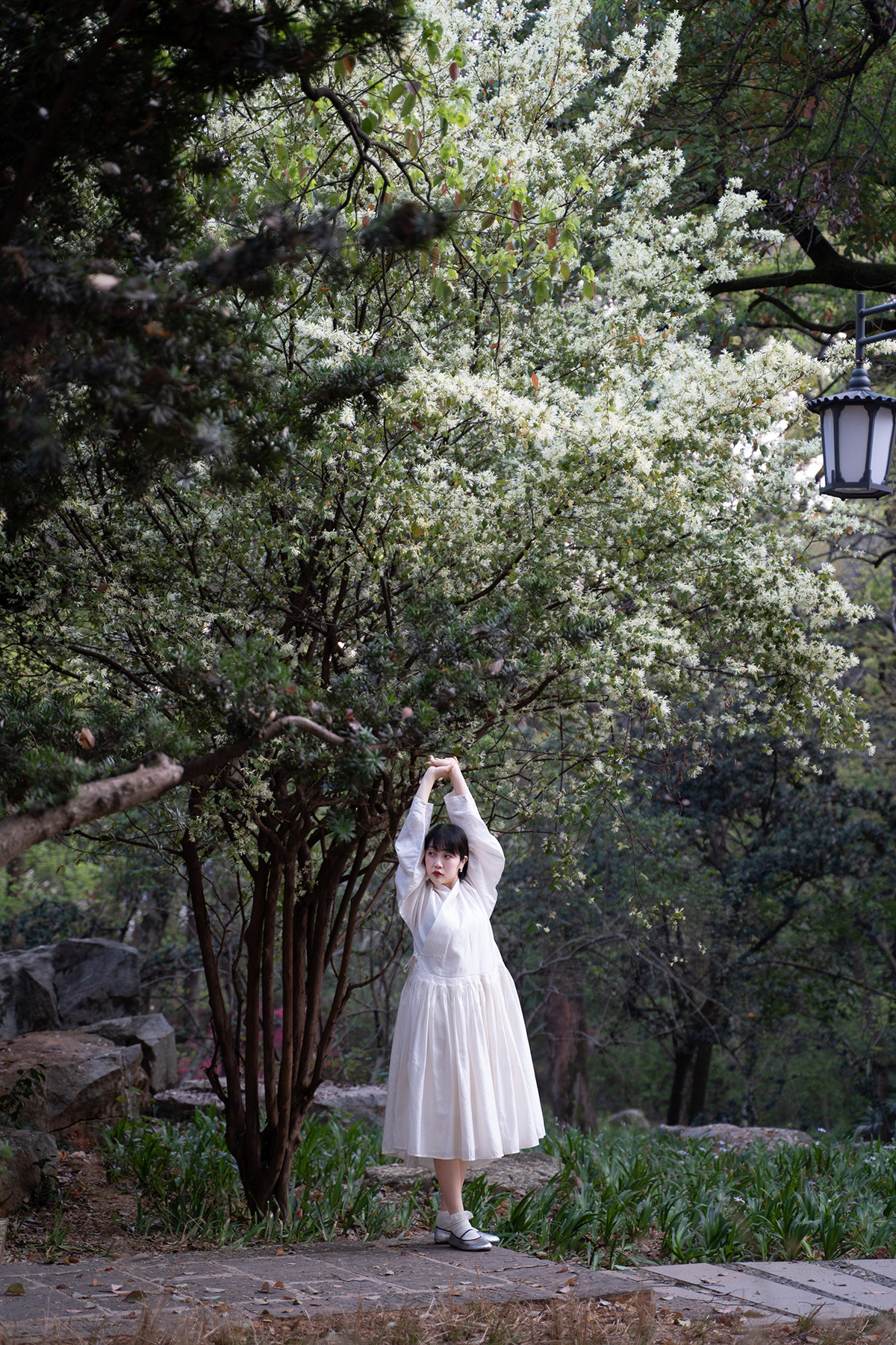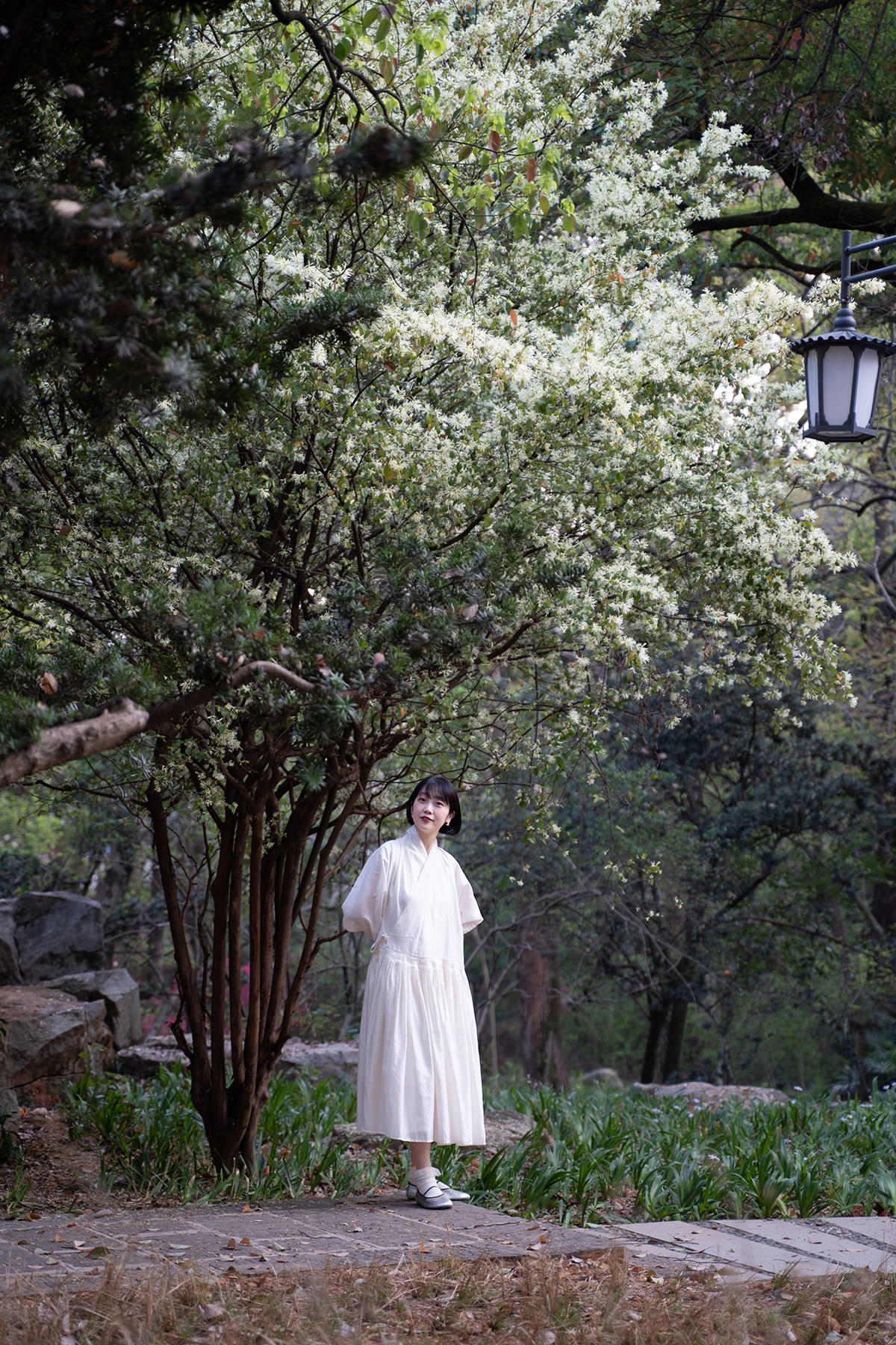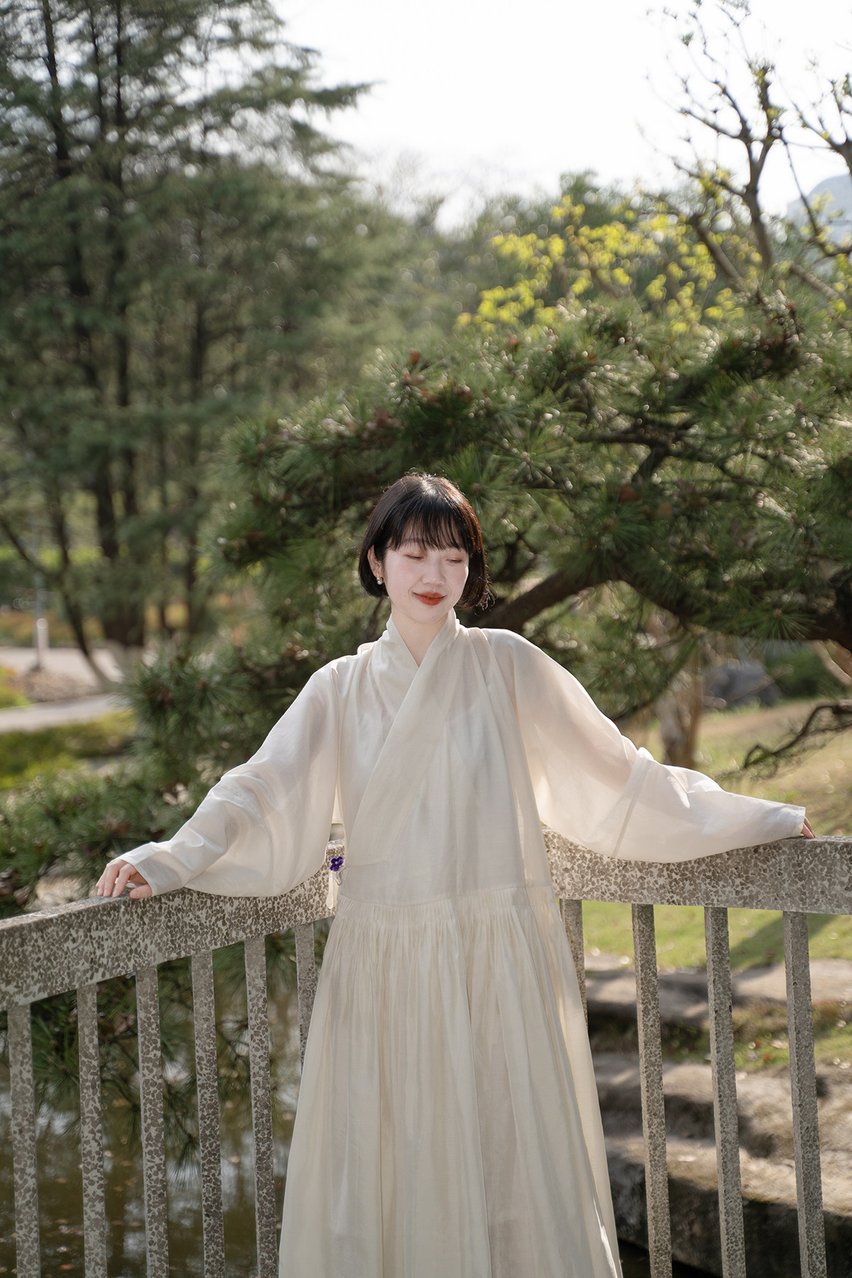 Sansastore Pearl White Silk Linen Lining Chinese Style Cross-Collar Dress Ming Dynasty Hanfu Horizontal Collar