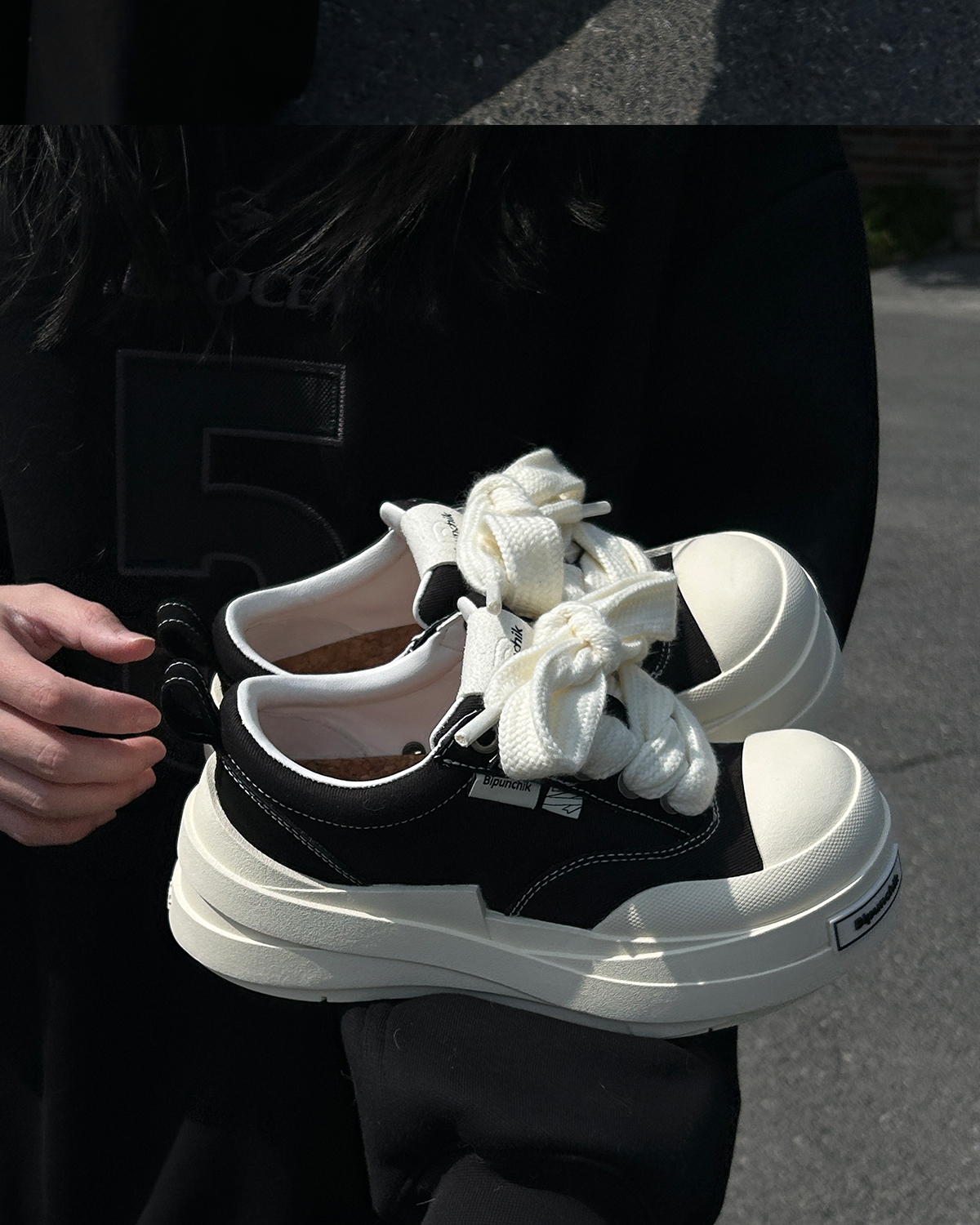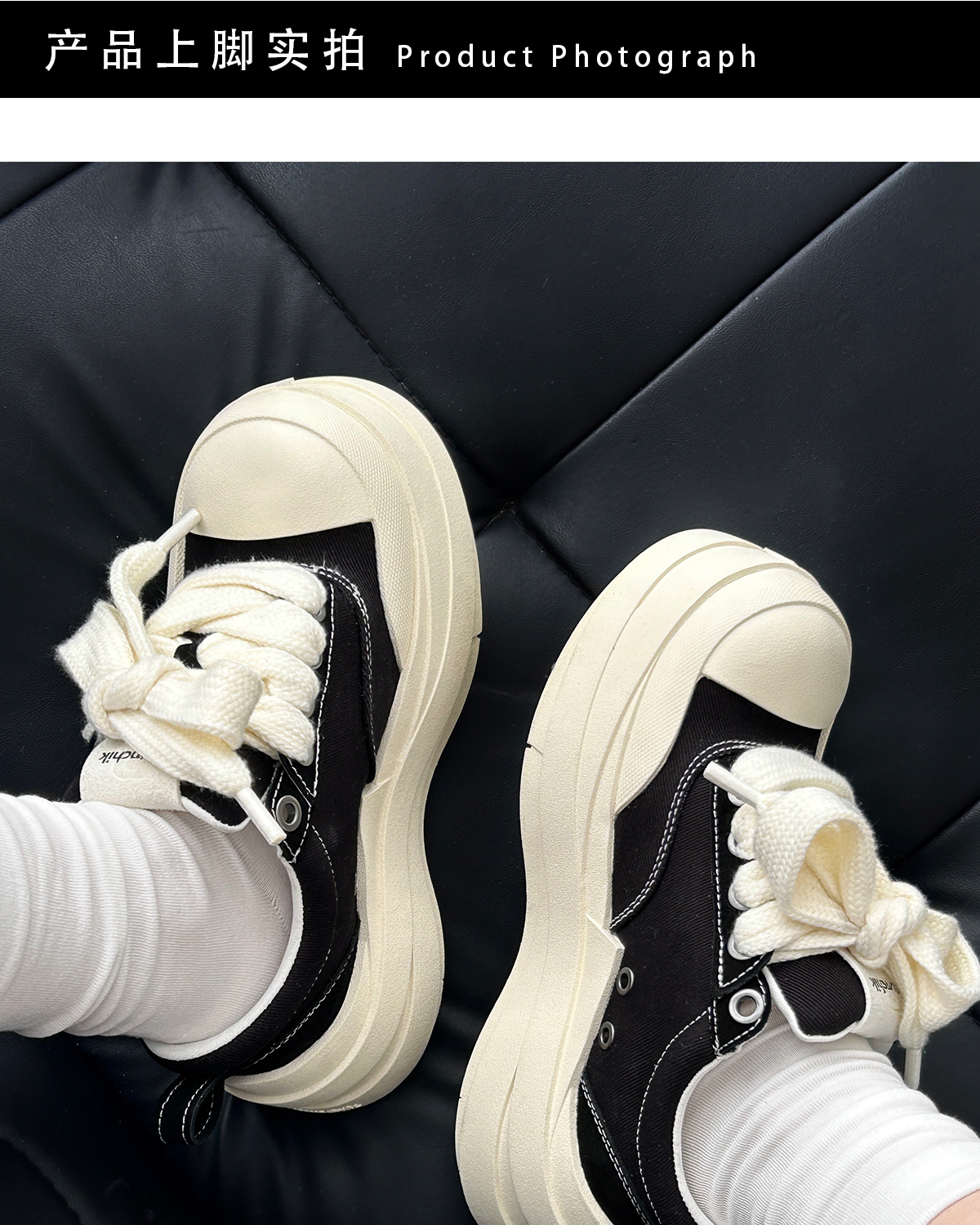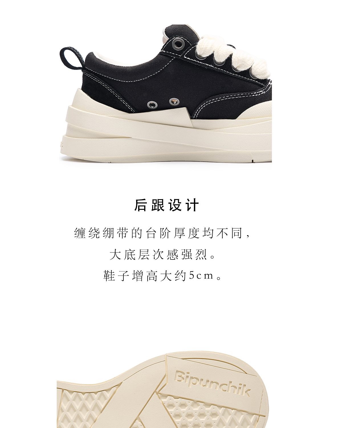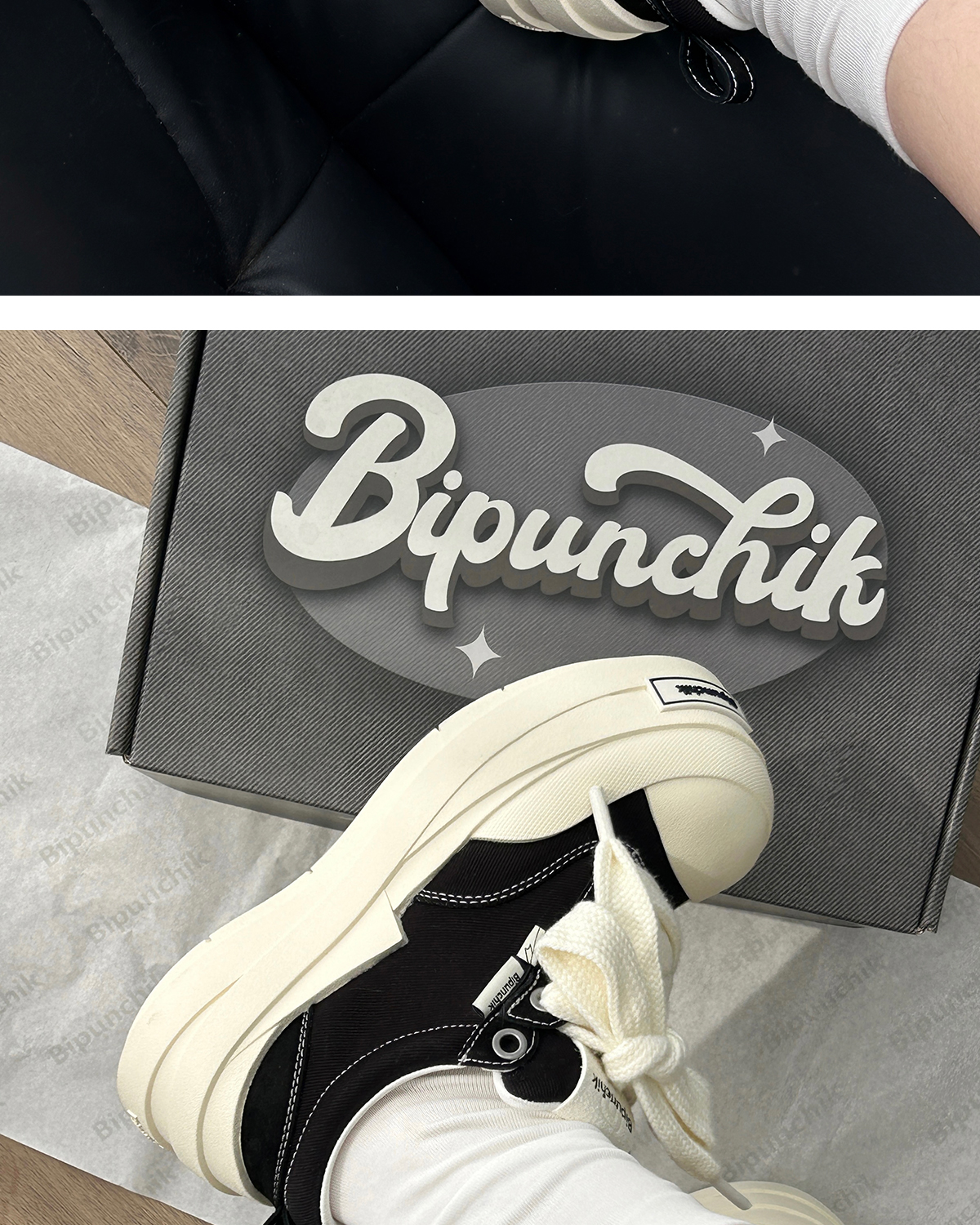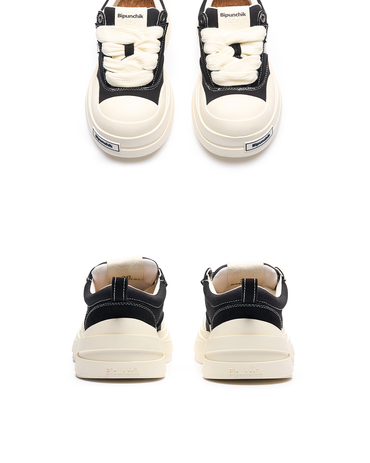 Bipunchik Black Basic Bandage Canvas Chunky Shoes Unisex Height-Increasing Thick-Soled Sneakers for Spring and Summer