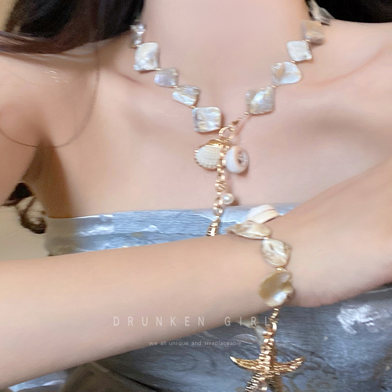 Island Vacation Shell and Starfish Necklace for Women, Autumn and Winter Seaside Travel Long Accessory, Atmospheric and Exaggerated Sweater Chain