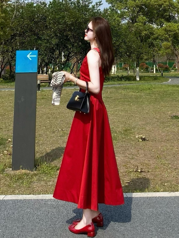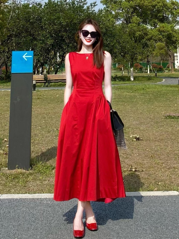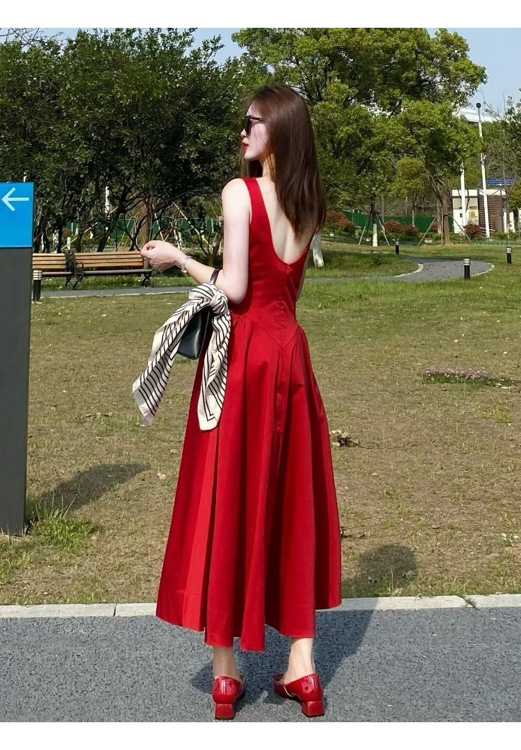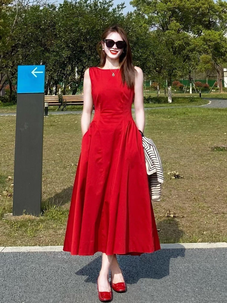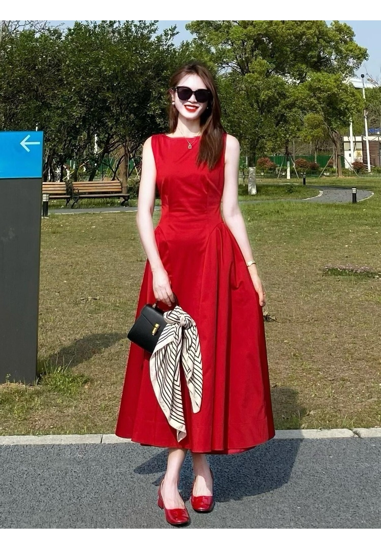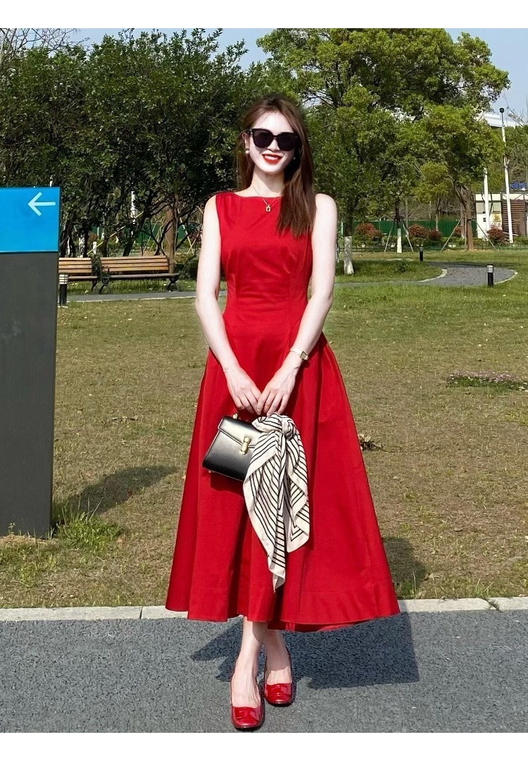 French-Style Stunning Retro Red Sleeveless Vest Dress for Women, New Summer Model, Age-Reducing, Powerful Aura, Waist-Cinching Dress