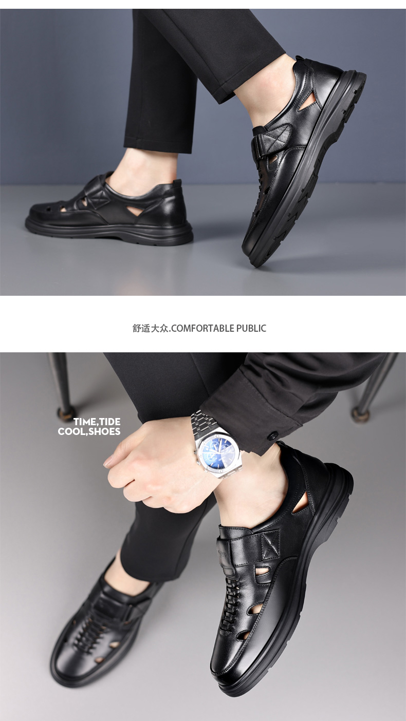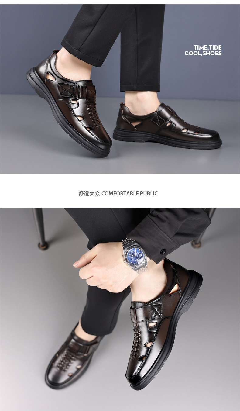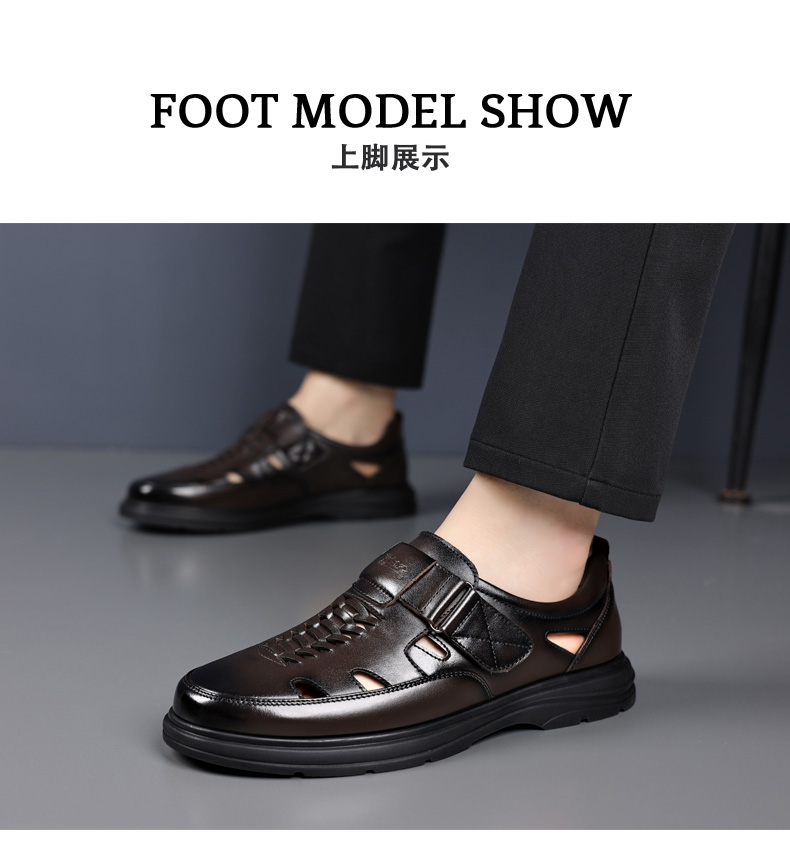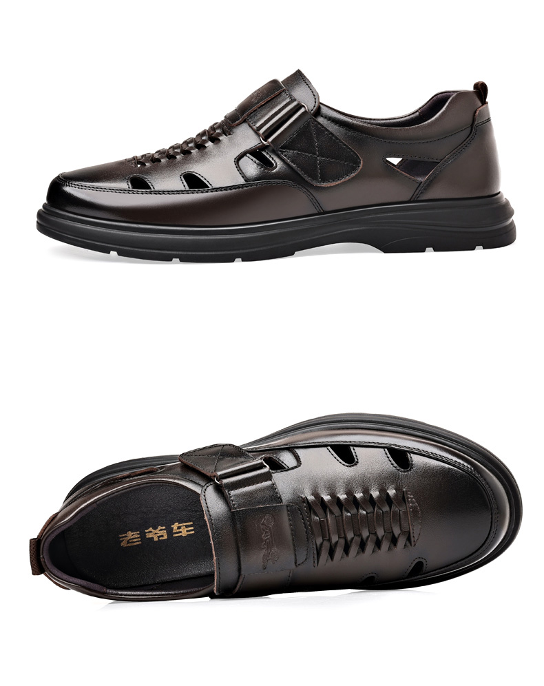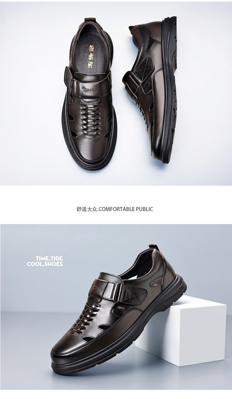 Vintage Leather Sandals for Men, Genuine Leather, Breathable, Summer Hollow Leather Shoes, Clogs, Soft Sole, Middle-Aged Dad Shoes
