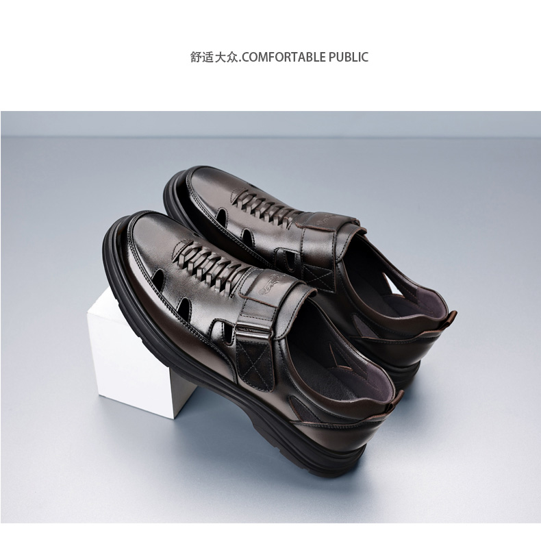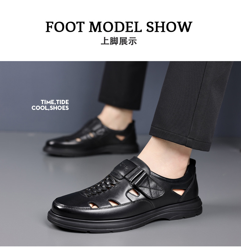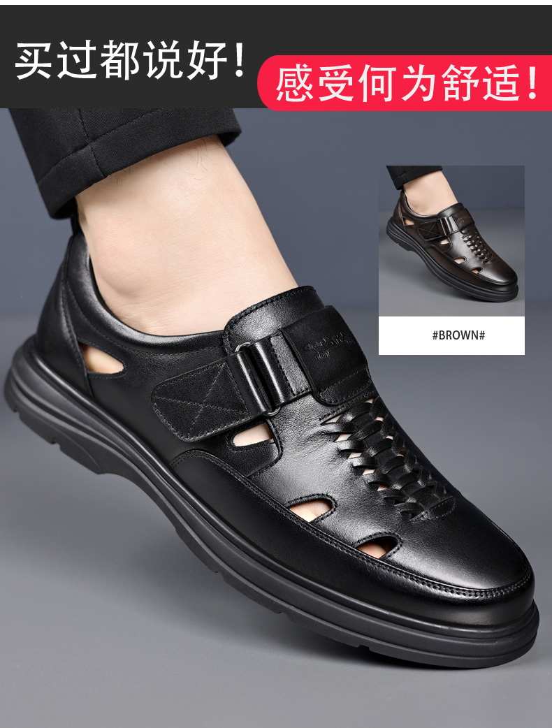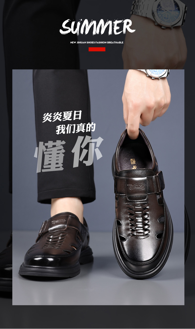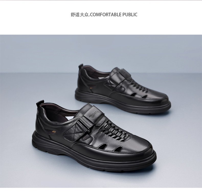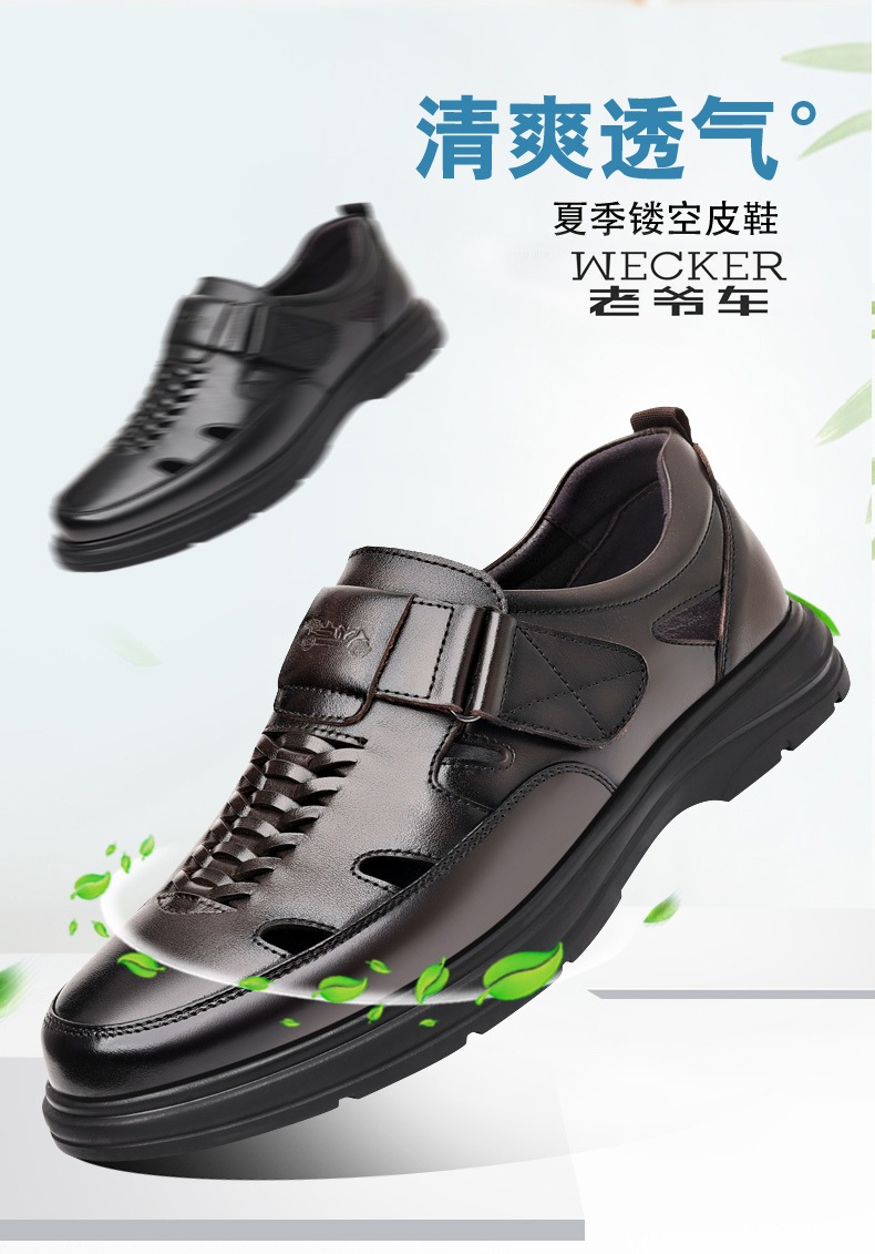 Vintage Leather Sandals for Men, Genuine Leather, Breathable, Summer Hollow Leather Shoes, Clogs, Soft Sole, Middle-Aged Dad Shoes