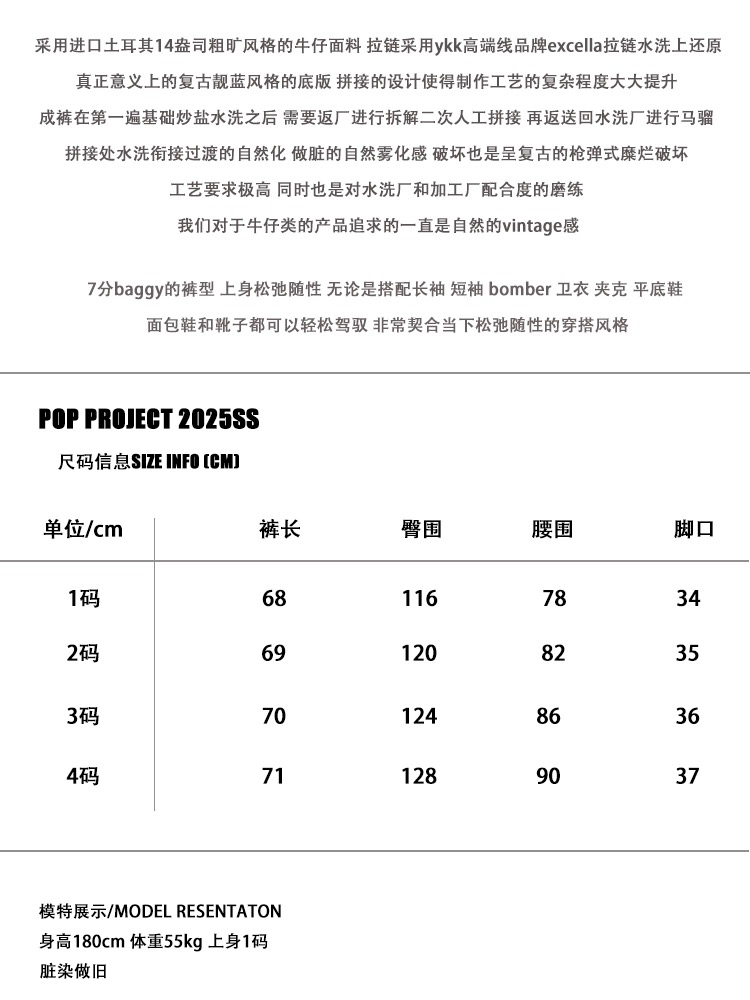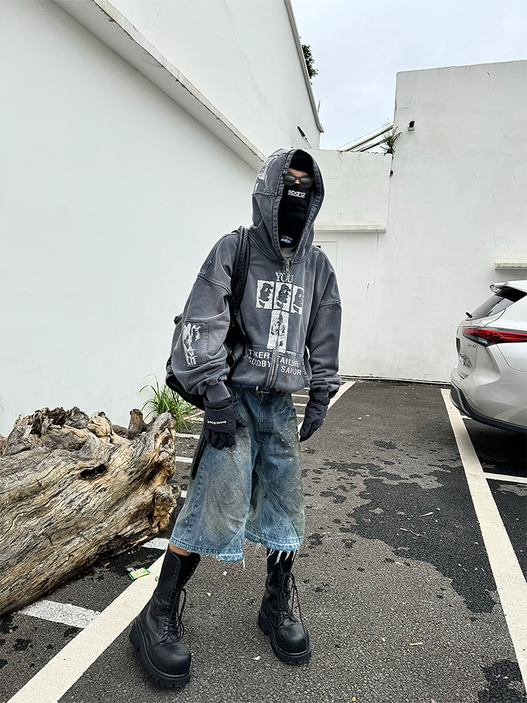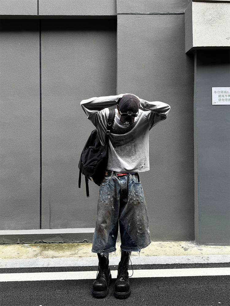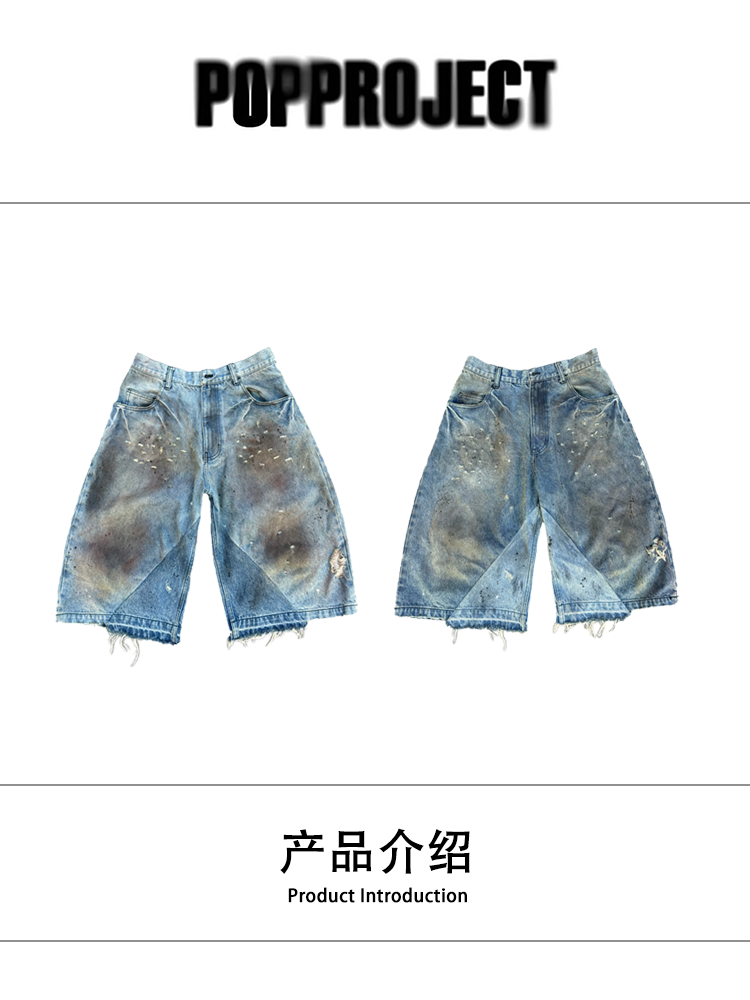 Popproject Turkish Imported Denim Patchwork Washed Distressed Dirty-Dyed Vintage 7/8 Pants Shorts