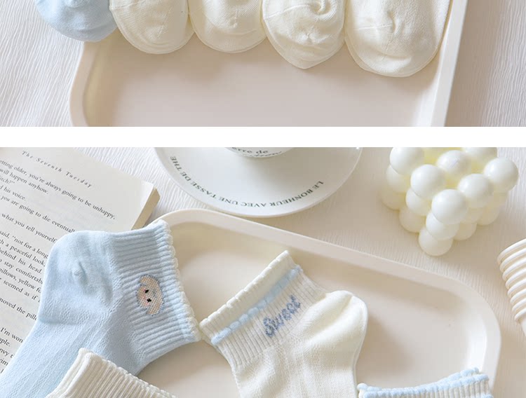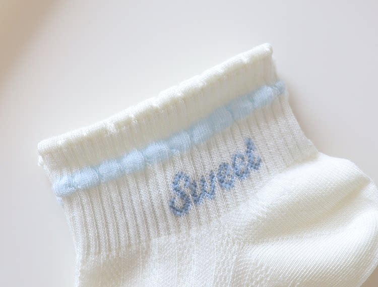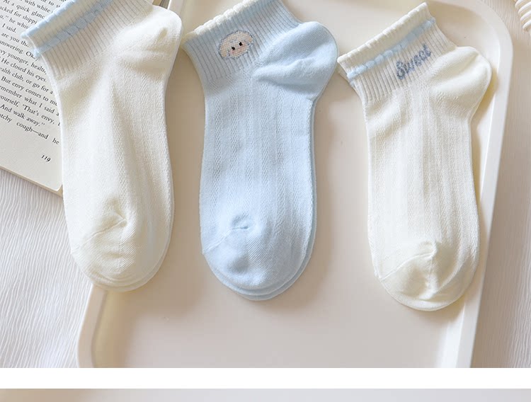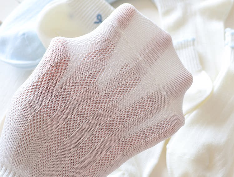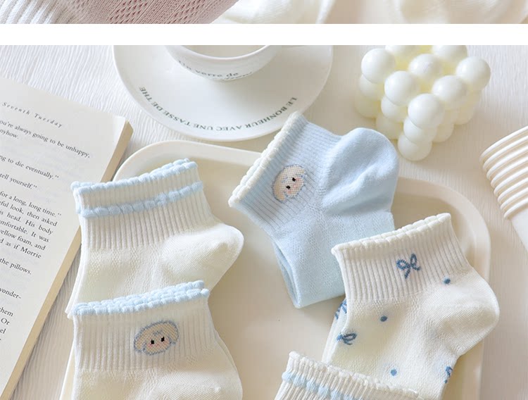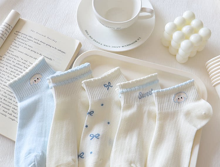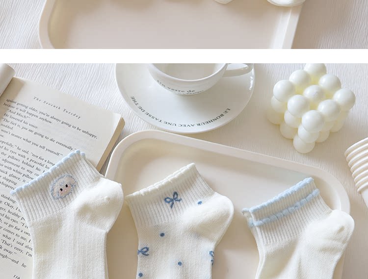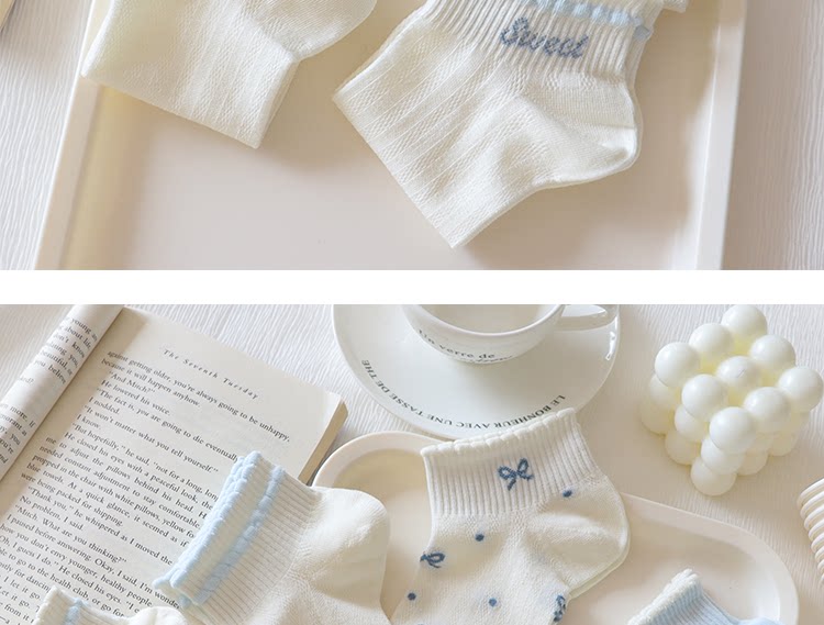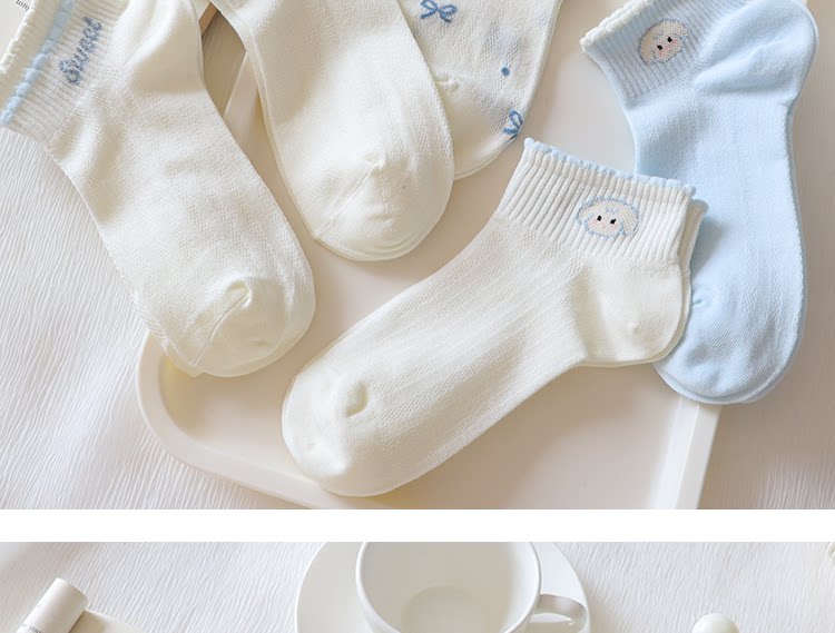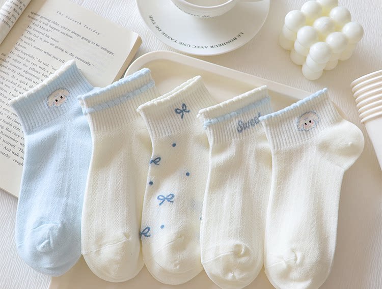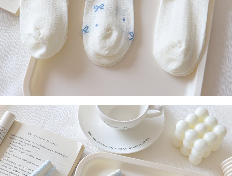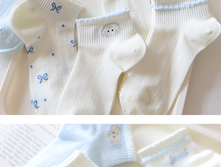 Light Blue Bowknot Mesh Socks for Women, Short Socks, Summer Thin Pure Cotton Breathable Milk White Low-Cut Boat Socks, Sweet Japanese Style